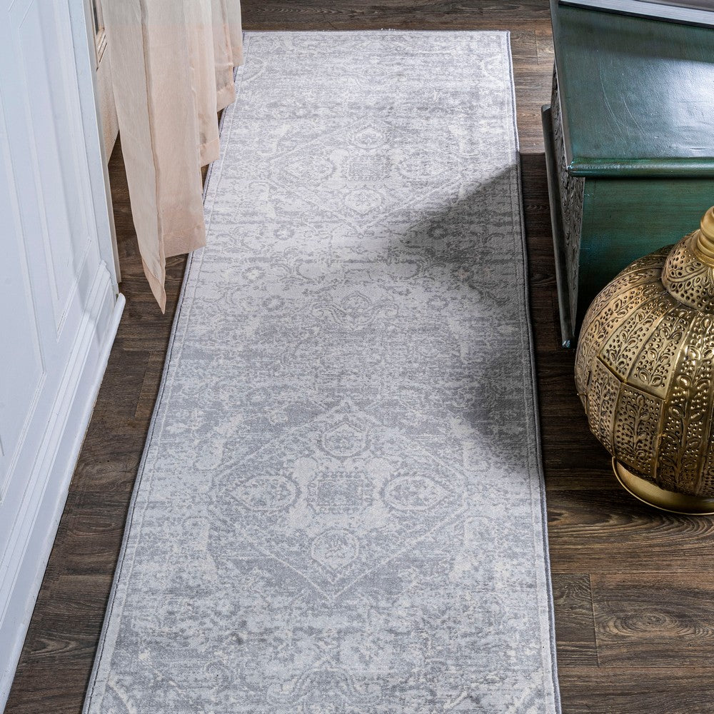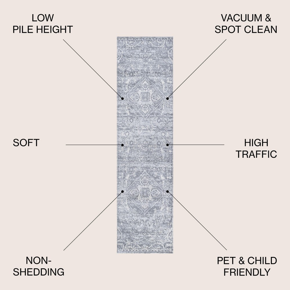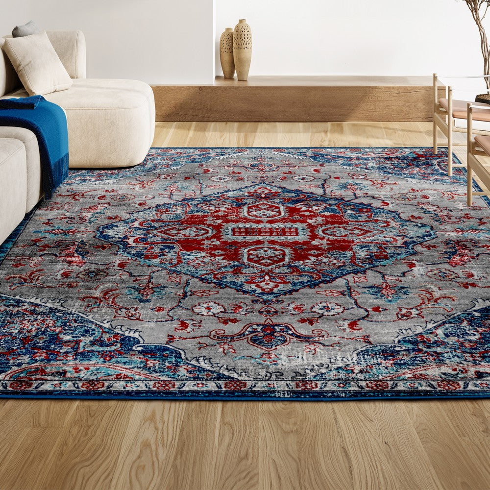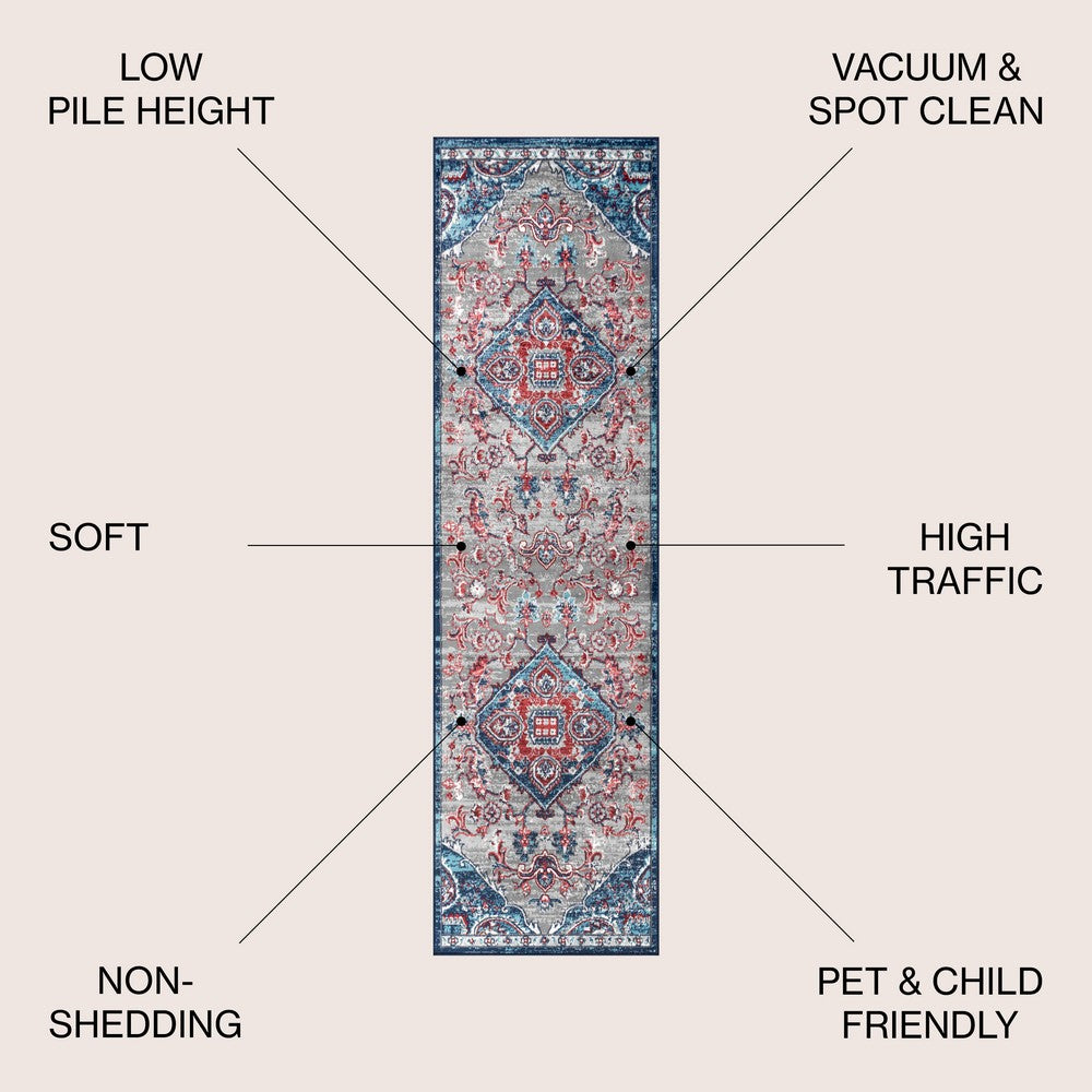 - Combining tones of gray, pink, red, and blue, this rug is a versatile addition to any color scheme