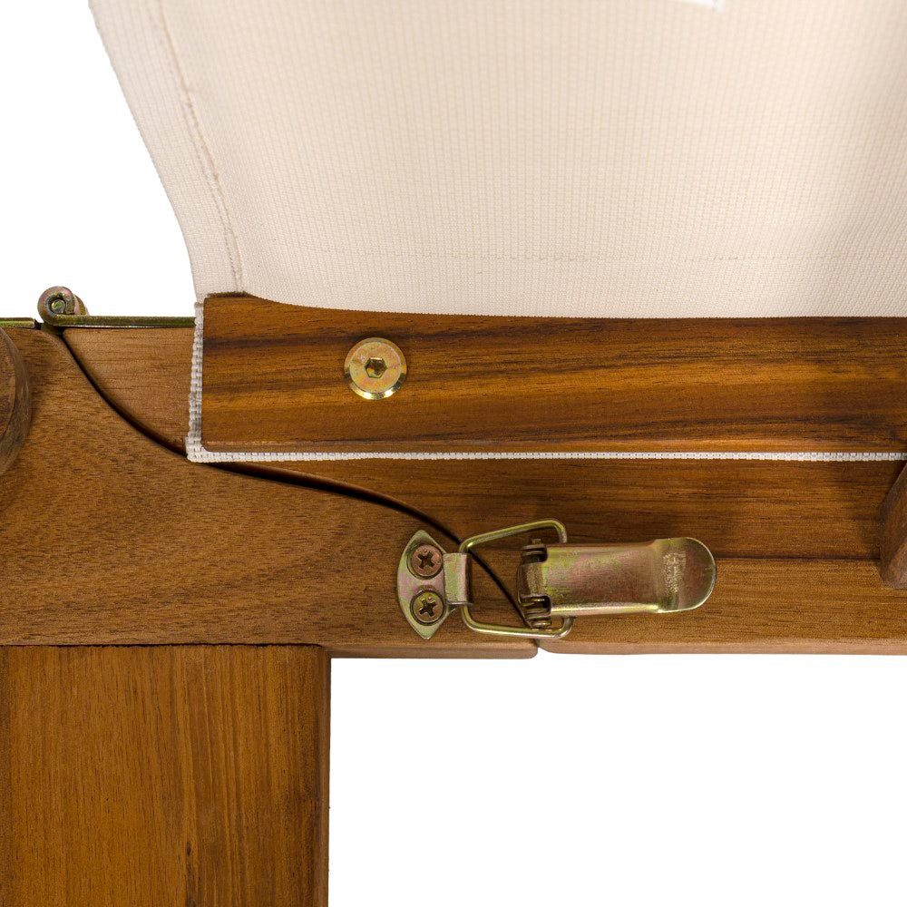 • Solid wood is treated with a teak oil finish for a natural wood look; fabric is outdoor textile mesh in ecru