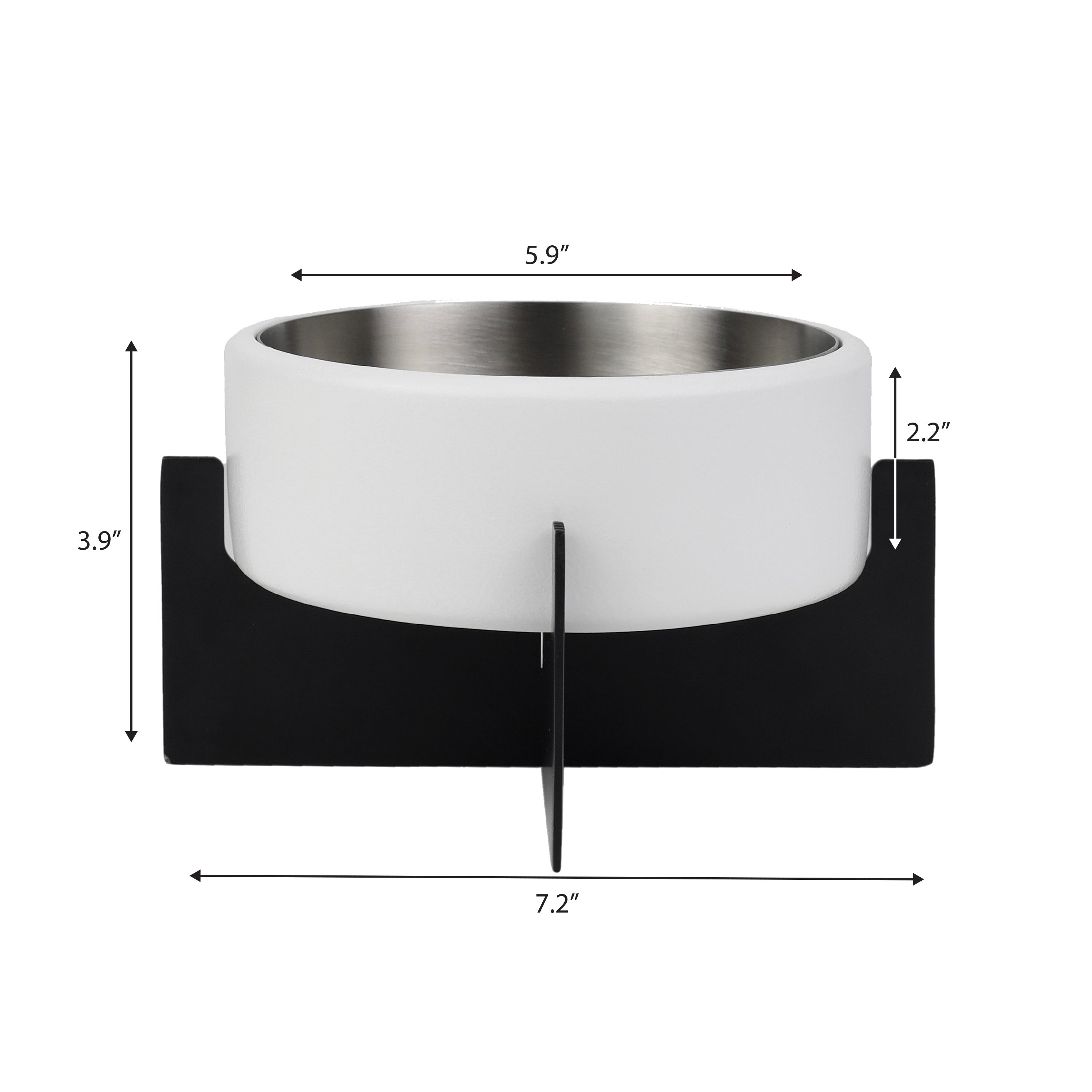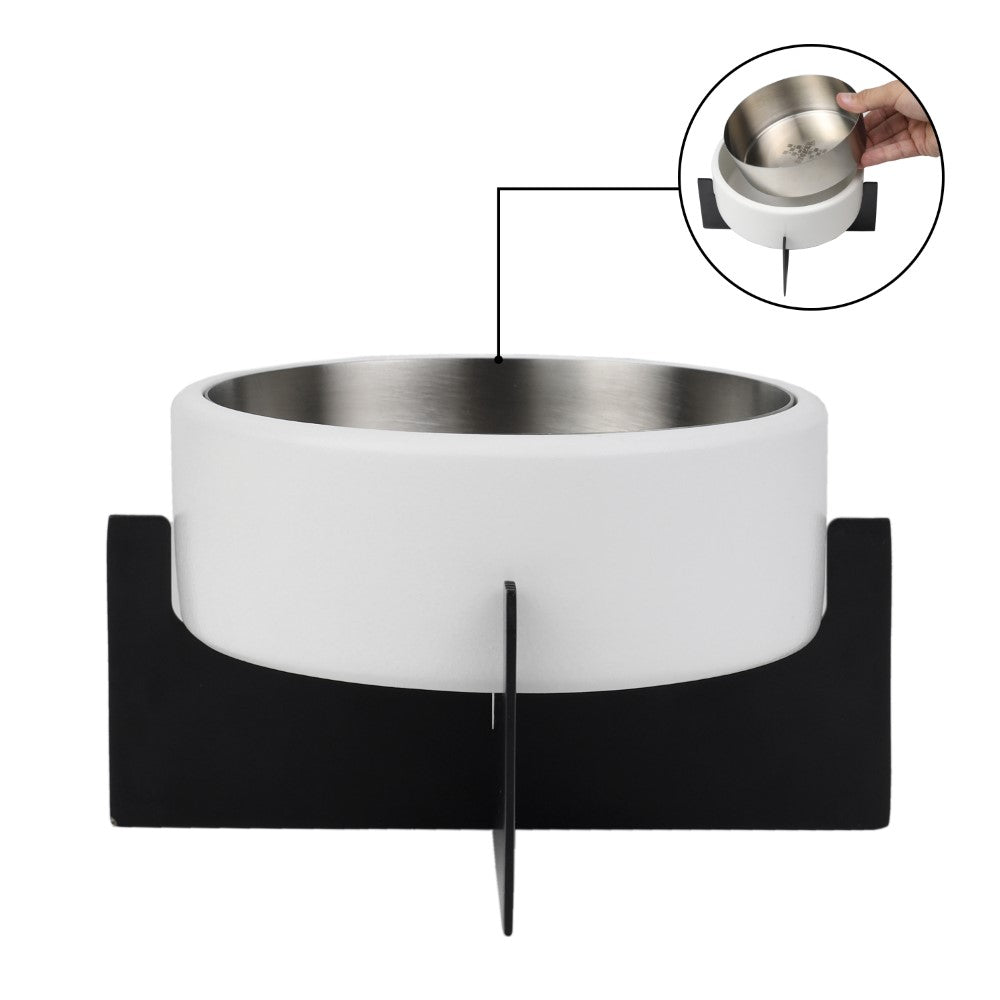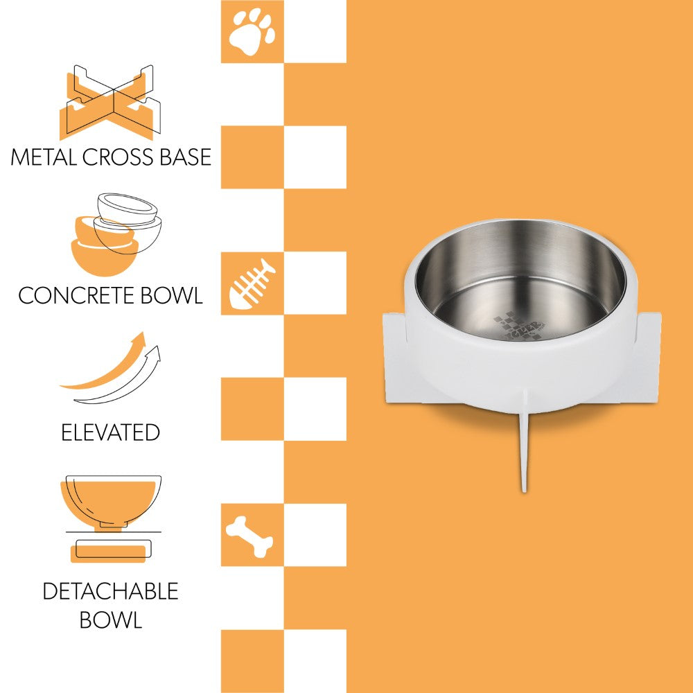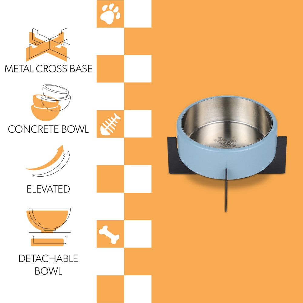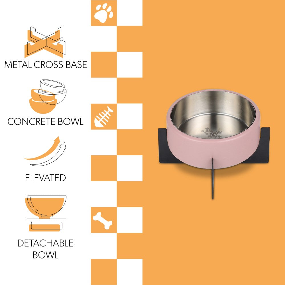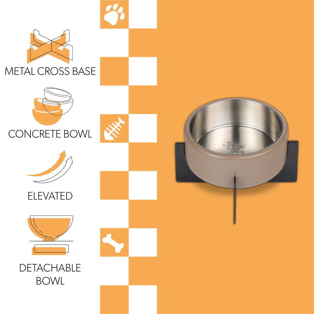 This elevated pet bowl combines sleek design with sturdy craftsmanship for a refined feeding solution. The solid concrete body provides weight and stability, while the modern metal cross base ensures an elevated position for comfort during mealtime. A detachable stainless steel bowl makes cleaning simple, while the thoughtful design balances functionality with a modern aesthetic.