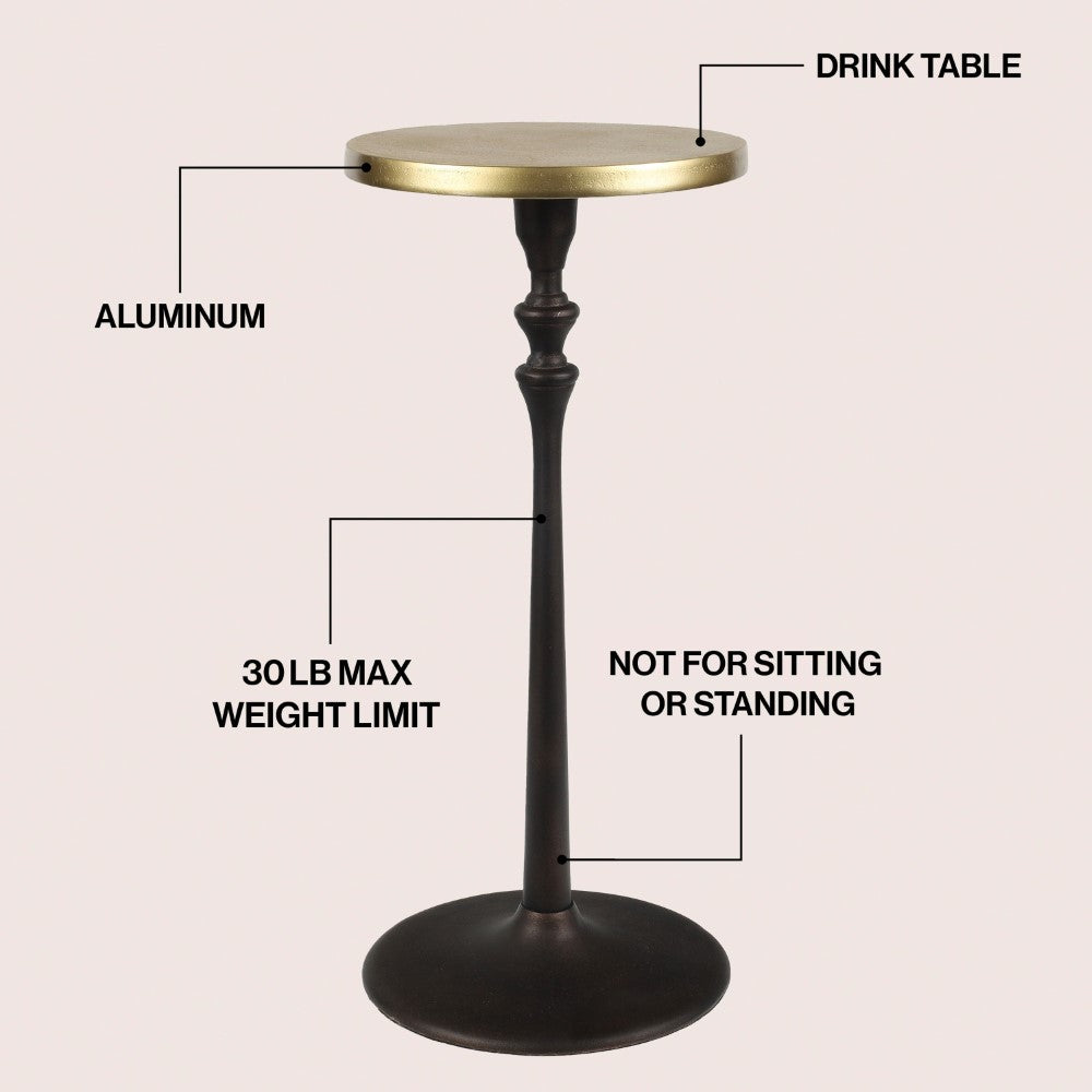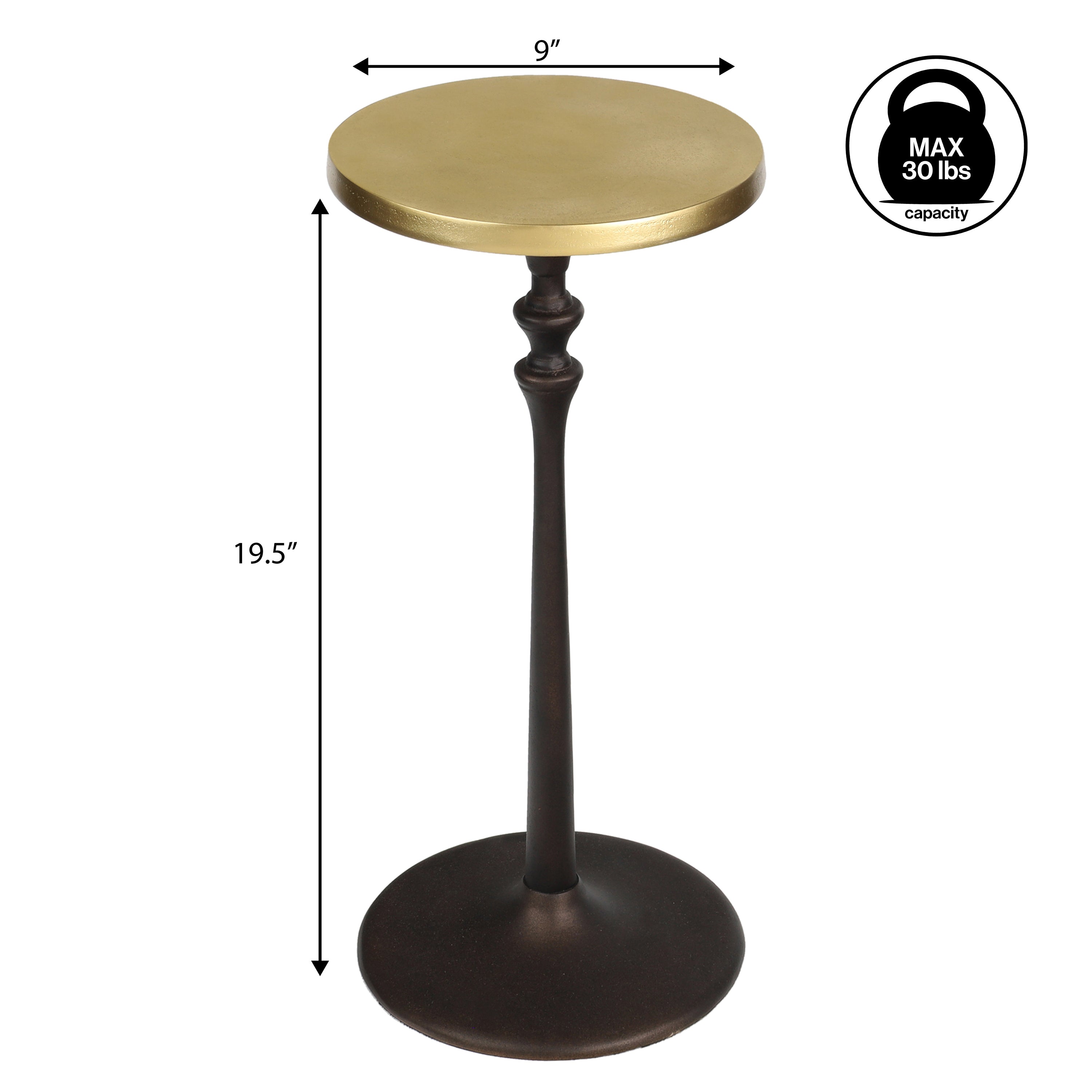 This pedestal accent table features a bold contrast between a metallic top and a sculpted base, creating a striking design statement. The round surface offers a convenient spot for drinks or décor, while the slender pedestal ensures stability with an elegant profile. Ideal for living spaces, entryways, or lounges, this table blends functionality with timeless style.