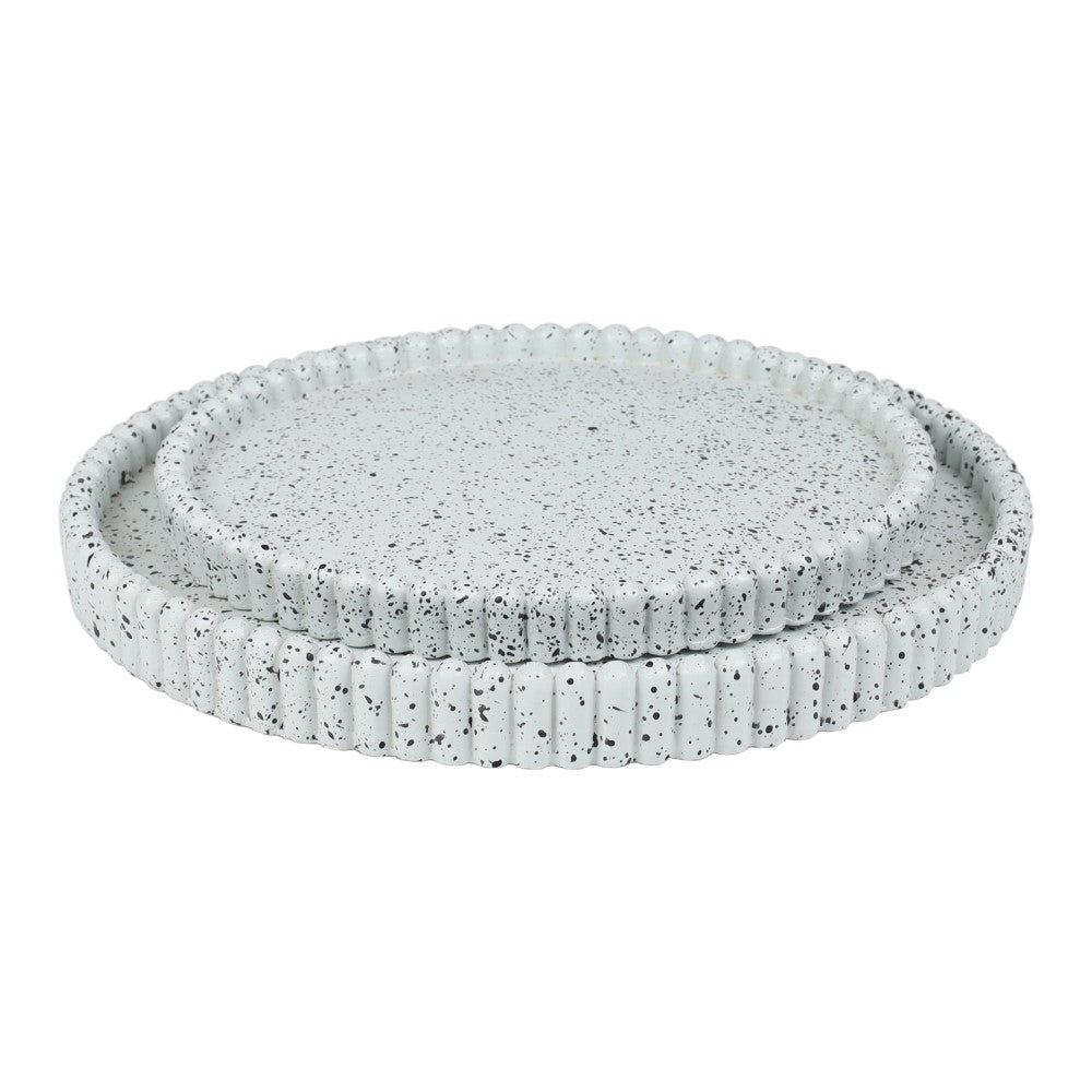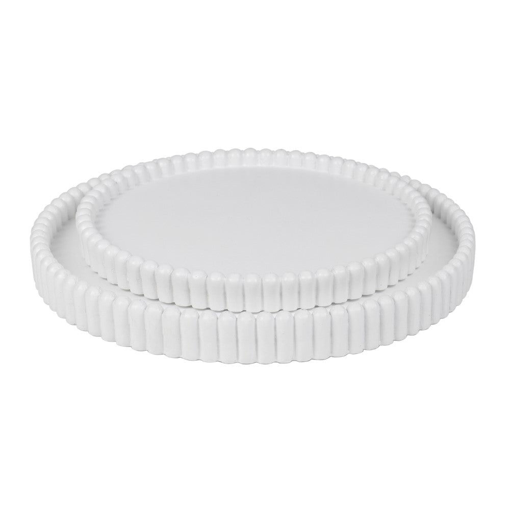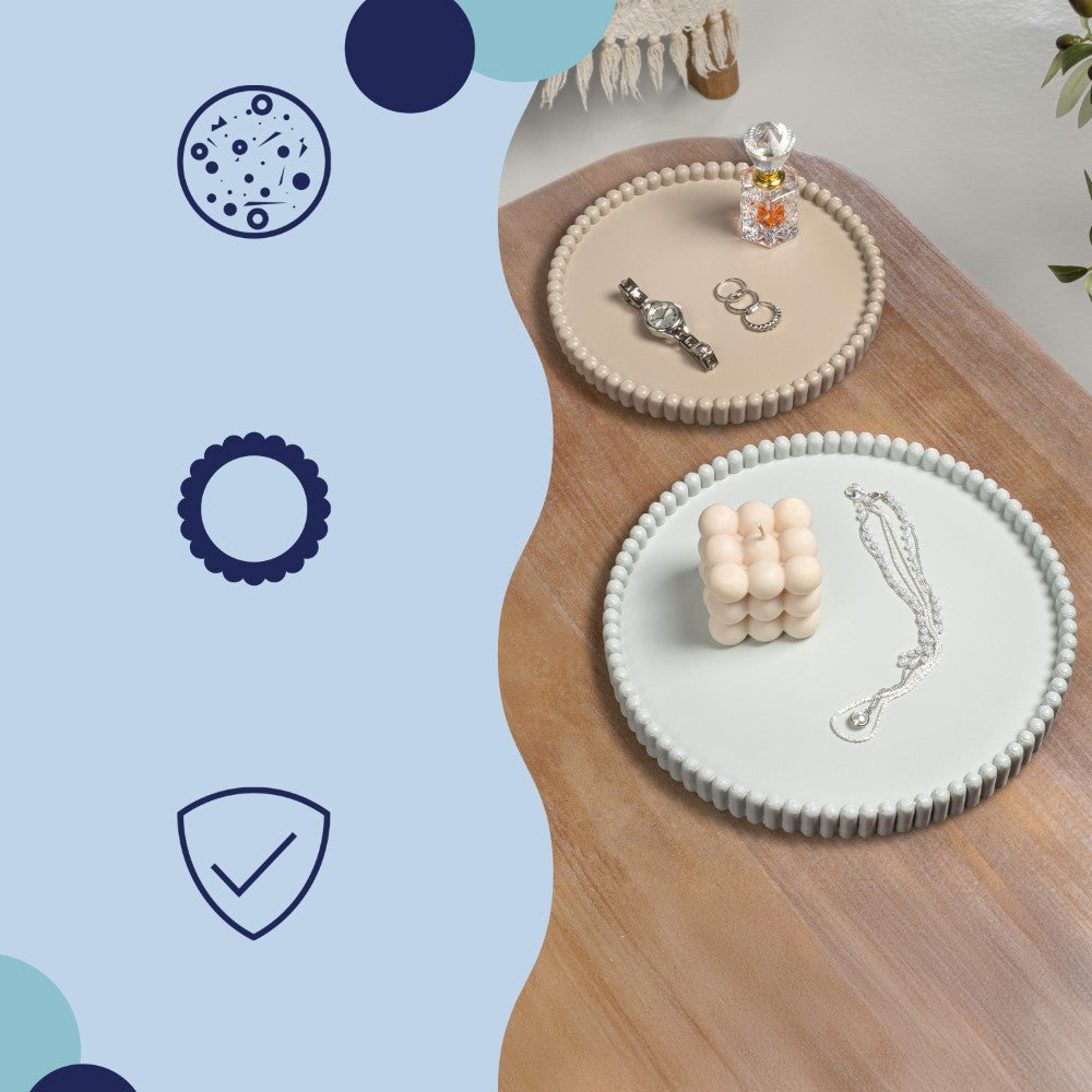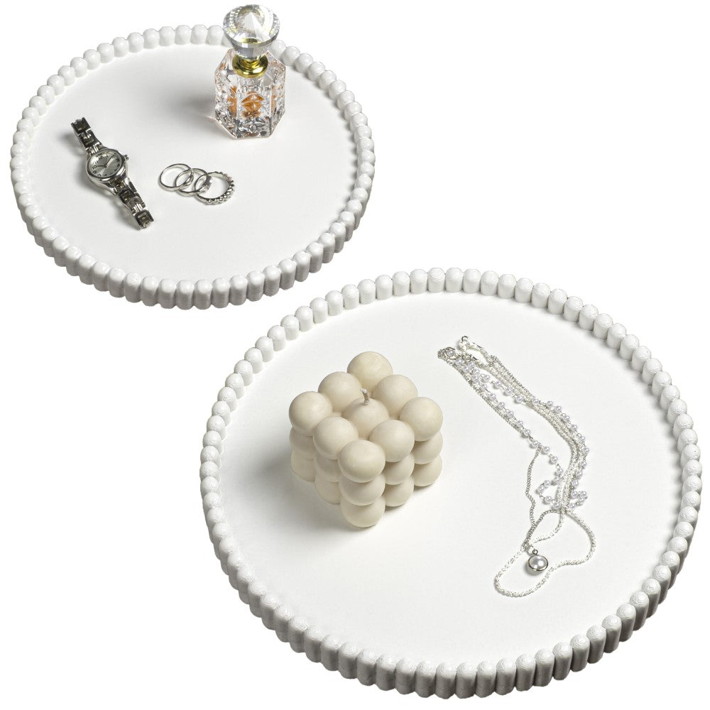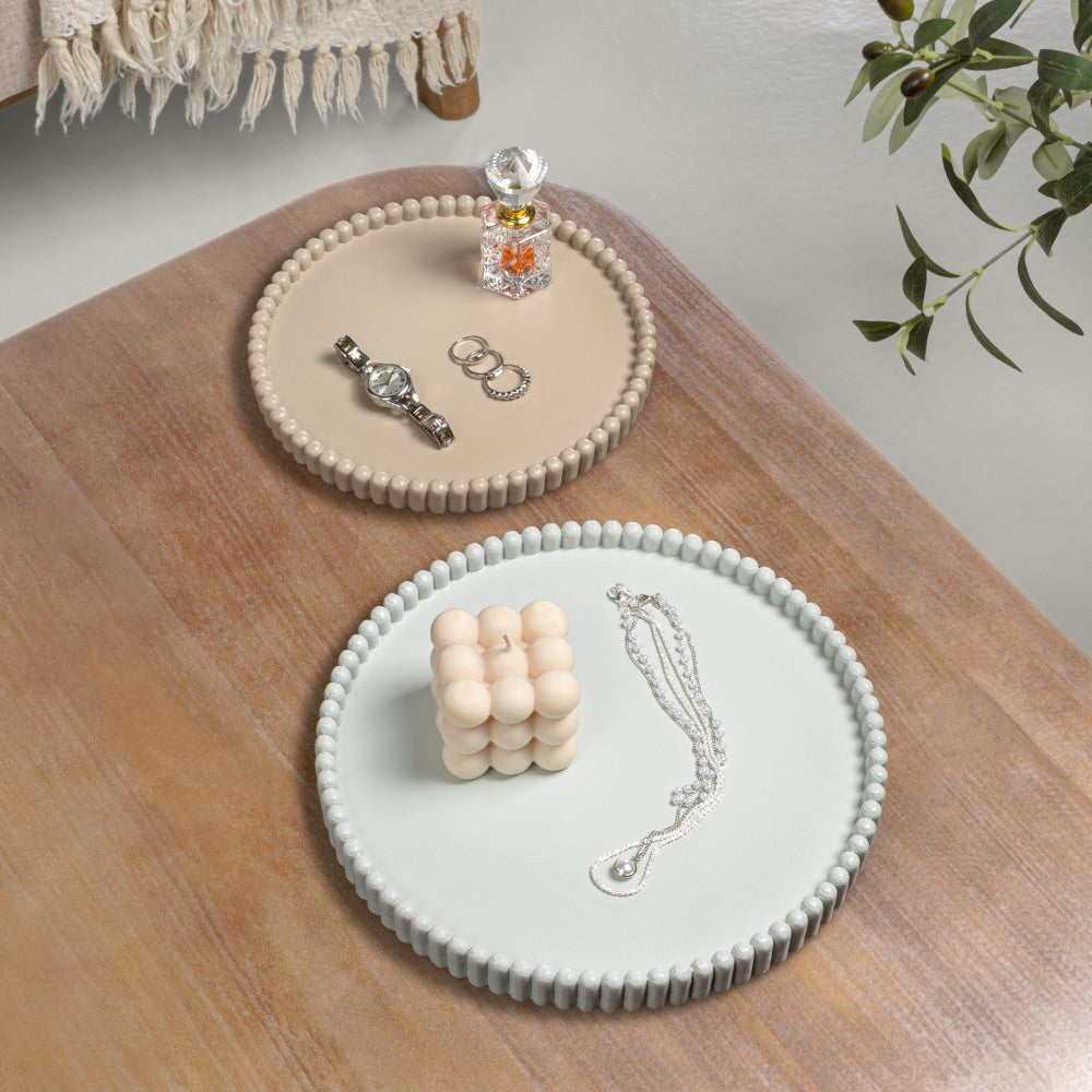This set of two round concrete vanity trays combines decorative design with everyday function for a refined accent. Each tray features a beaded edge and smooth surface, offering durable storage and display for cosmetics, jewelry, or bathroom essentials. The two different sizes create versatile styling options, allowing them to be used together as a coordinated set or individually throughout the home.