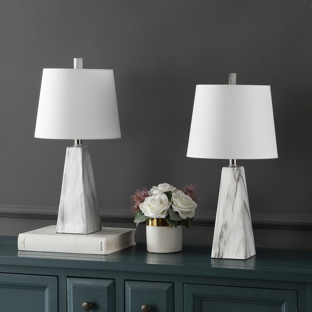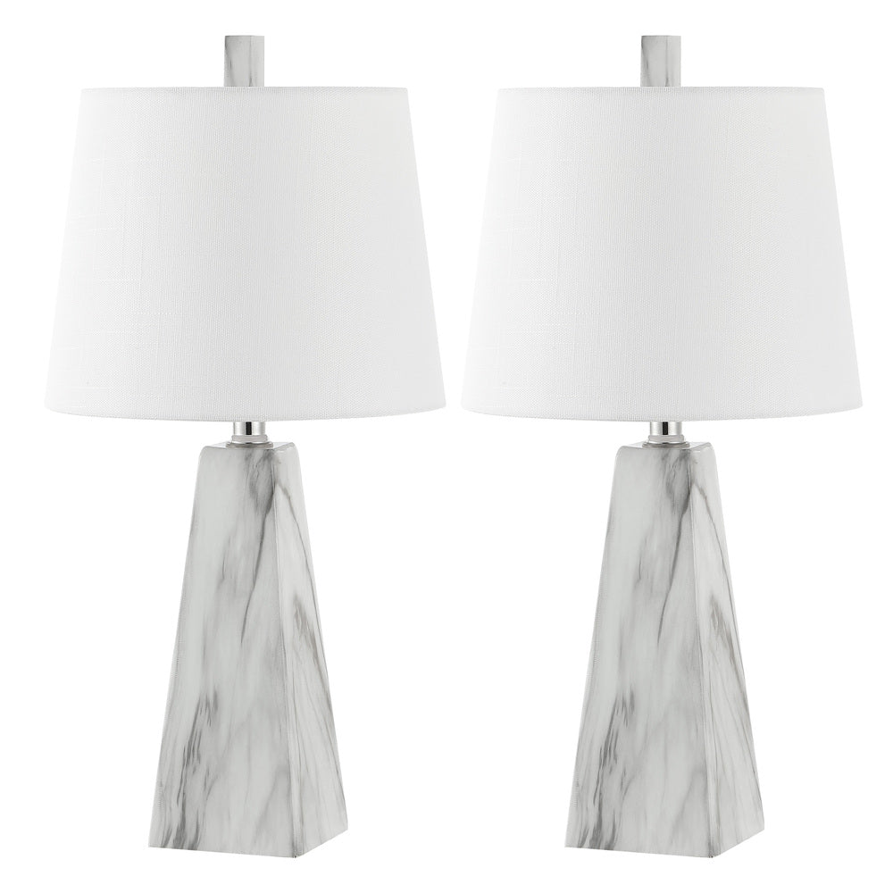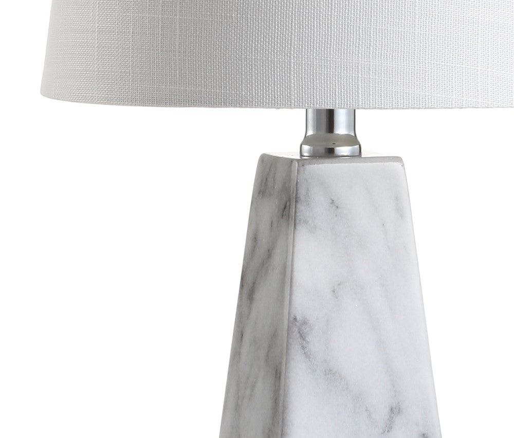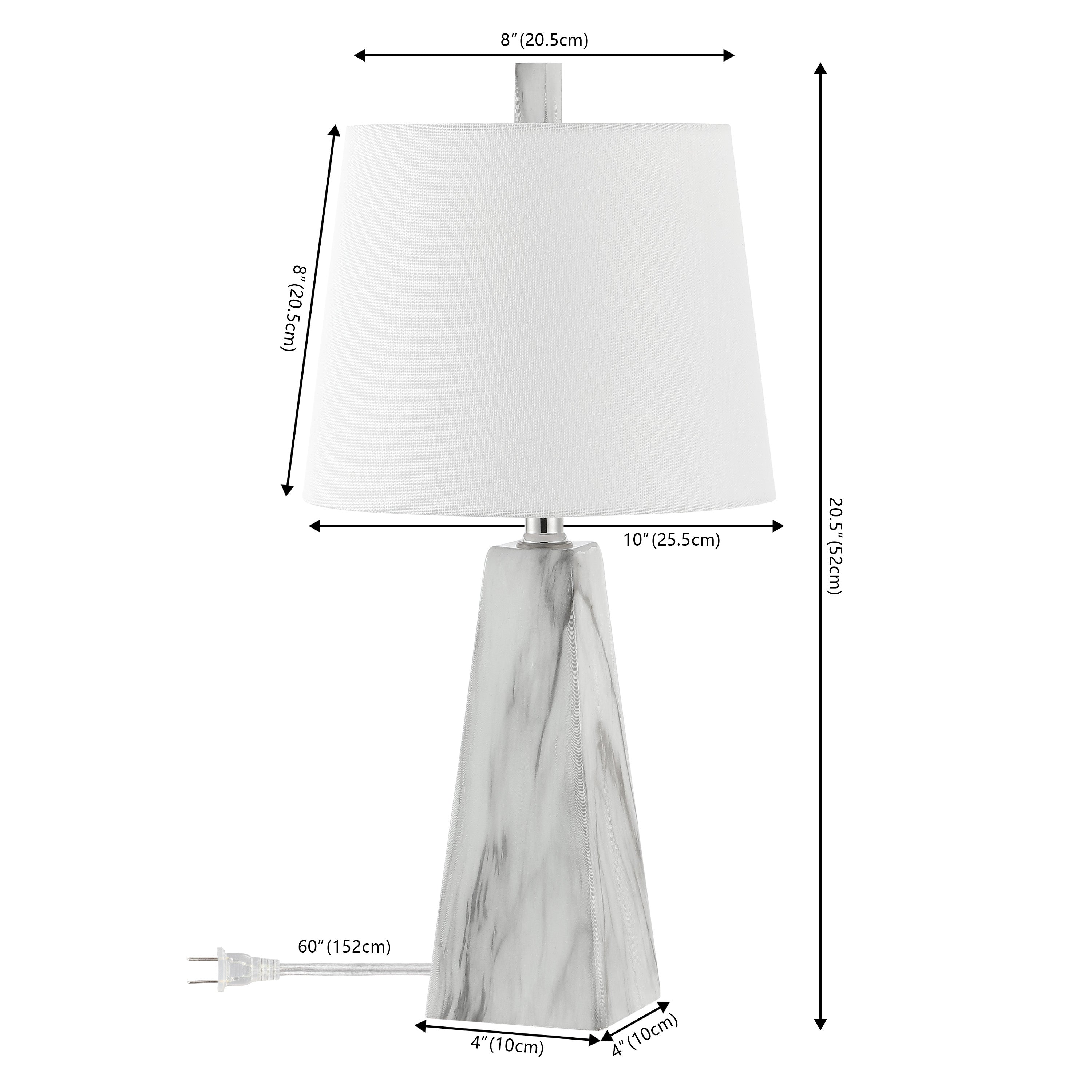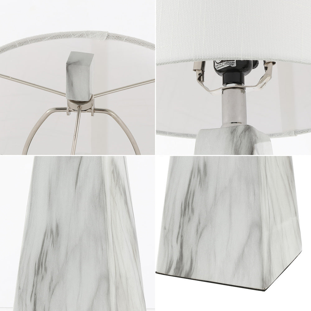 Modern and eye catching, this chic table lamp features an elegant resin base in mixed shades of white and gray to create the effect of marble, but without the inconsistencies inherent in natural stone. This lux finish, coupled with the geometric faceted pyramid silhouette, evokes a modern interpretation of a neoclassical design. The white fabric shade diffuses soft light into any living space, in contrast to the geometric edges of the lower design and the lamp is topped with a matching marbleized resin finial.