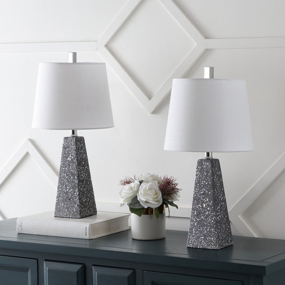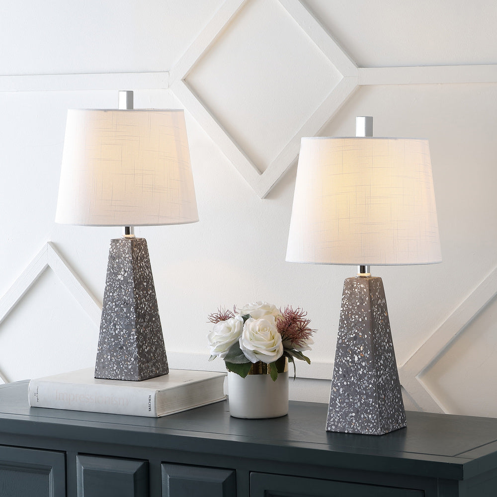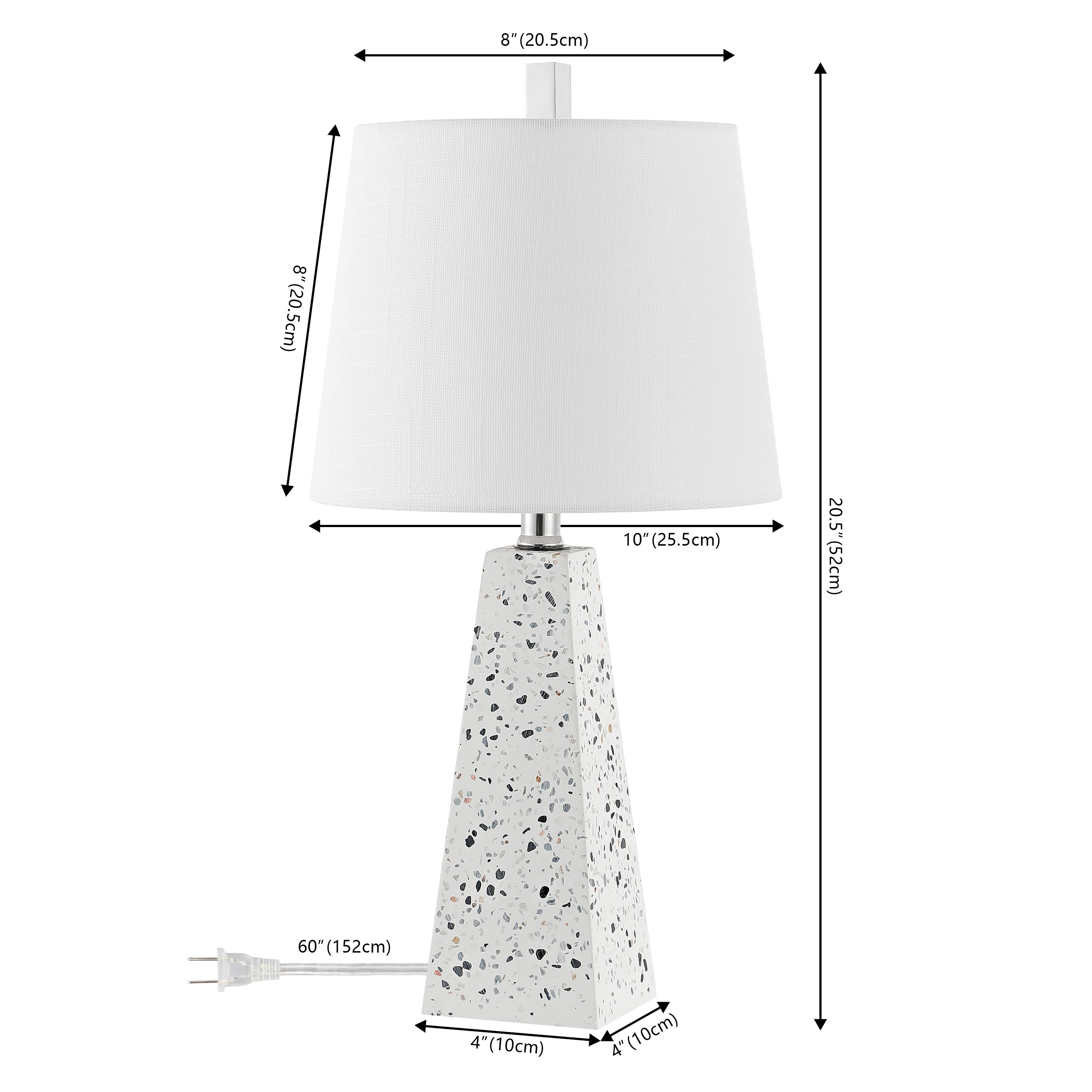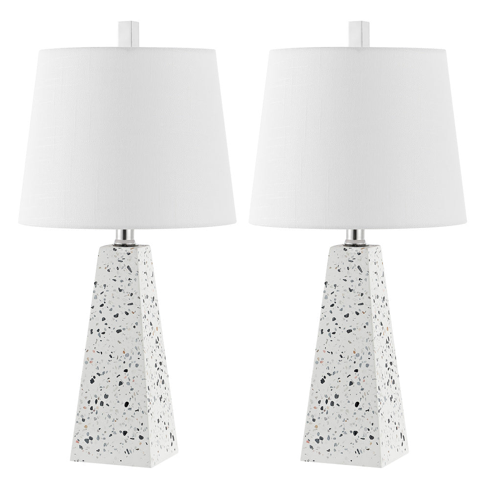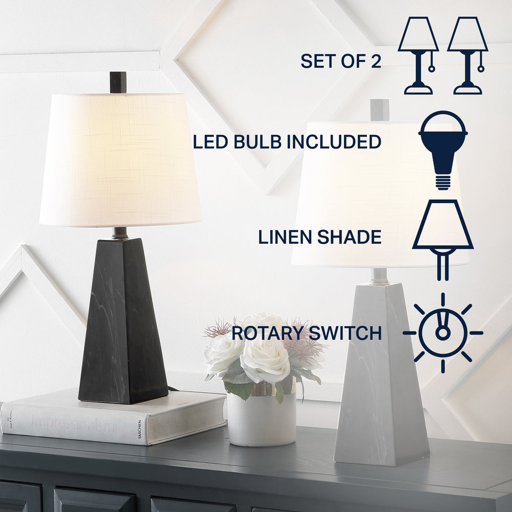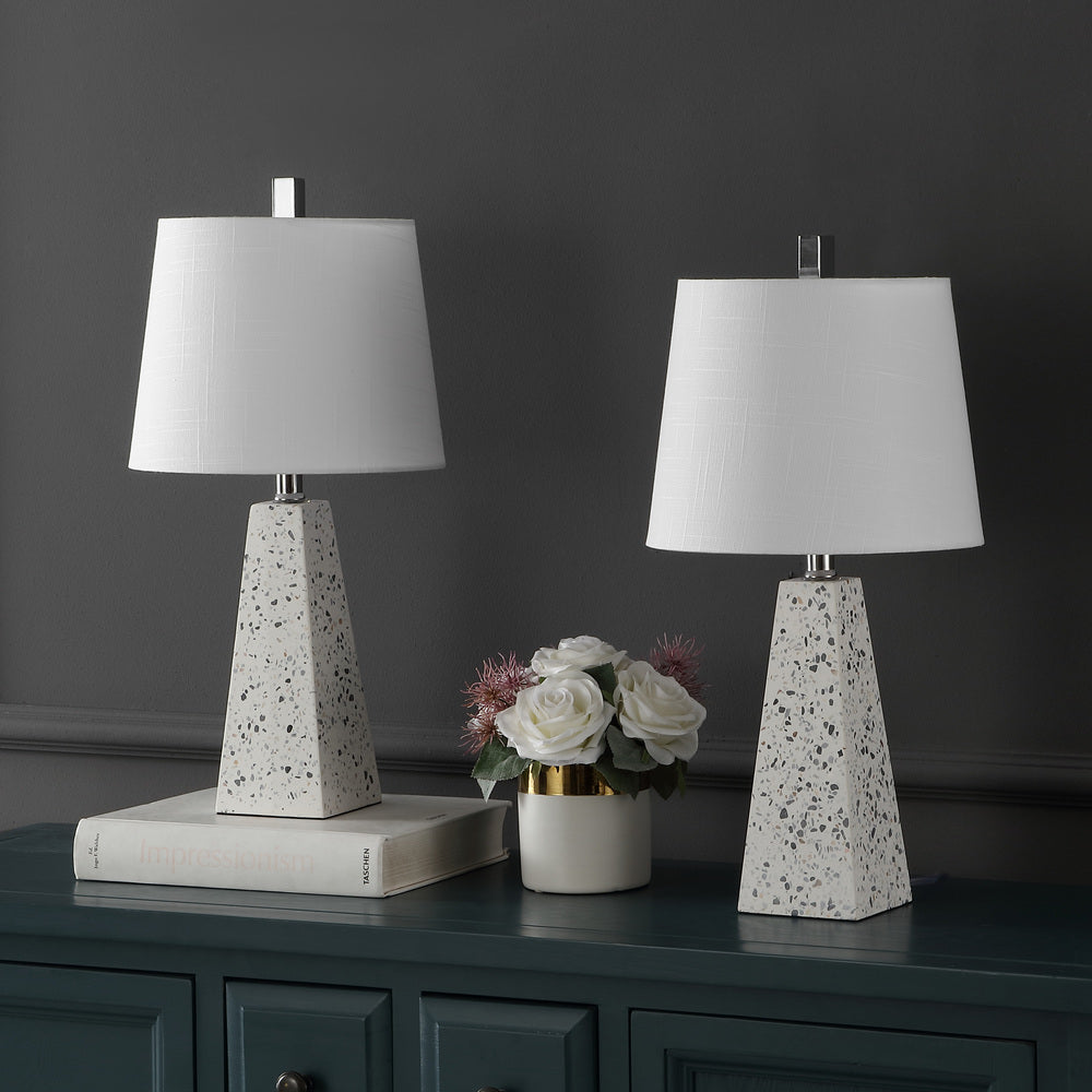 Modern and eye catching, this chic table lamp features an elegant resin base in mixed shades of white and gray to create the effect of marble, but without the inconsistencies inherent in natural stone. This lux finish, coupled with the geometric faceted pyramid silhouette, evokes a modern interpretation of a neoclassical design. The white fabric shade diffuses soft light into any living space, in contrast to the geometric edges of the lower design and the lamp is topped with a matching marbleized resin finial.