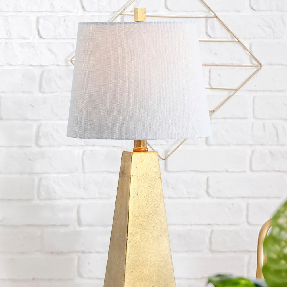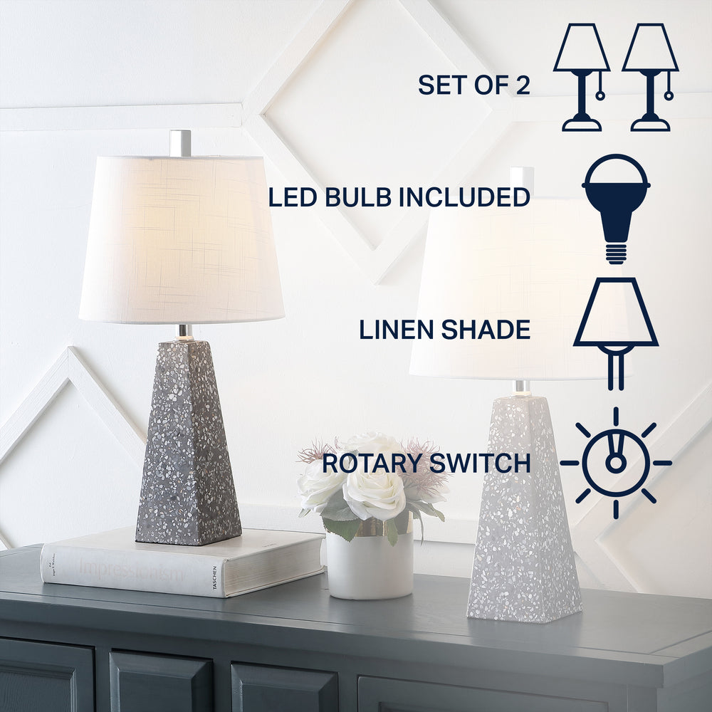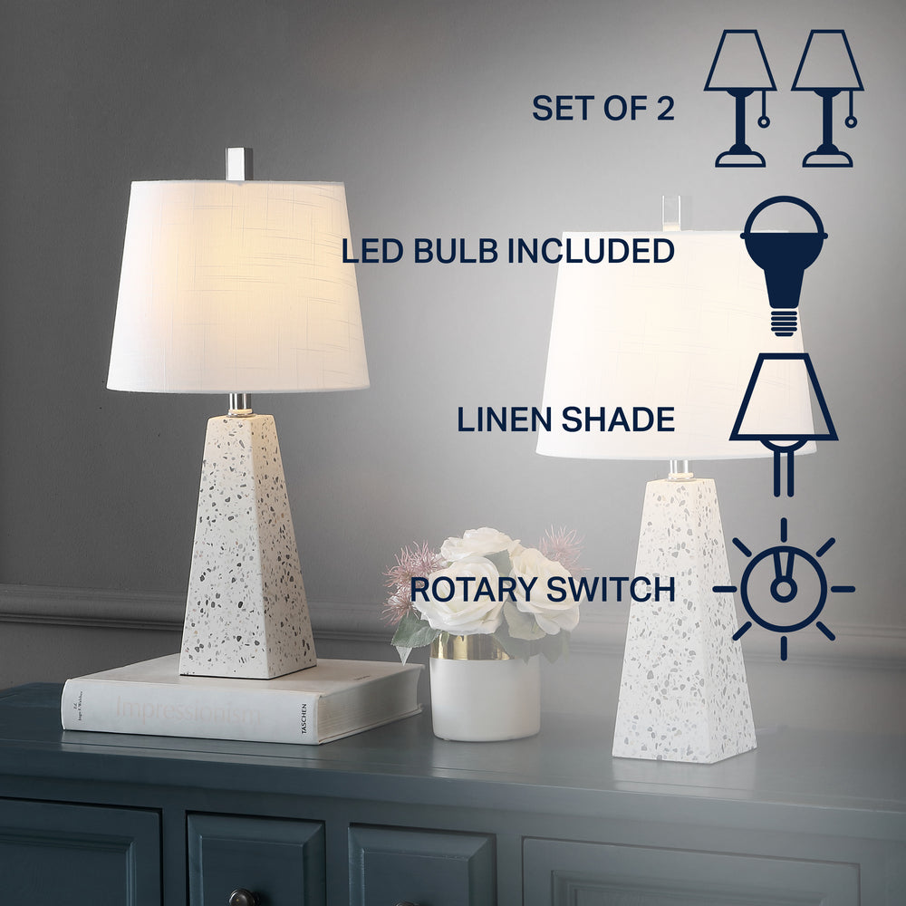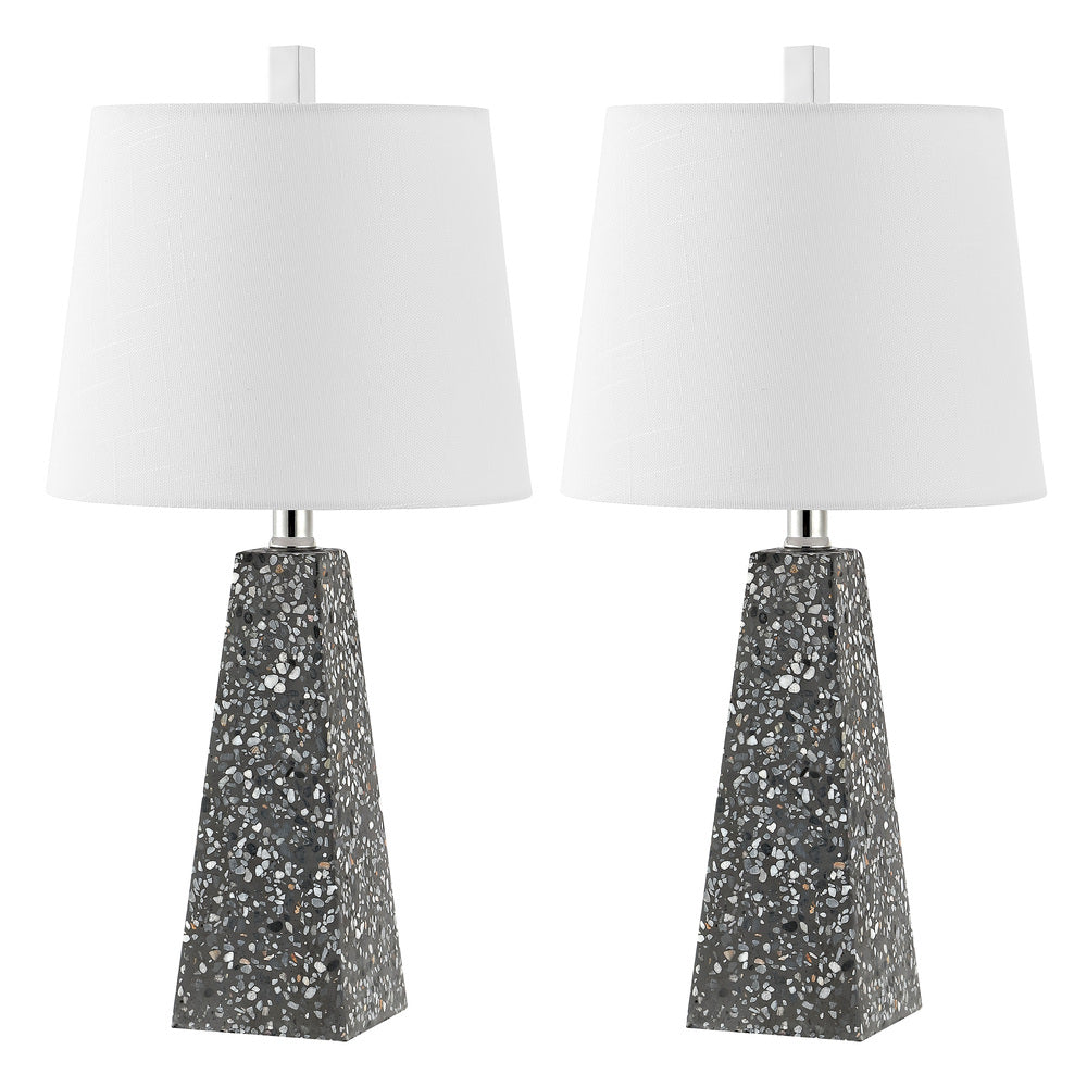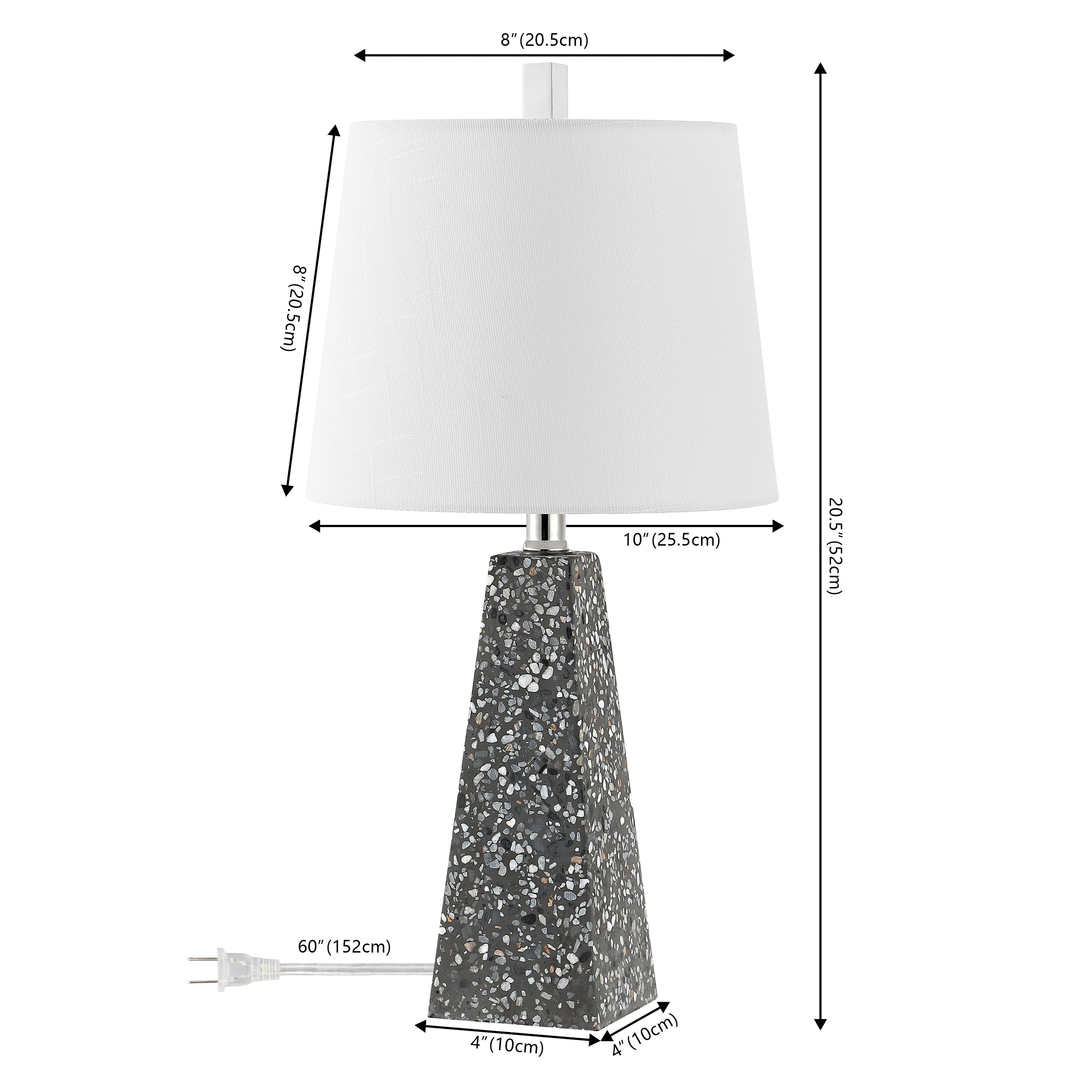 Modern and eye catching, this chic table lamp features an elegant resin base in mixed shades of white and gray to create the effect of marble, but without the inconsistencies inherent in natural stone. This lux finish, coupled with the geometric faceted pyramid silhouette, evokes a modern interpretation of a neoclassical design. The white fabric shade diffuses soft light into any living space, in contrast to the geometric edges of the lower design and the lamp is topped with a matching marbleized resin finial.