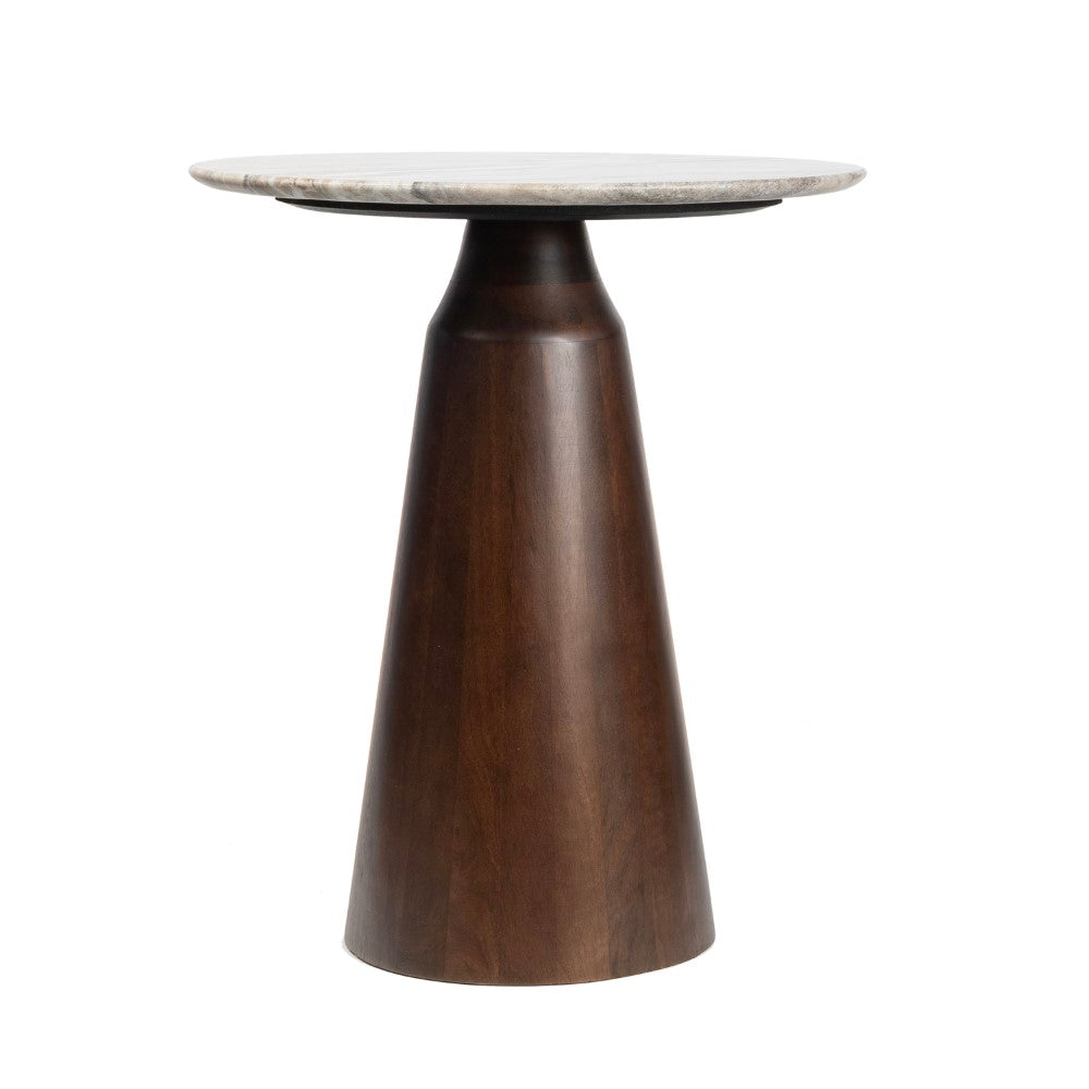 This round side table combines a modern silhouette with rustic, earthy materials in a small size to complement any club chair. The design blends natural materials and textures with a solid marble top set on a tapered mango wood base. Use this table to create a bedroom reading corner, or set a pair of them in front of a living room sofa as drink tables.