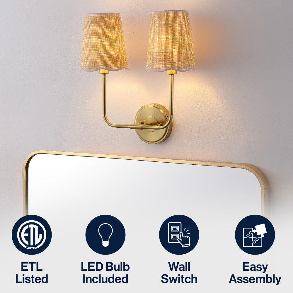 - Bright, warm LED bulbs are softened by scalloped shades covered in woven rope fabric