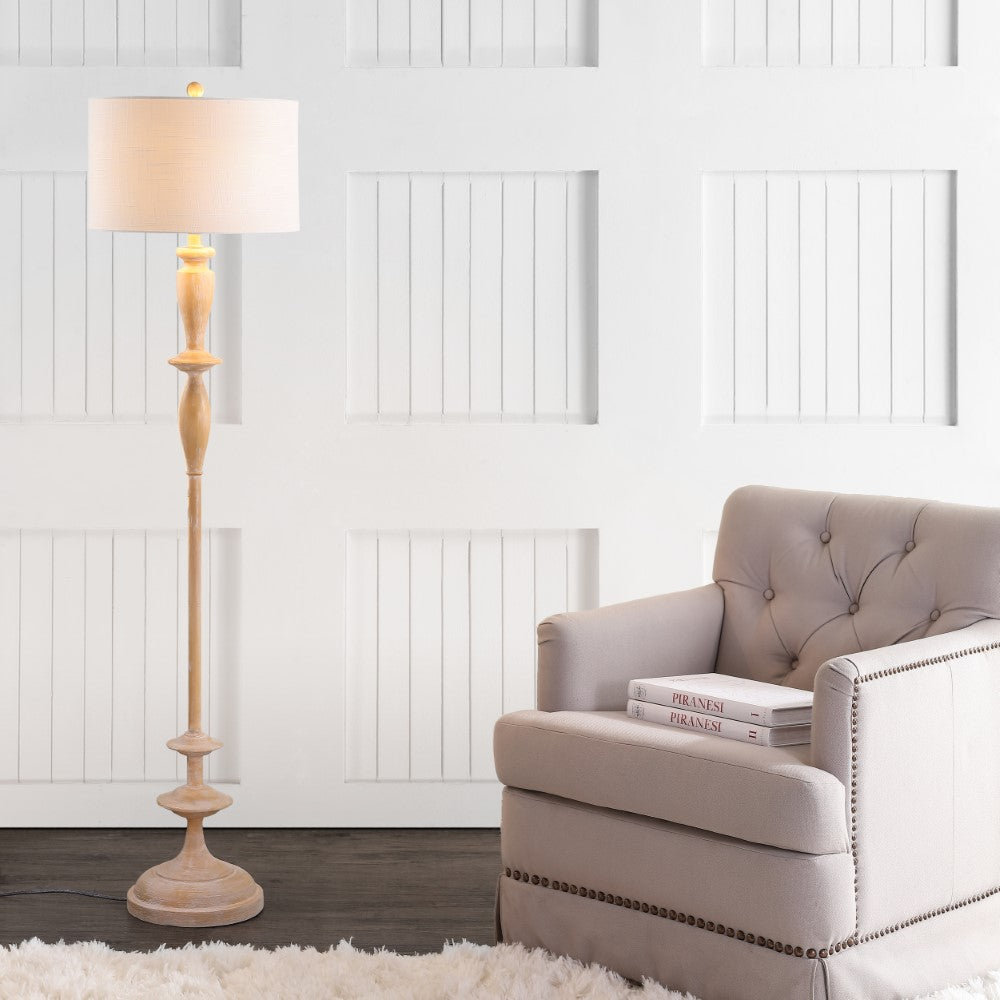 - Simple and understated, this turned wood-finished floor lamp stuns in any setting