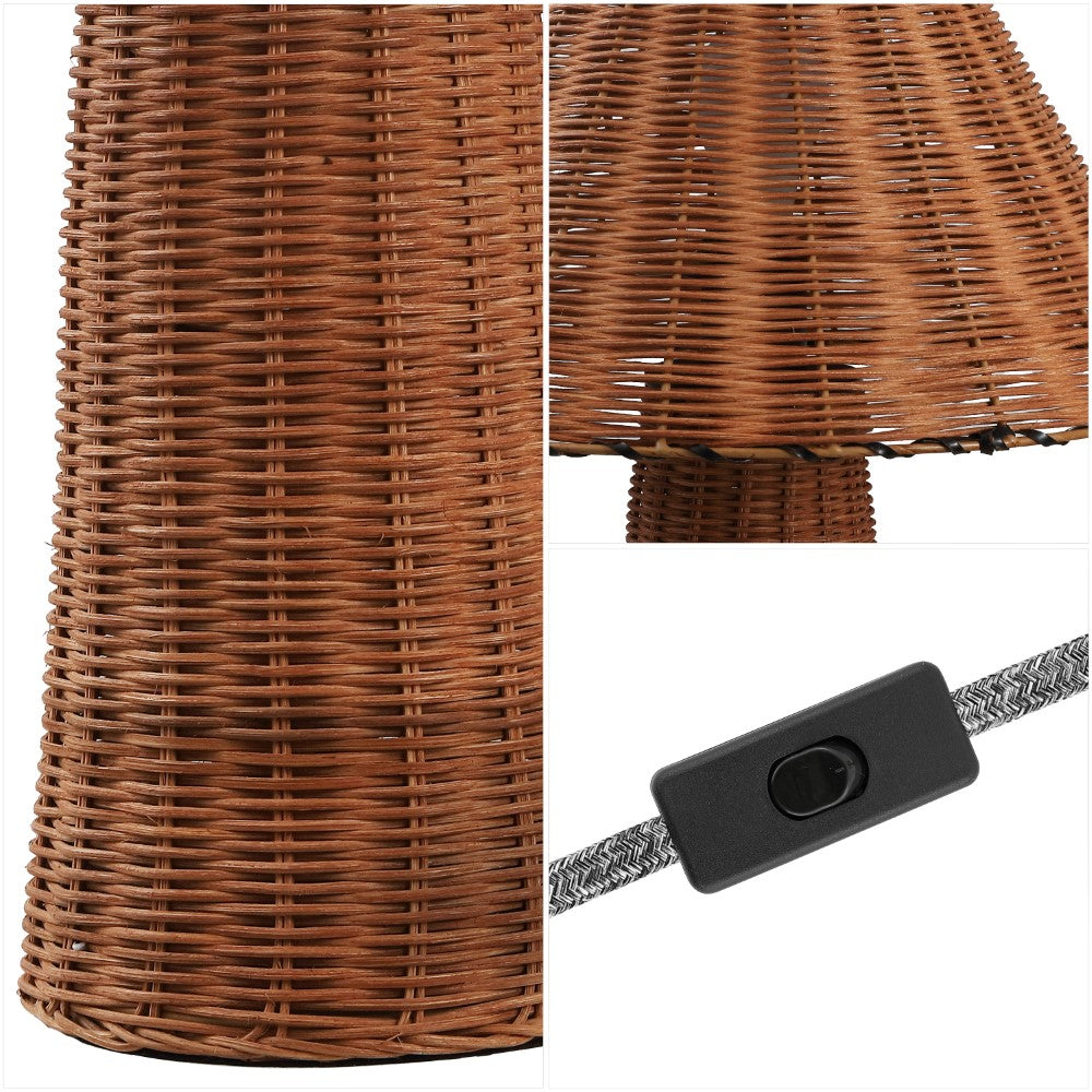 - Minimalist lamp design features a wicker base and woven shade in dark brown rattan