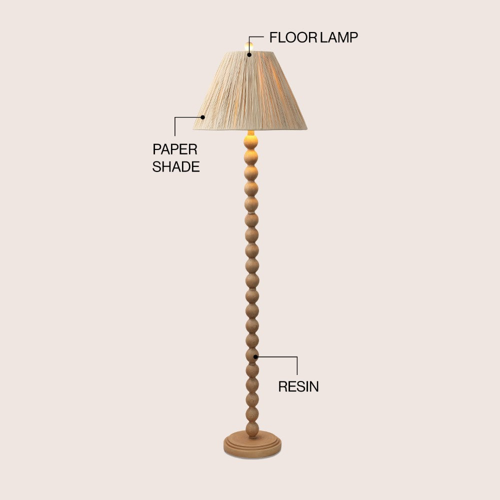 - Lamp base is resin with a light oak, wood-grain finish; shade is paper in a natural straw color