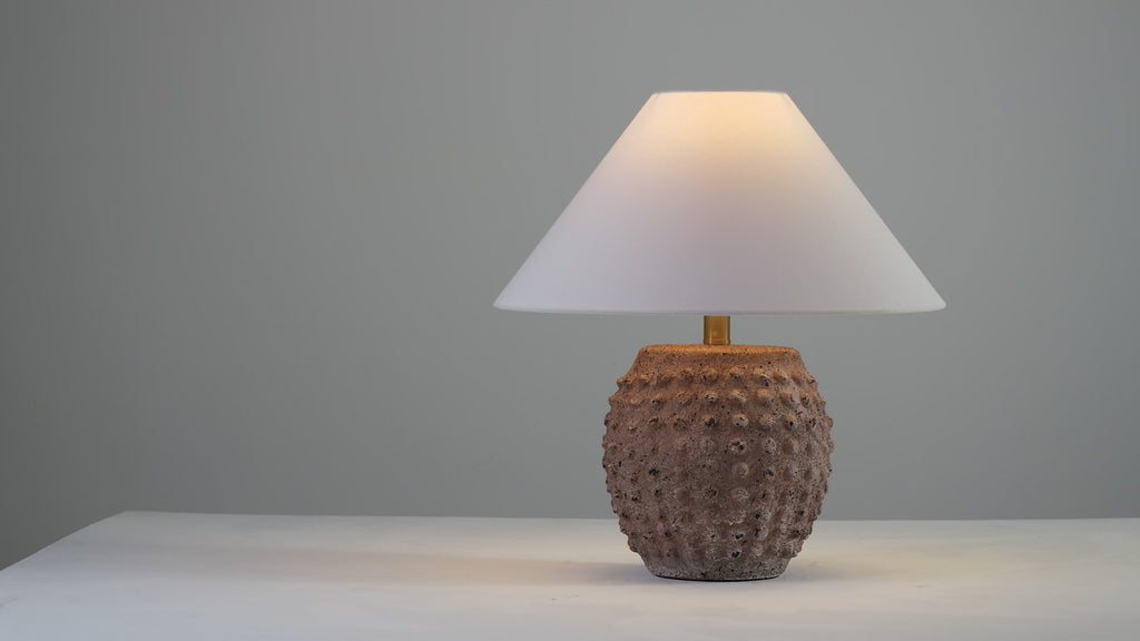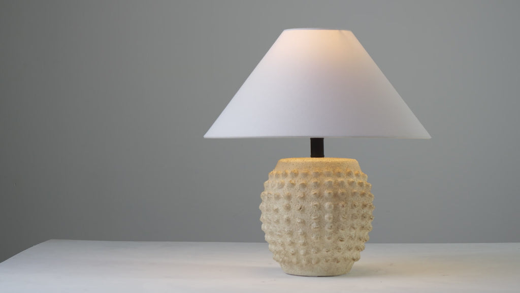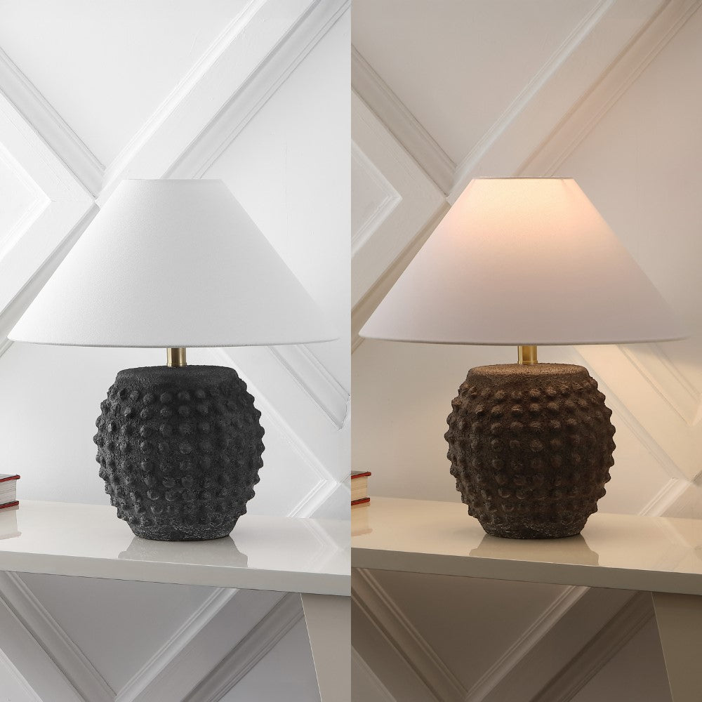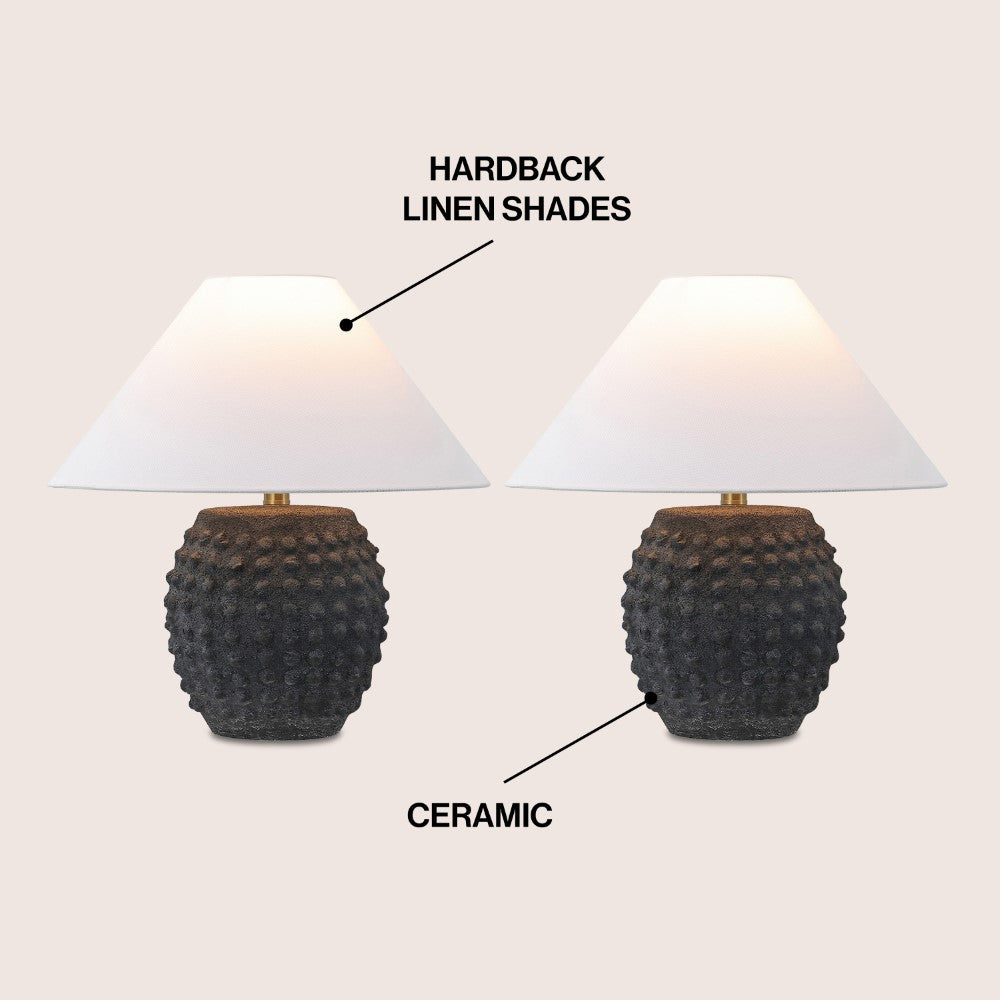 Add a vintage twist to your home with our pair of minimalist, modern jar lamps. Heavy resin bases are textured like hobnail glass, and topped with tapered linen shades. The chic matte finish adds low-key style to the bedroom, office or living room.