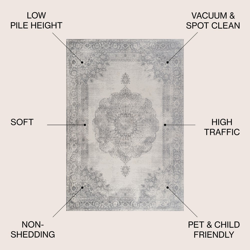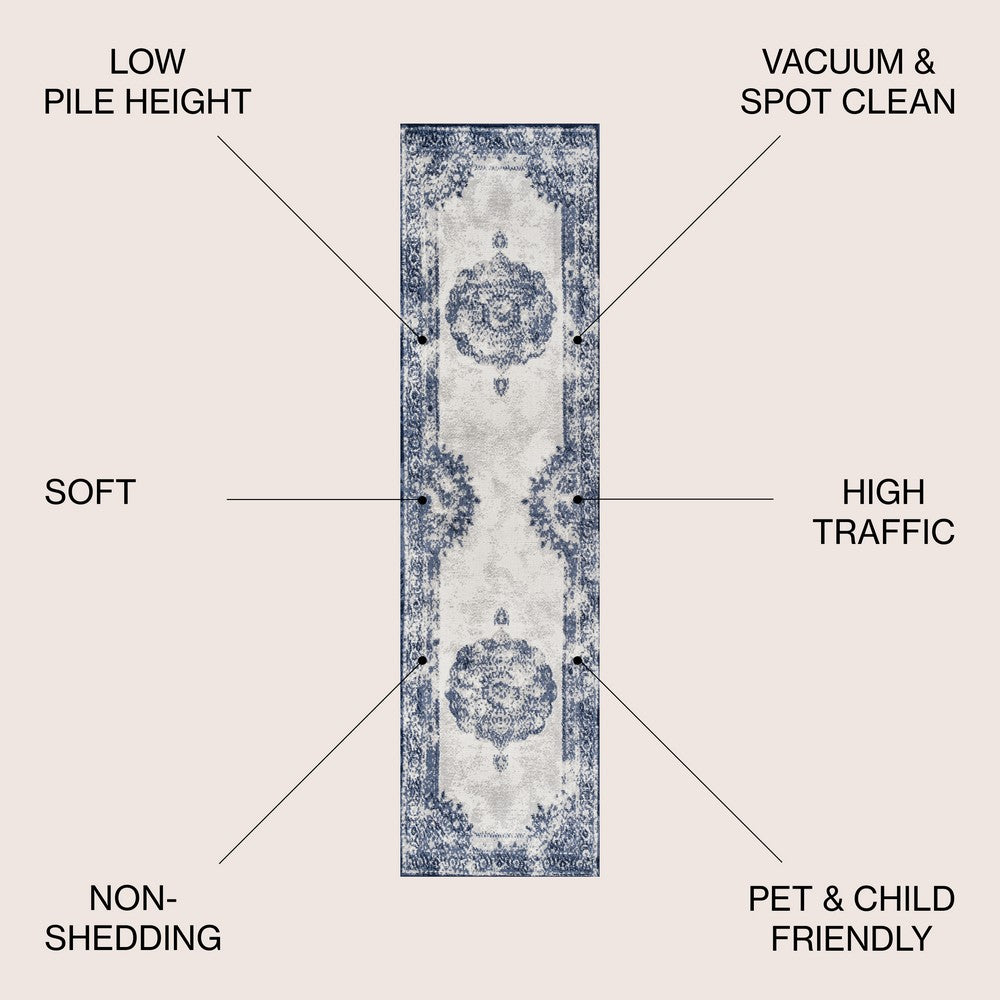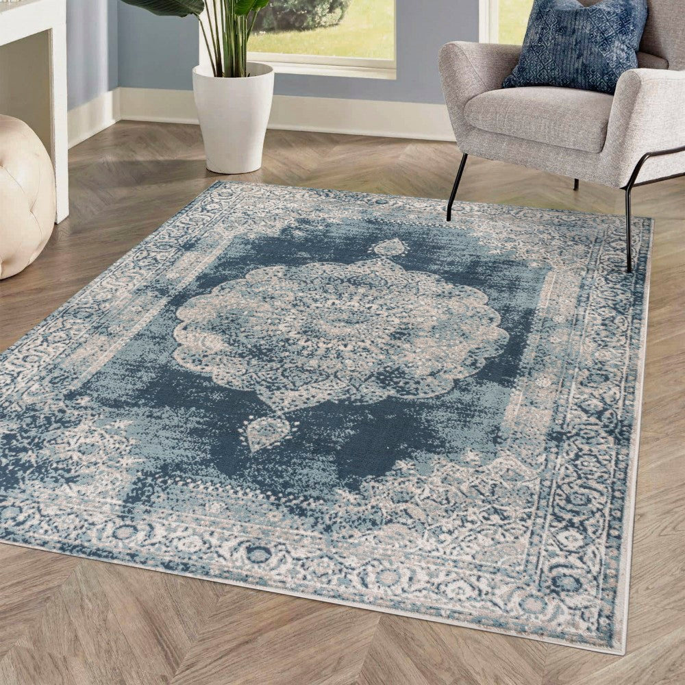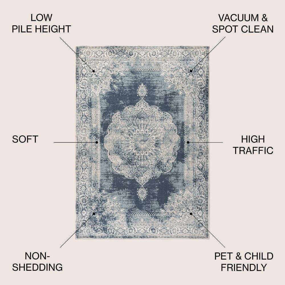 This ornate medallion rug has a scroll and floral pattern, adding modern Bohemian cottage style to a living room, bedroom, entry or kitchen. Varied tones of denim blue on an ivory background give this rug a hand-woven, rustic look. The busy allover pattern is pet-friendly and great for kids too.