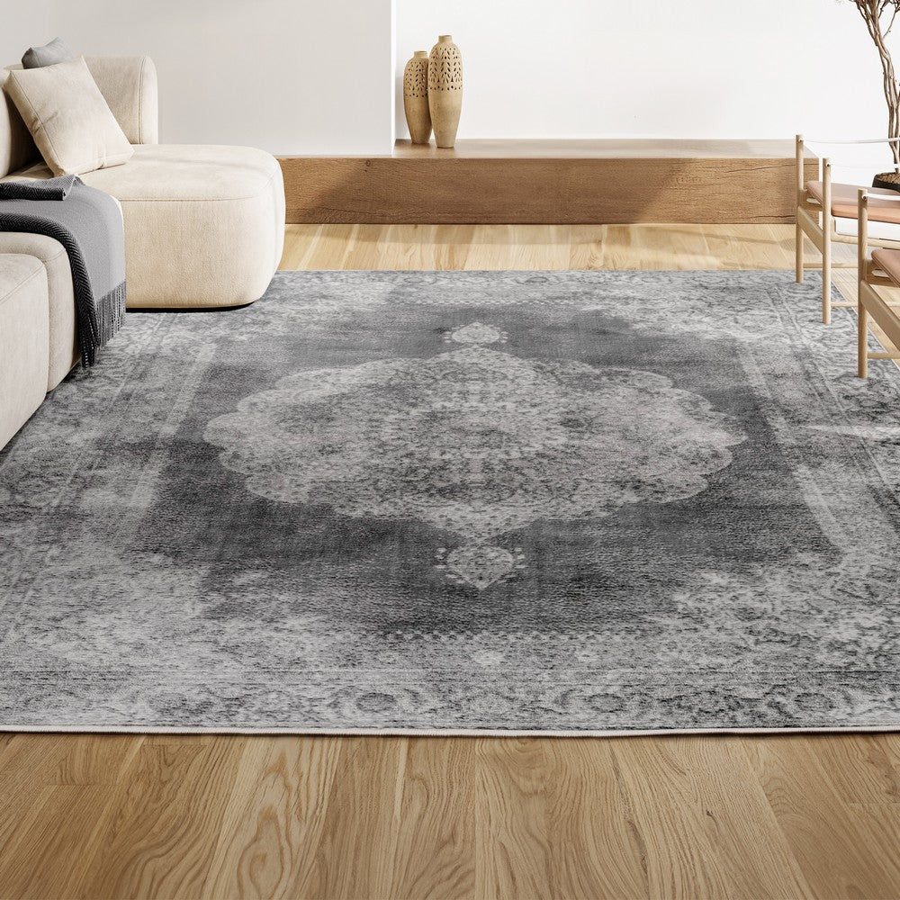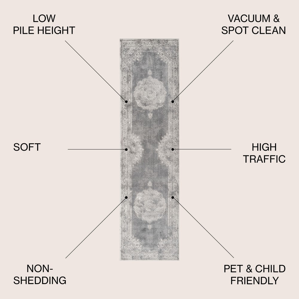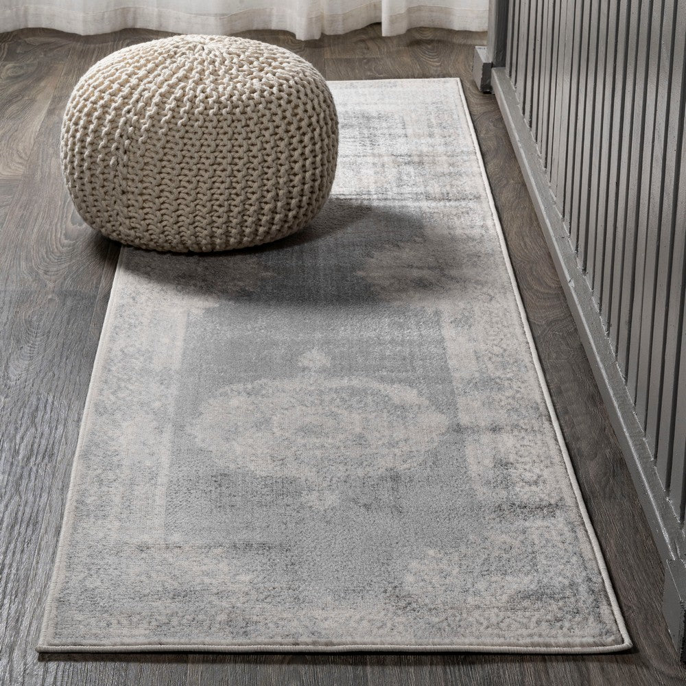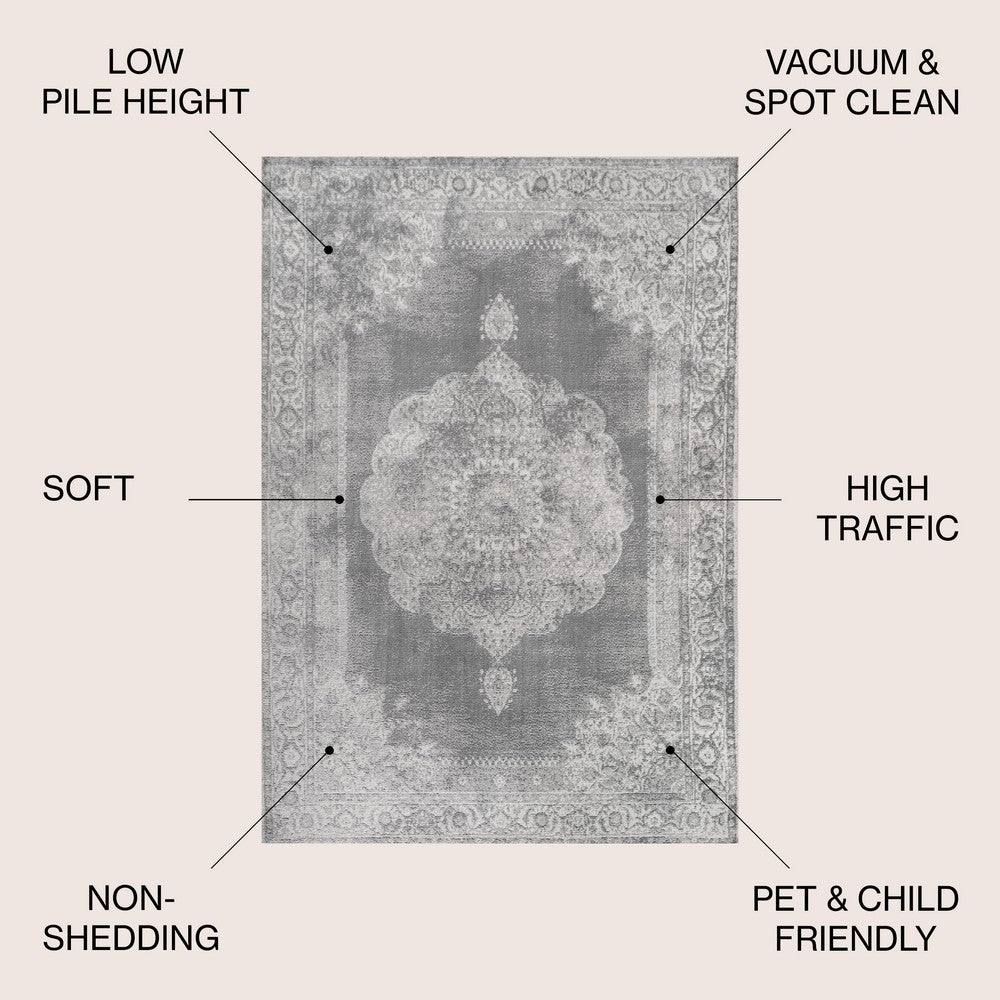 This ornate medallion rug has a scroll and floral pattern, adding modern Bohemian cottage style to a living room, bedroom, entry or kitchen. Varied tones of denim blue on an ivory background give this rug a hand-woven, rustic look. The busy allover pattern is pet-friendly and great for kids too.