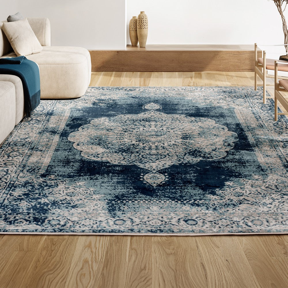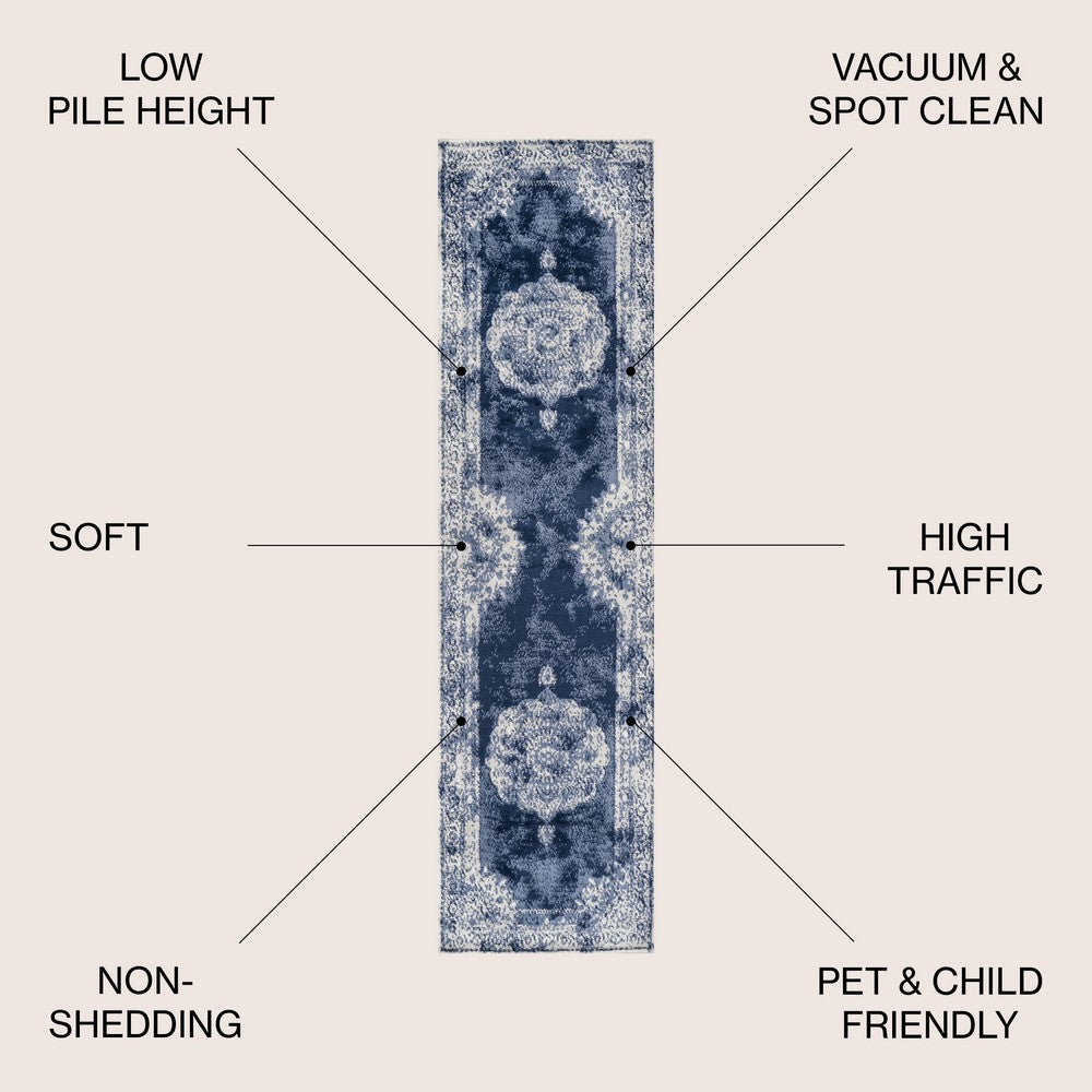 • Mingled denim blue and navy on an ivory background give this rug a vintage texture