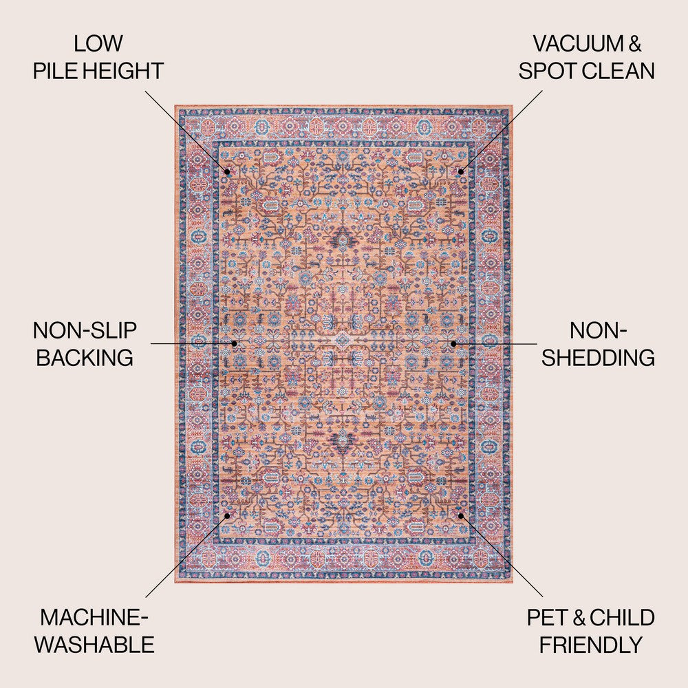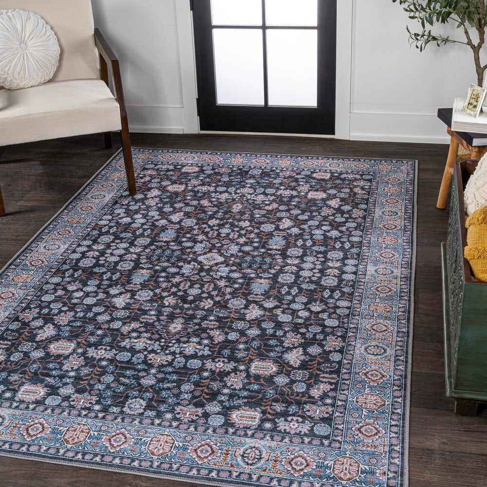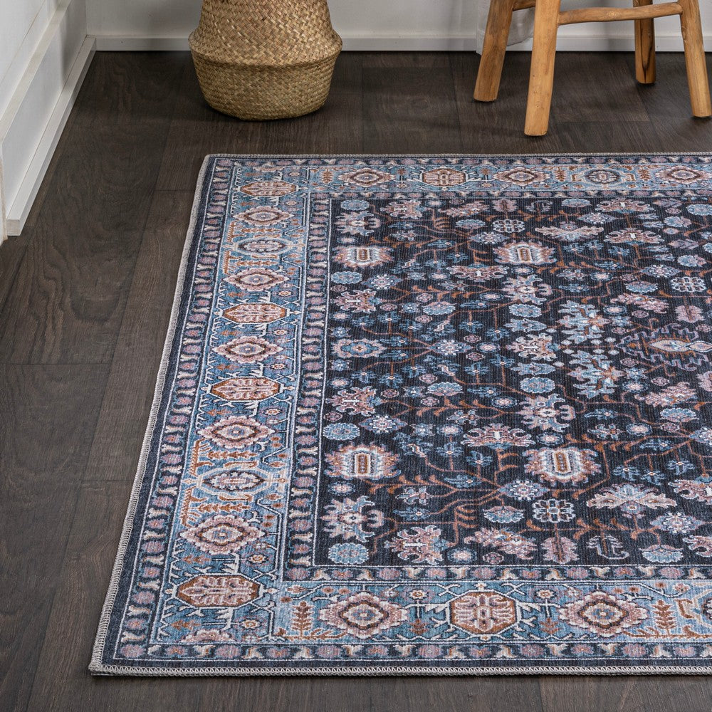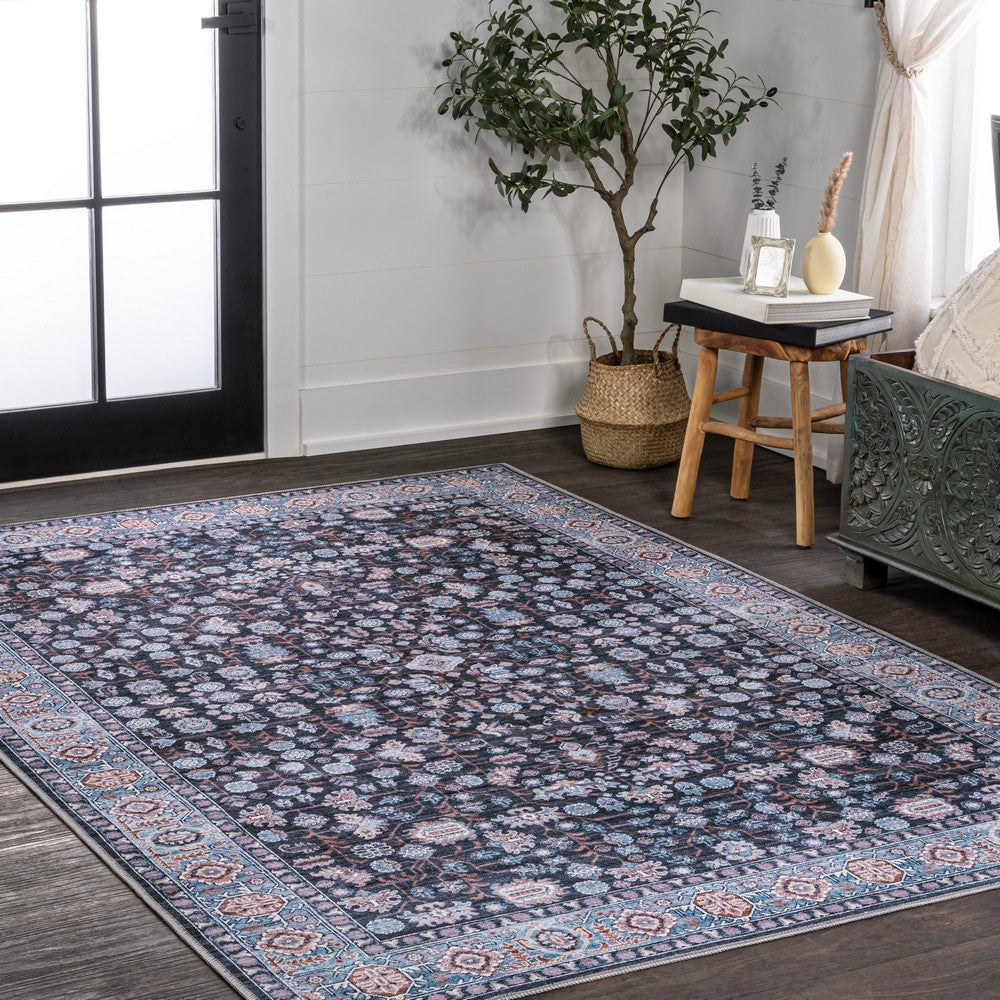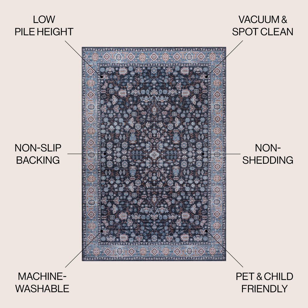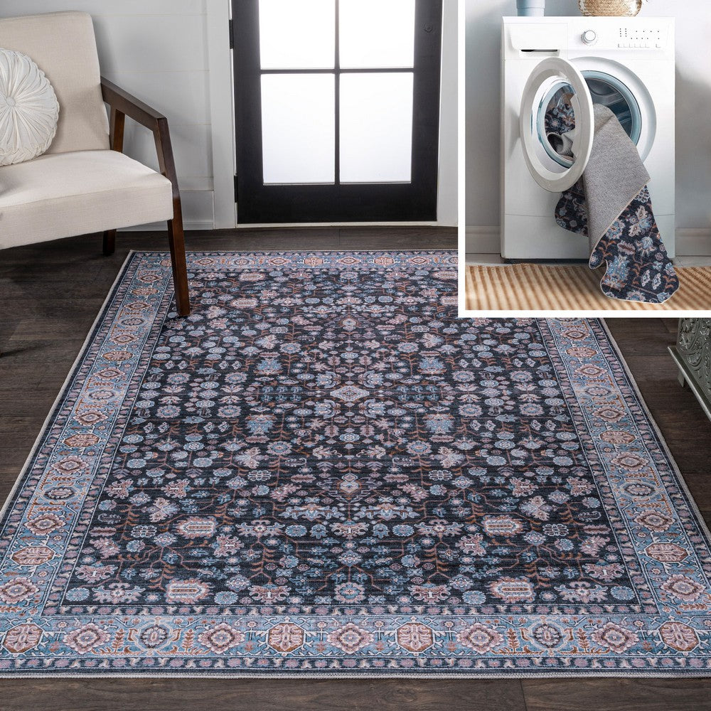 Stylized vines and flowers in the center of this rug's design recall ancient Persian rug designs. Updated colors add a modern Bohemian-inspired twist to a classic design. With its pet-friendly pattern, this easy-care rug would be perfect for a dining room, living room, entry, bedroom or porch.
