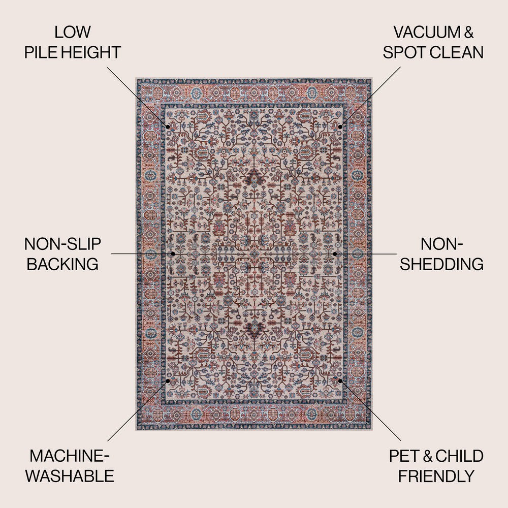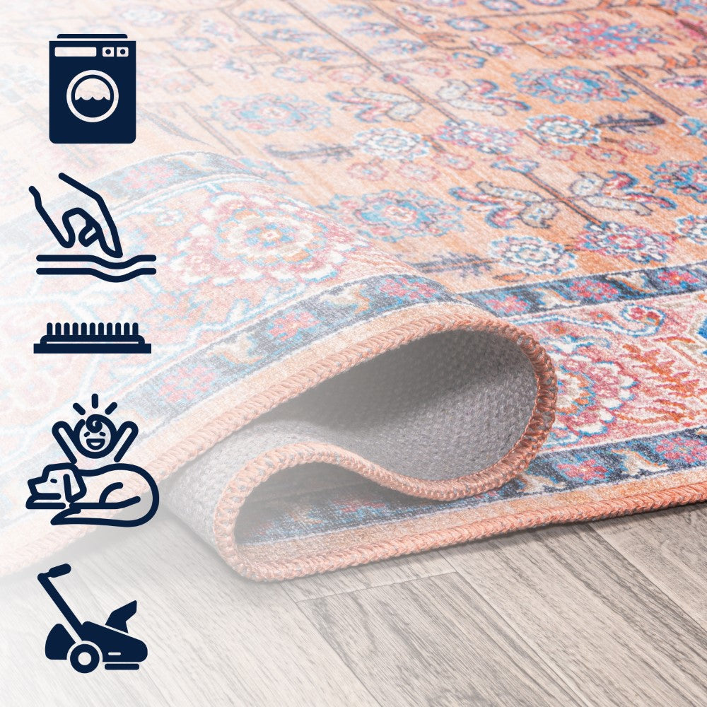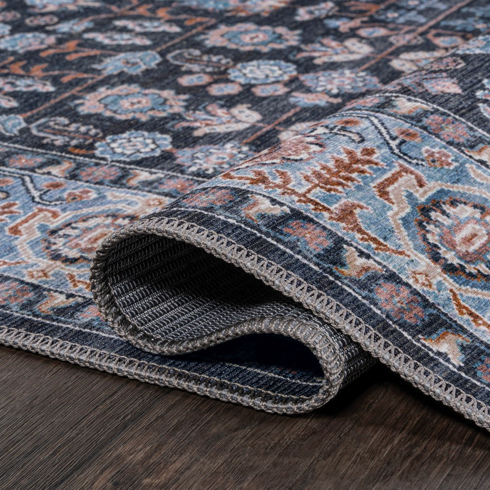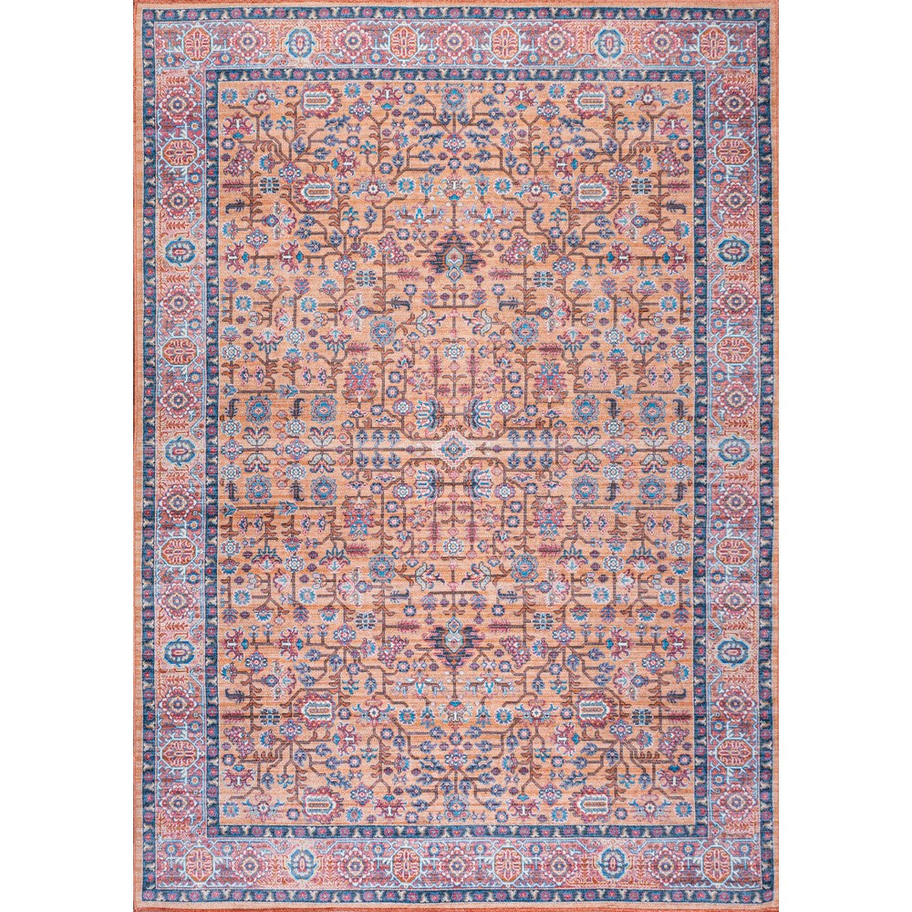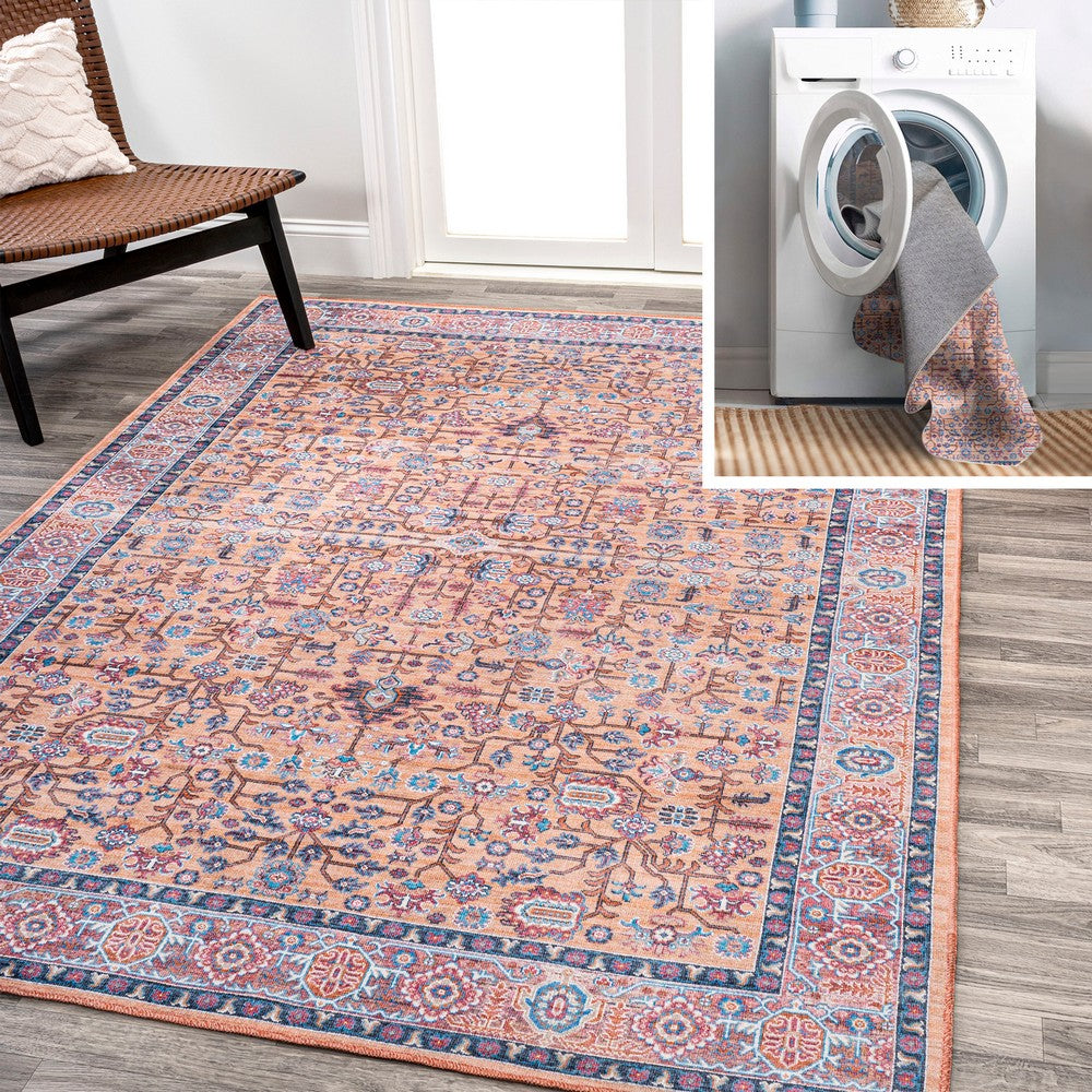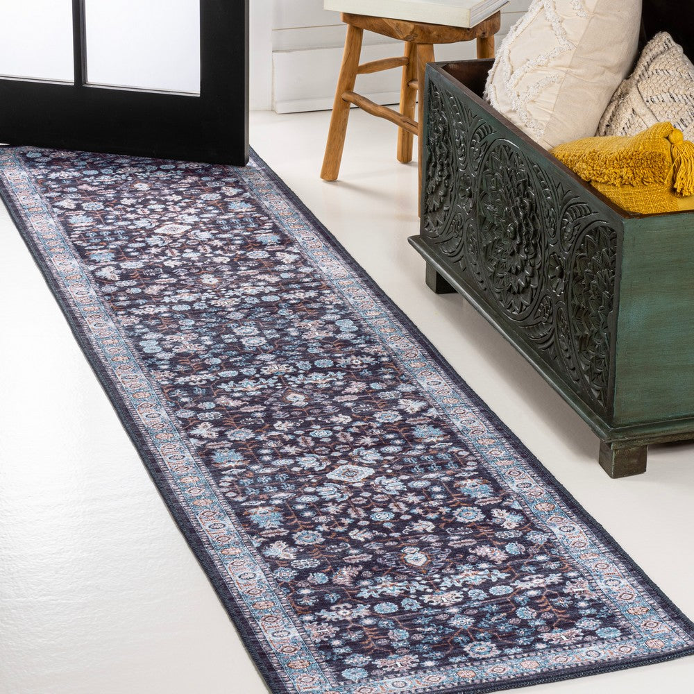 Stylized vines and flowers in the center of this rug's design recall ancient Persian rug designs. Updated colors add a modern Bohemian-inspired twist to a classic design. With its pet-friendly pattern, this easy-care rug would be perfect for a dining room, living room, entry, bedroom or porch.