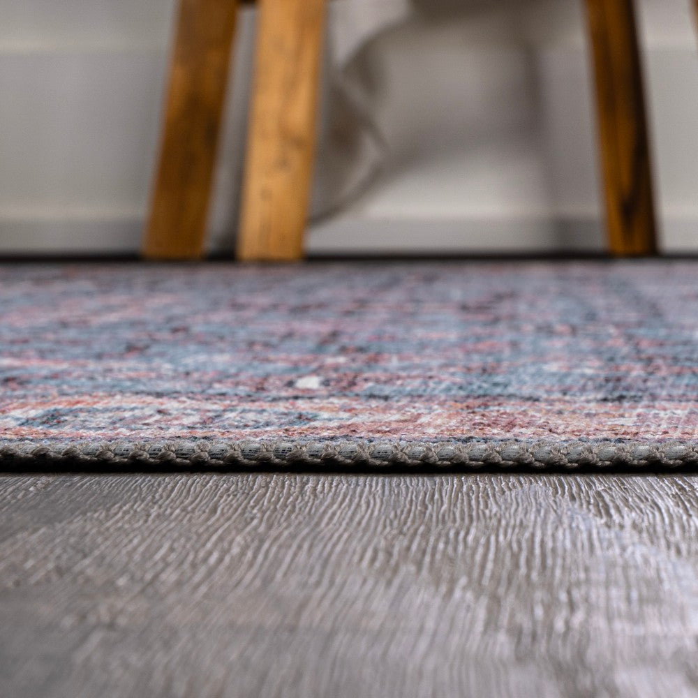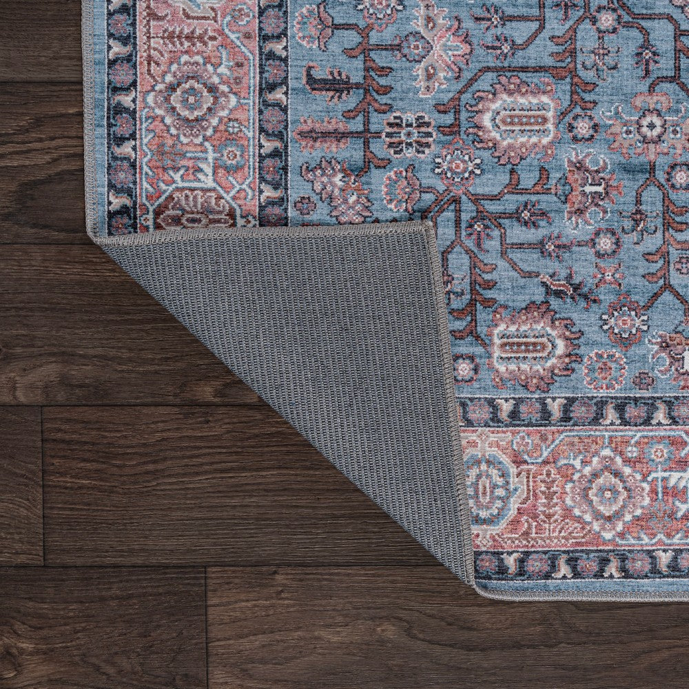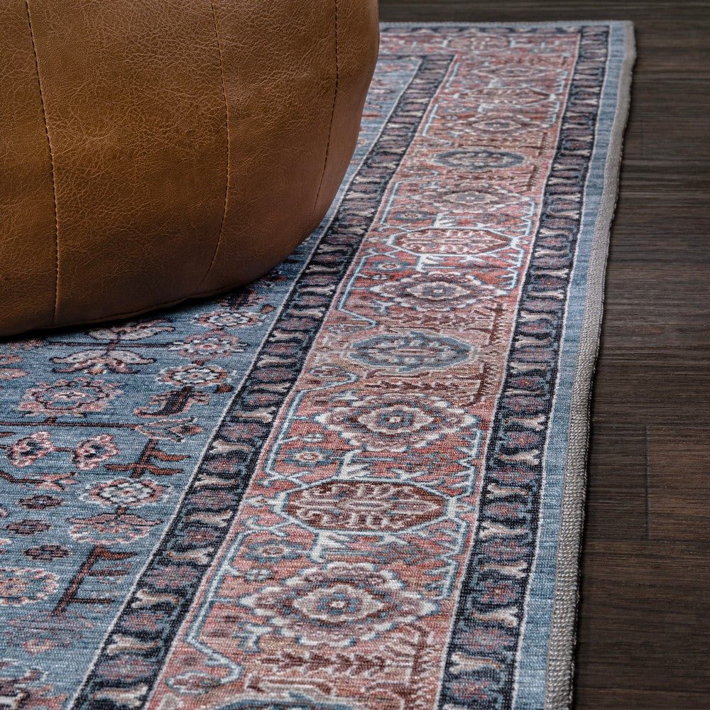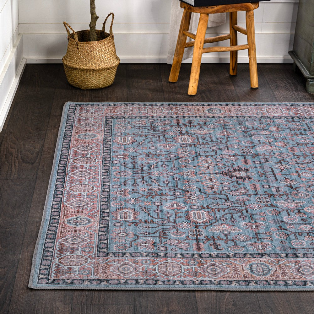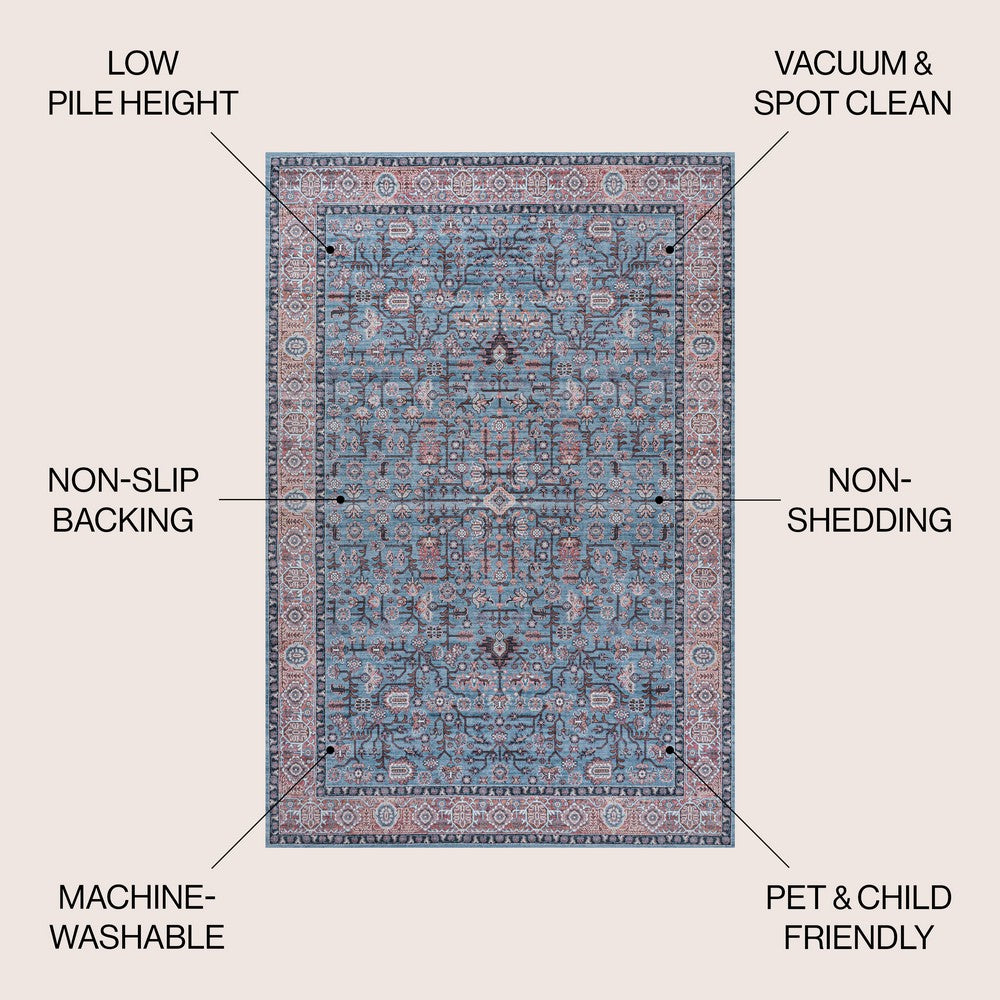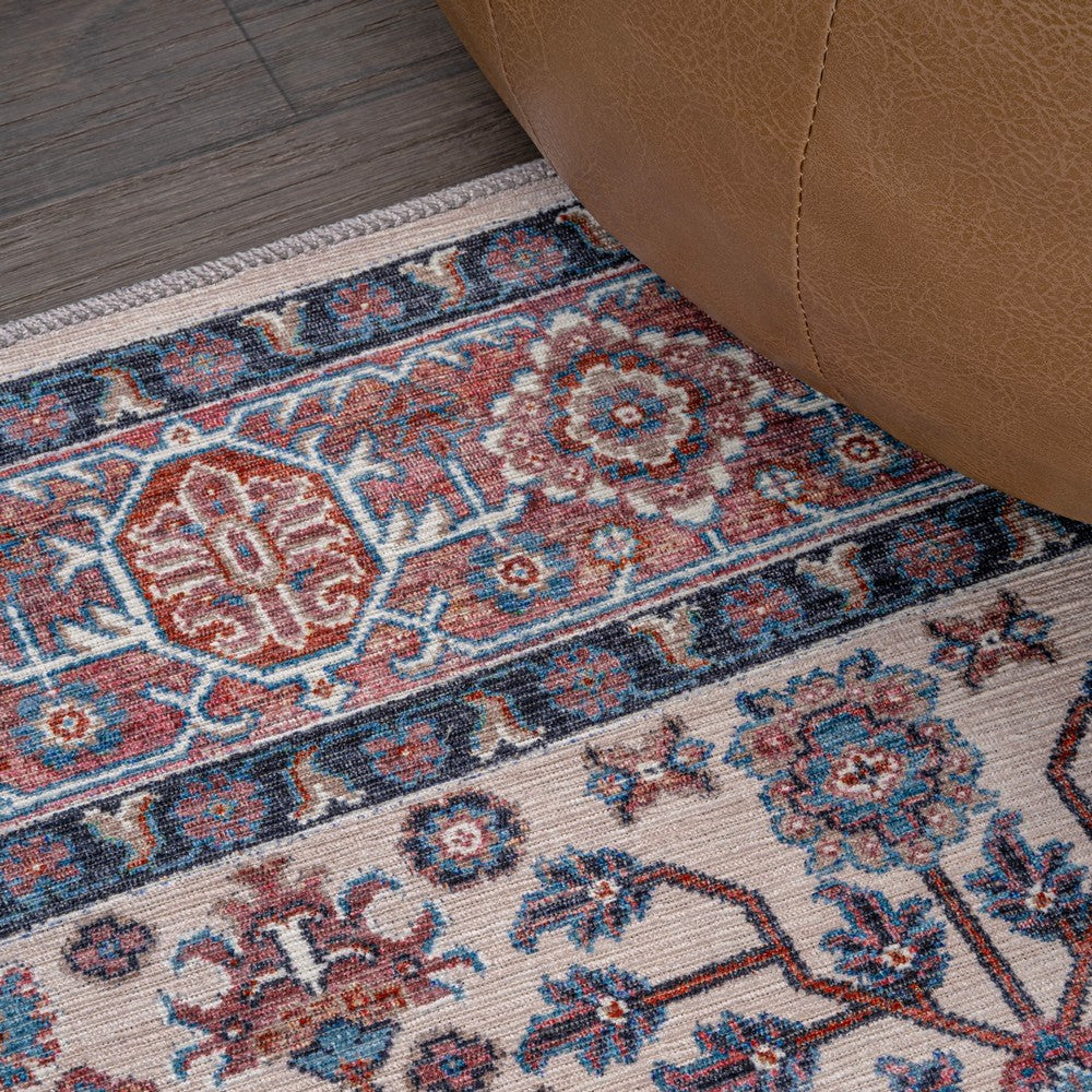Stylized vines and flowers in the center of this rug's design recall ancient Persian rug designs. Updated colors add a modern Bohemian-inspired twist to a classic design. With its pet-friendly pattern, this easy-care rug would be perfect for a dining room, living room, entry, bedroom or porch.