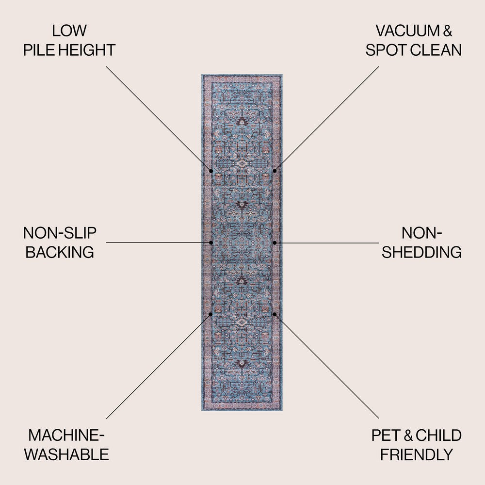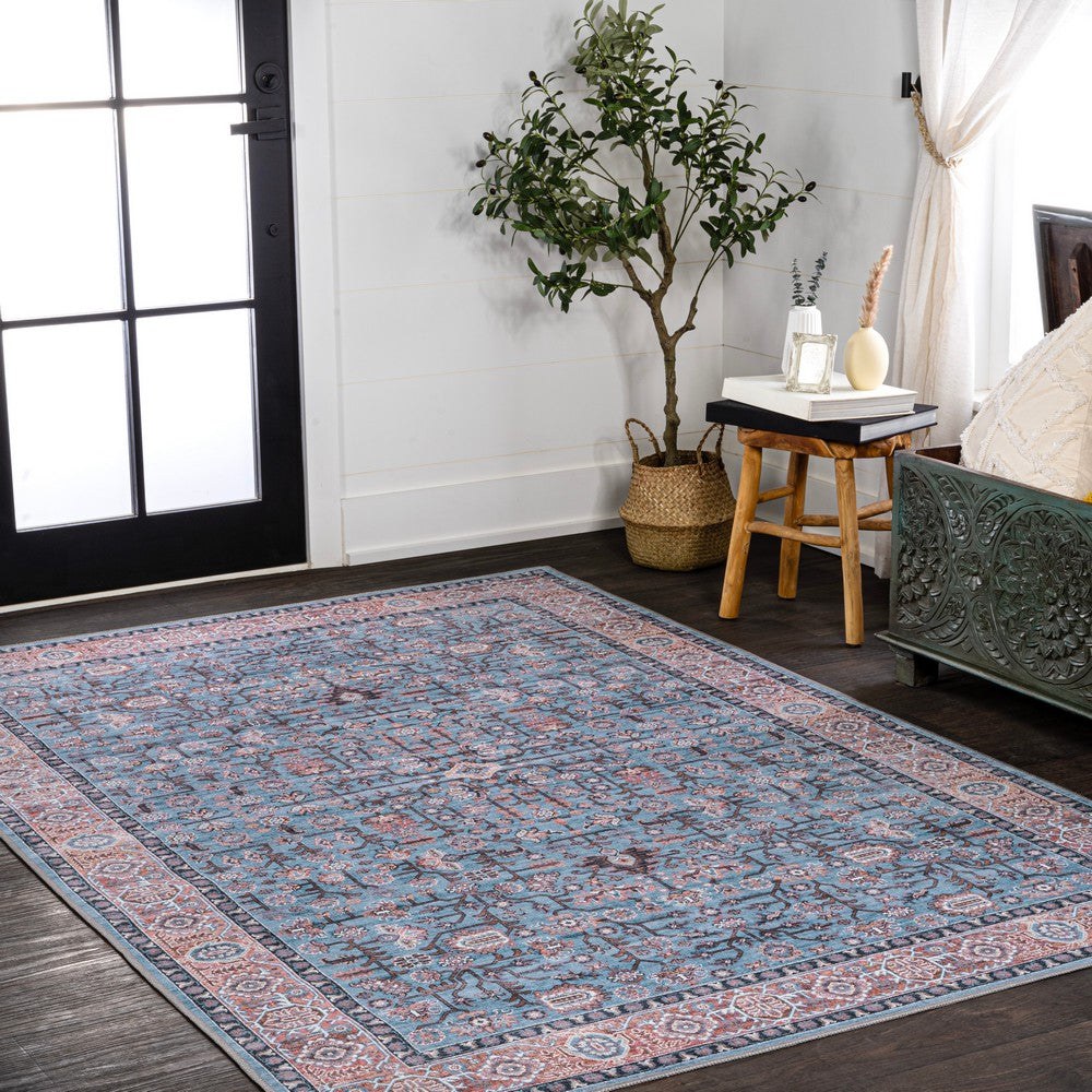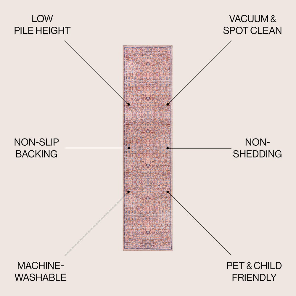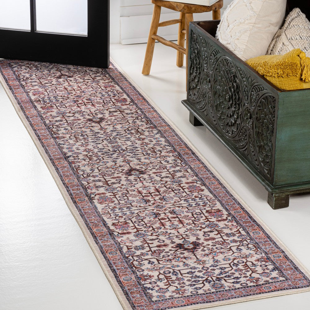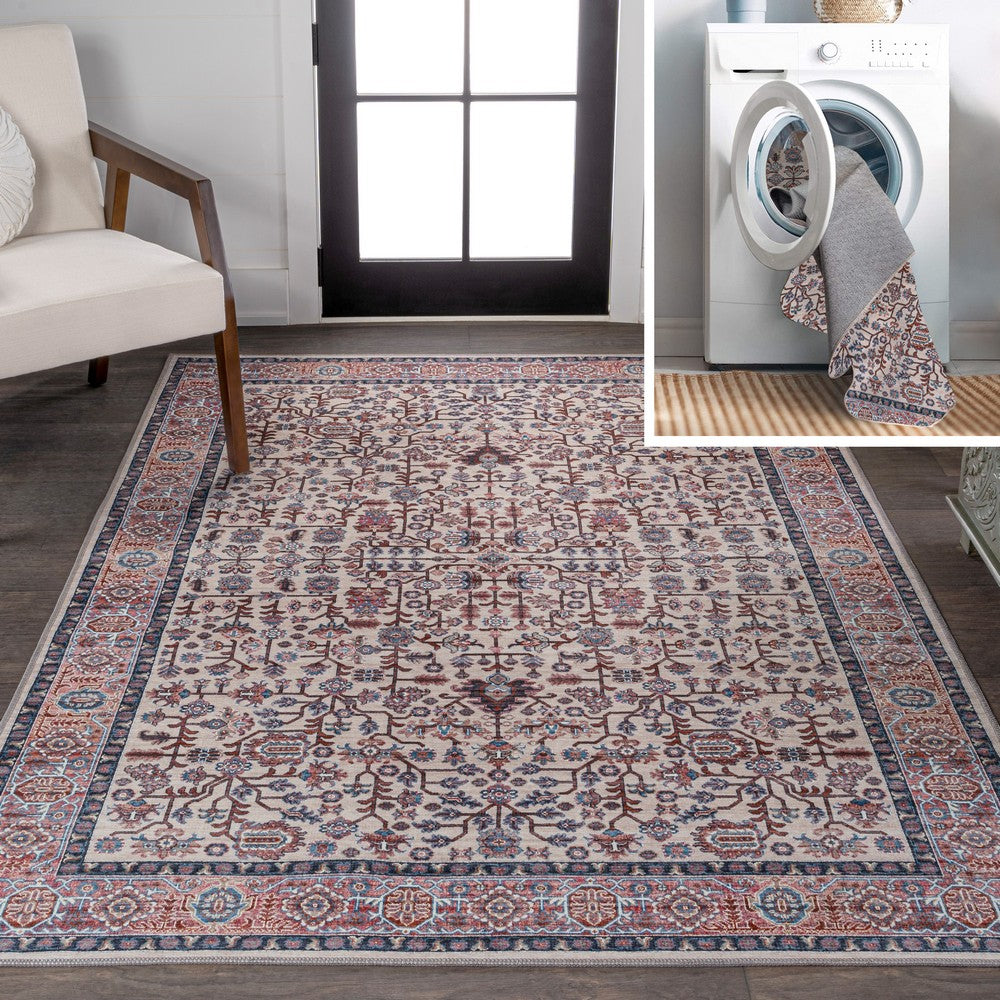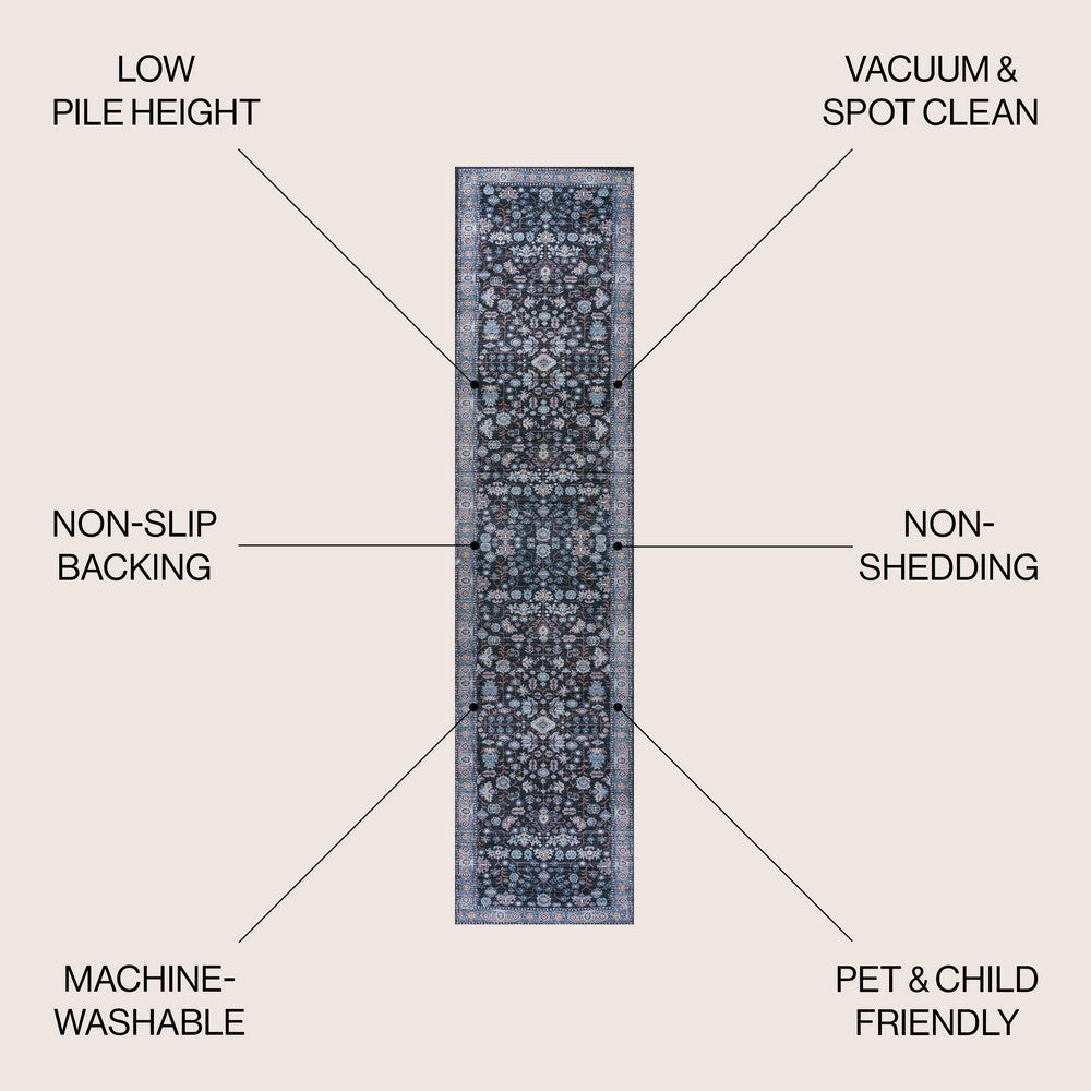 Stylized vines and flowers in the center of this rug's design recall ancient Persian rug designs. Updated colors add a modern Bohemian-inspired twist to a classic design. With its pet-friendly pattern, this easy-care rug would be perfect for a dining room, living room, entry, bedroom or porch.