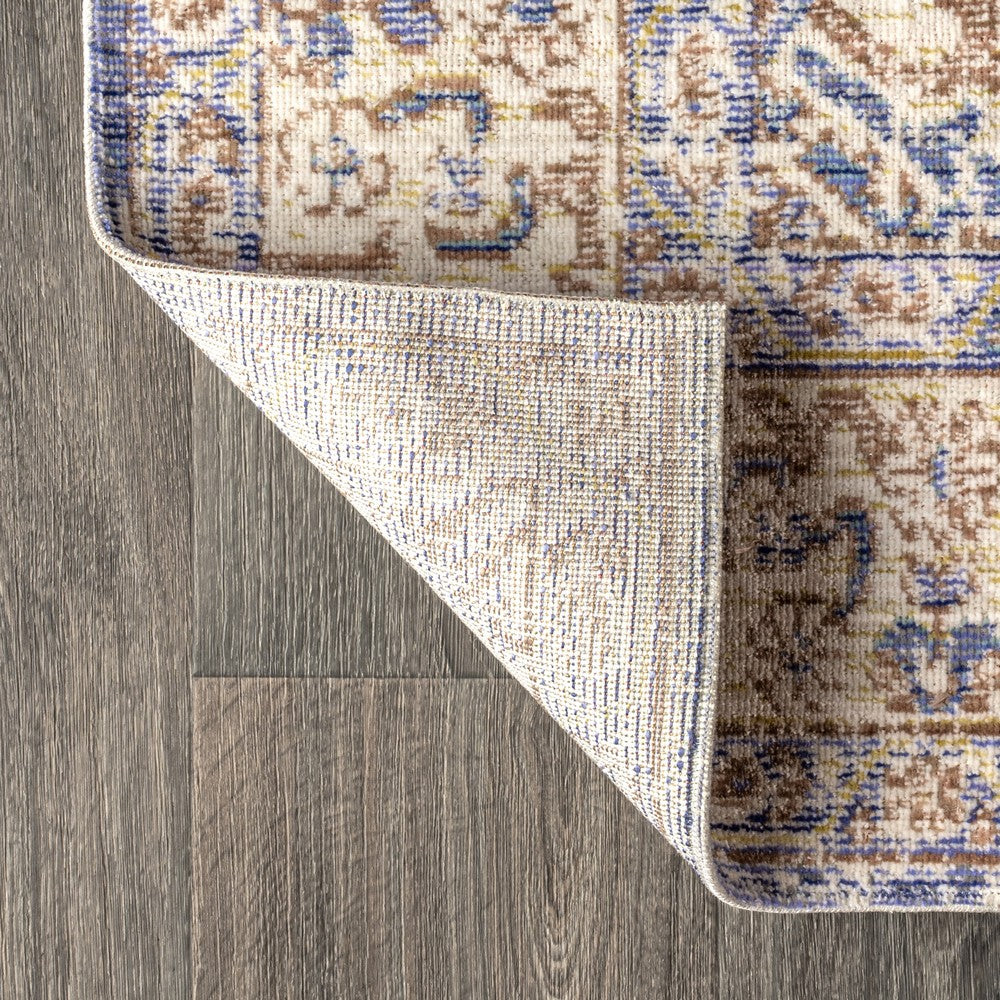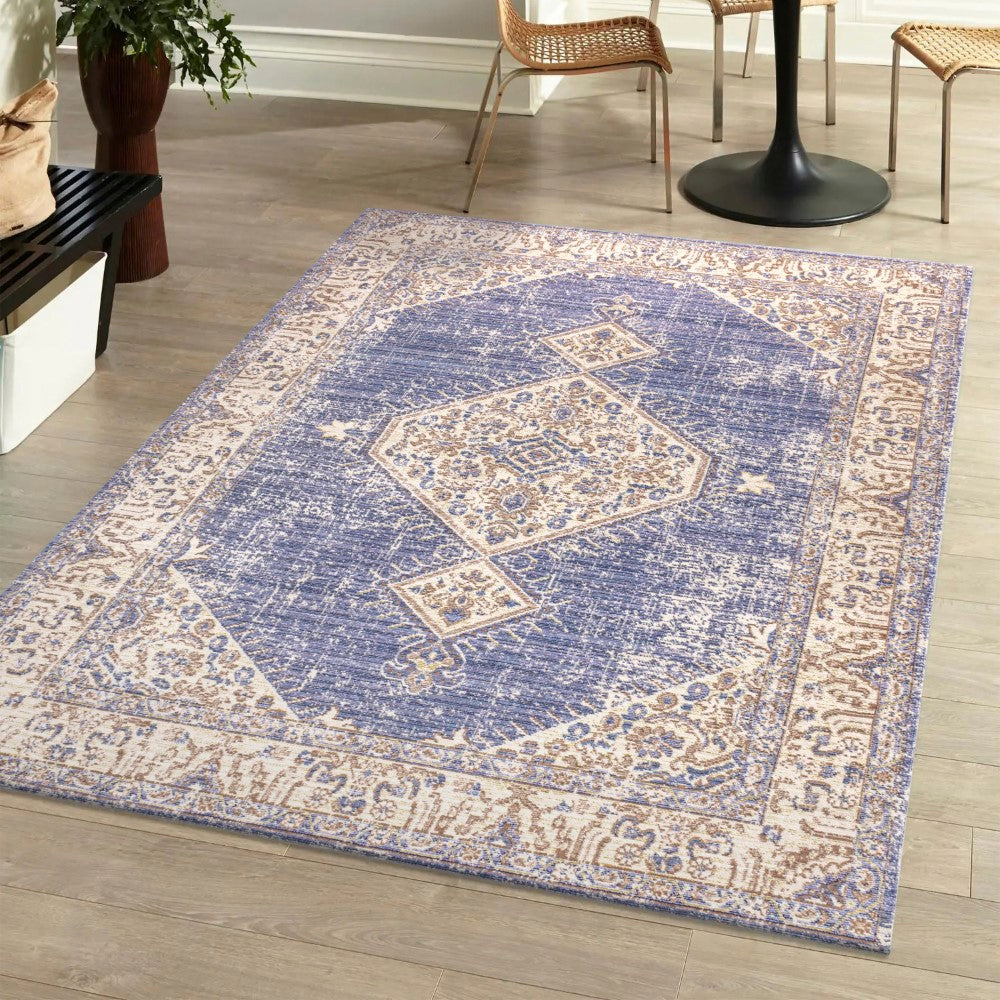 Three diamond-shaped medallions in the center of this design recall ancient geometric tribal rugs. The deep ivory and neutral color scheme adds a modern twist. With its Bohemian-inspired, distressed look, this rug would be perfect for a dining room, living room, entry or bedroom.