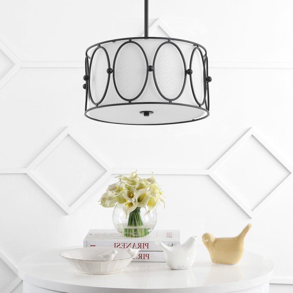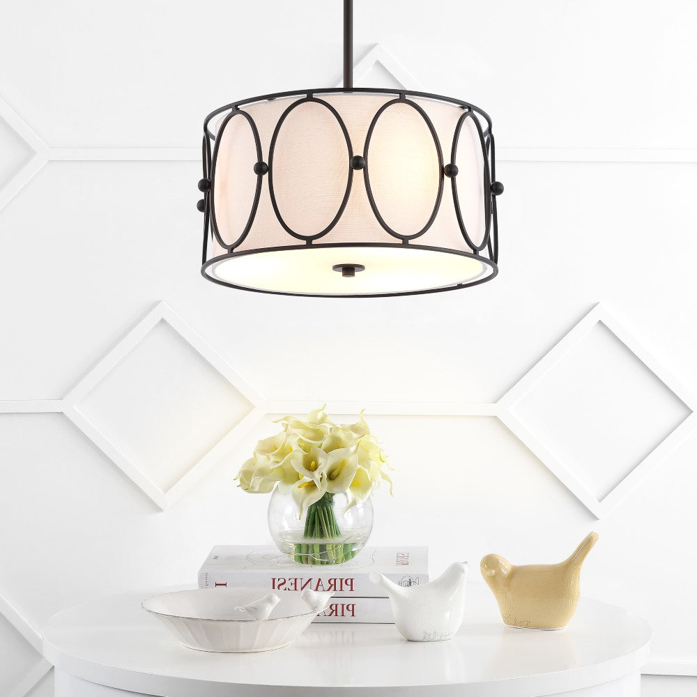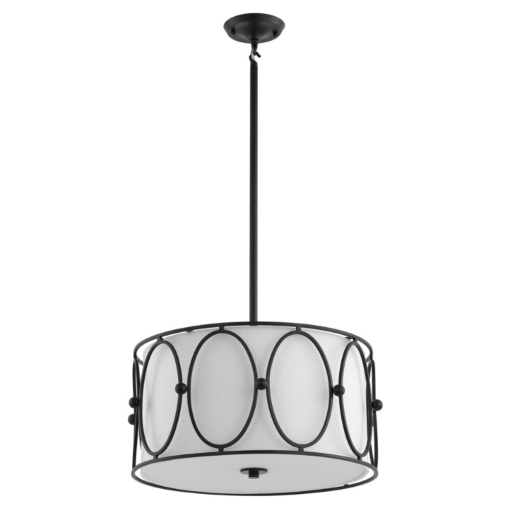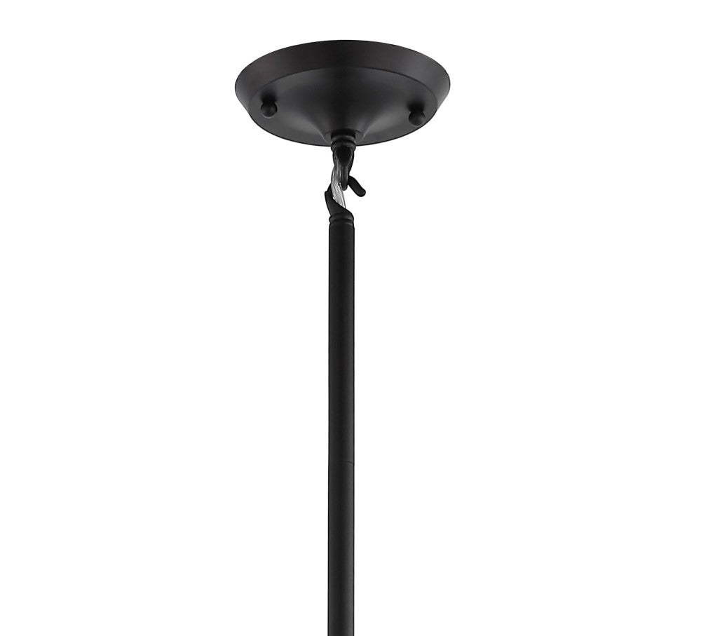 A hoop and ball design artfully adorns this feminine pendant in linen and bronze colored metal. The rod delicately hooks to the ceiling canopy and can range from 19" to 49" in drop depending on how many rods you use. The plastic cord is easily connected to your home's electrical grid by a licensed electrician.