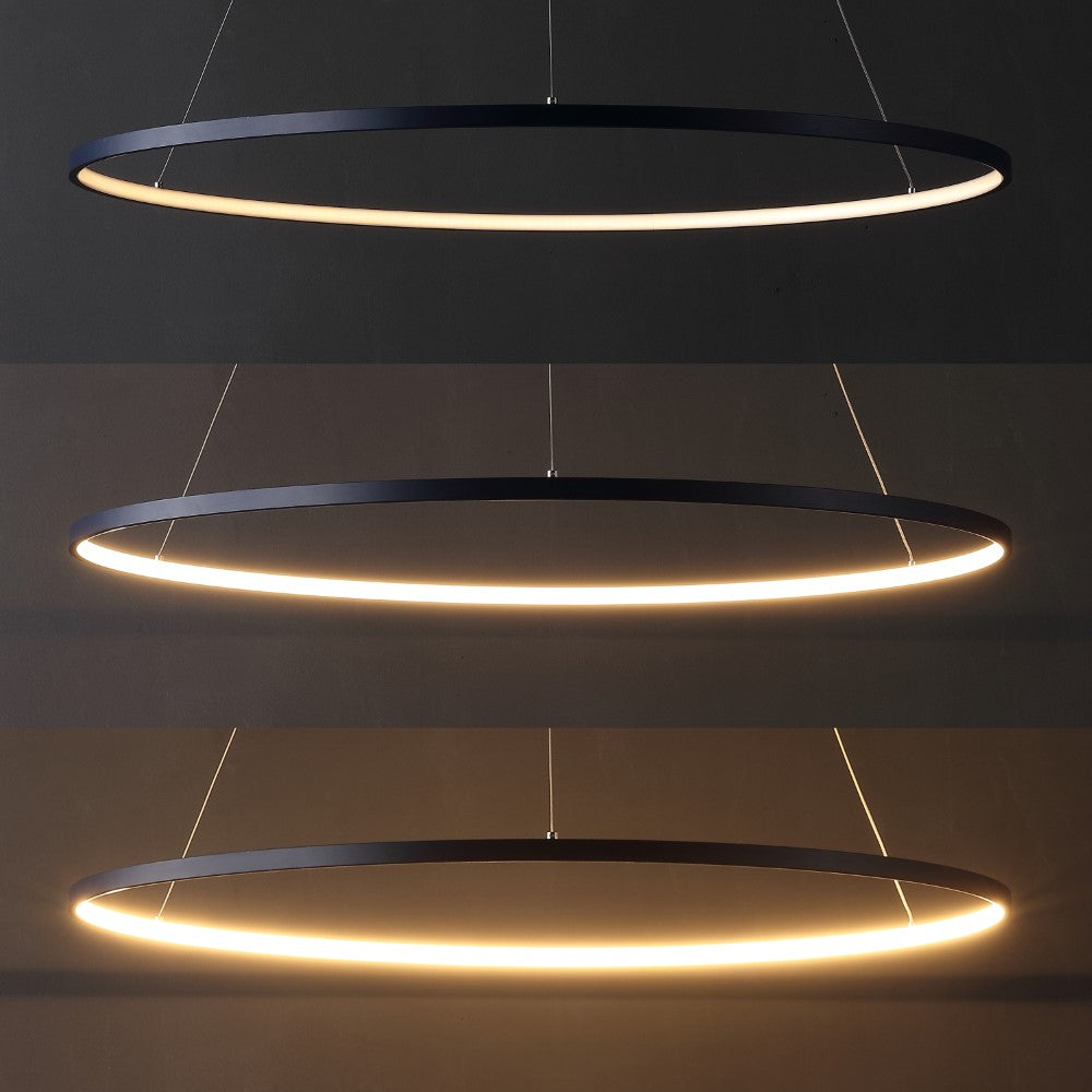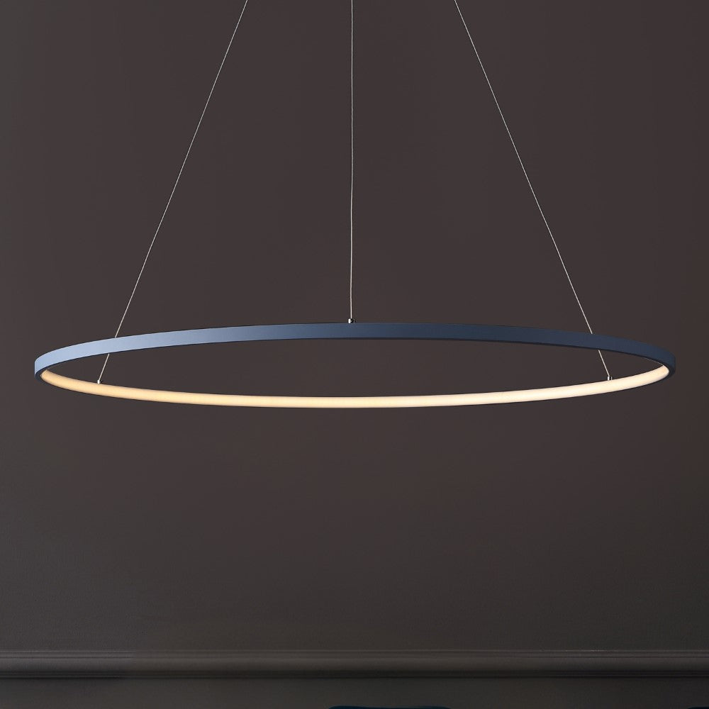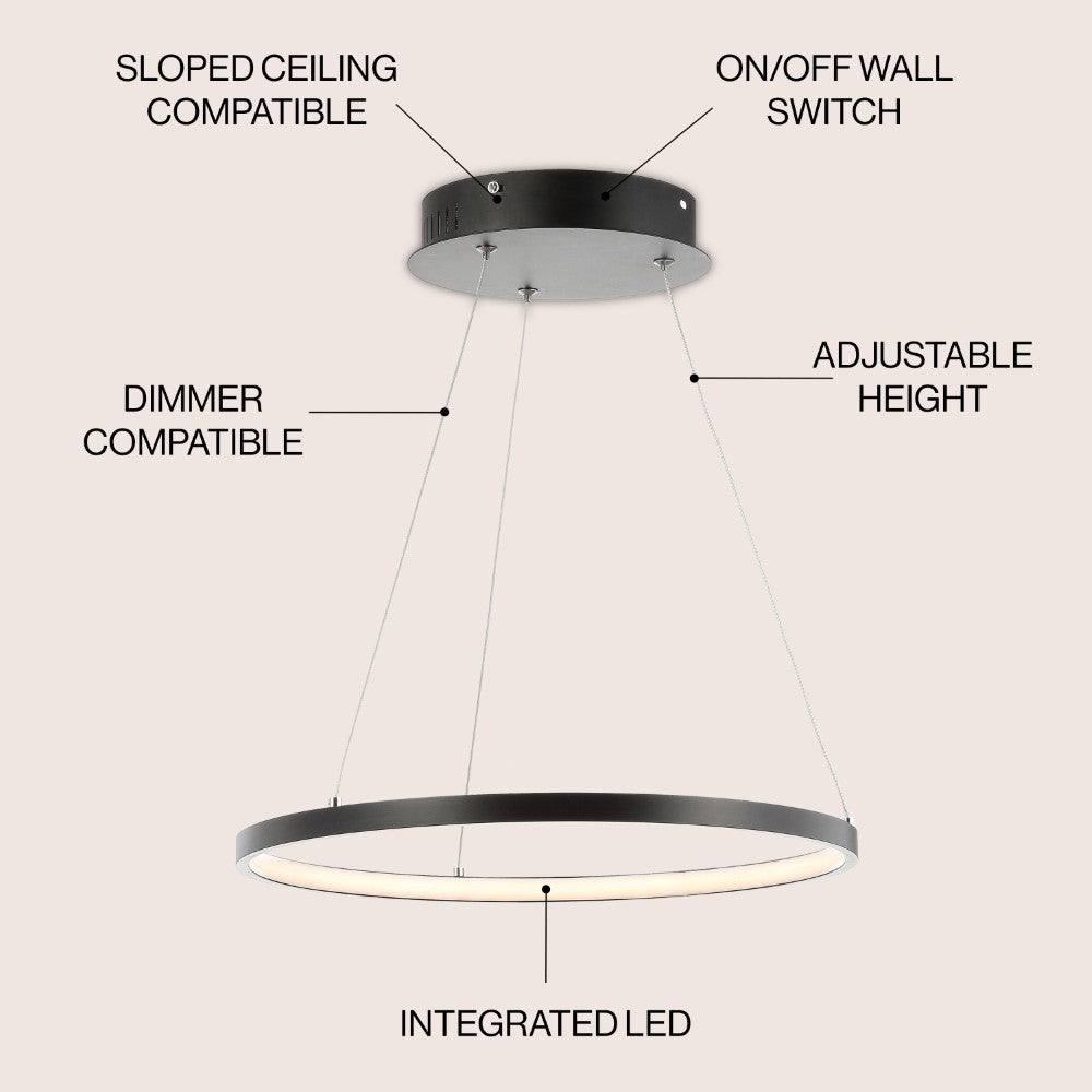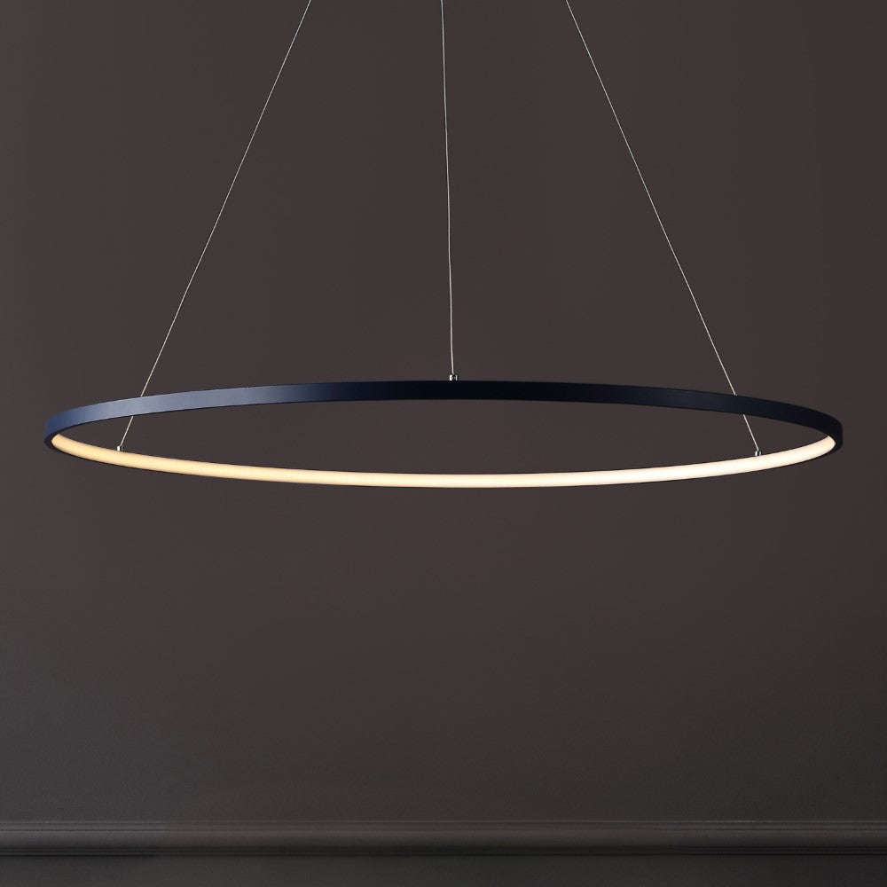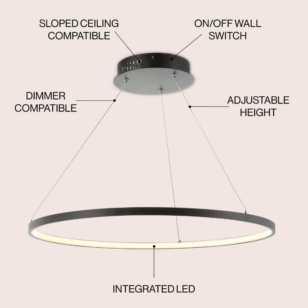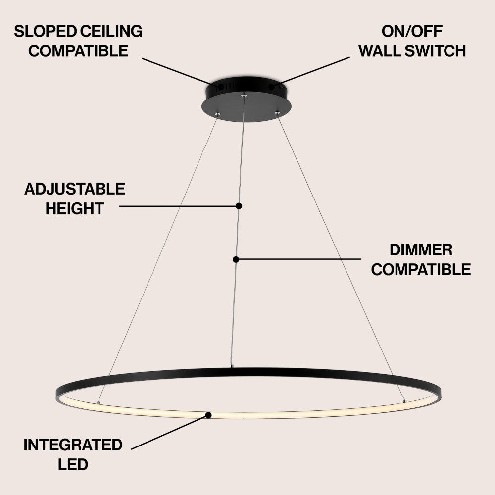 A single hoop with a matte black finish is suspended with three wires in this modern hoop pendant light. An integrated single-light LED lines its interior illuminating any space with a balance of brightness and warmth. Ideal for any modern setting, it will look right at home over a kitchen island or dining area.