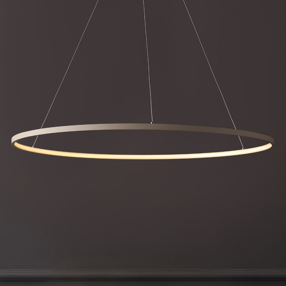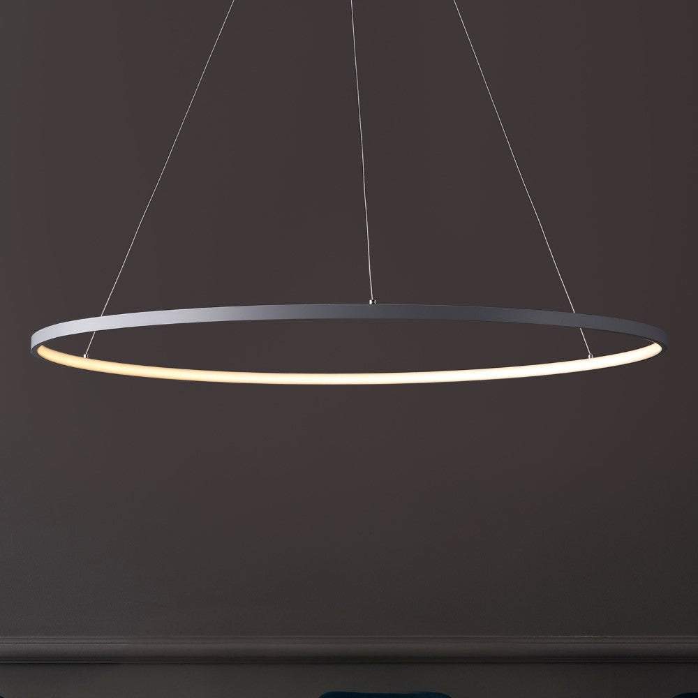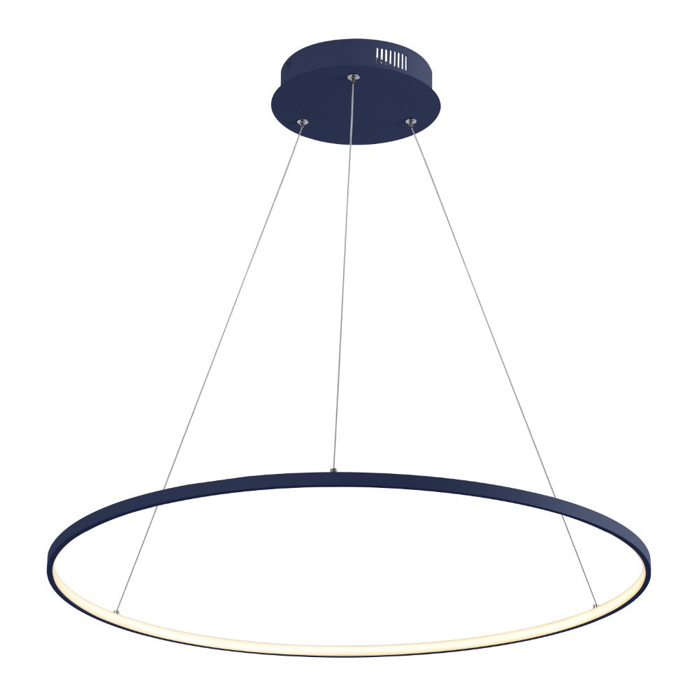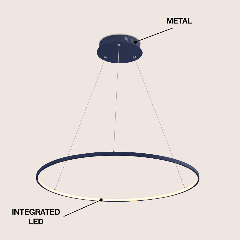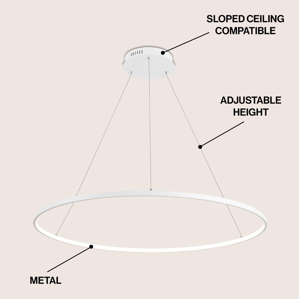 A single hoop with a matte black finish is suspended with three wires in this modern hoop pendant light. An integrated single-light LED lines its interior illuminating any space with a balance of brightness and warmth. Ideal for any modern setting, it will look right at home over a kitchen island or dining area.
