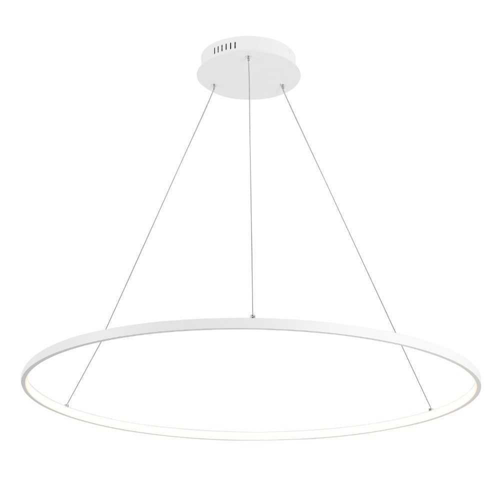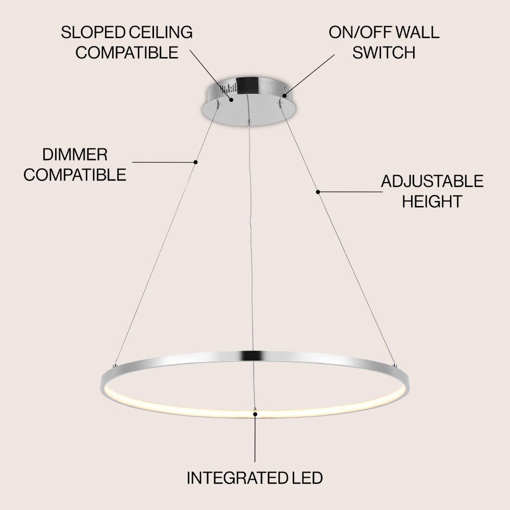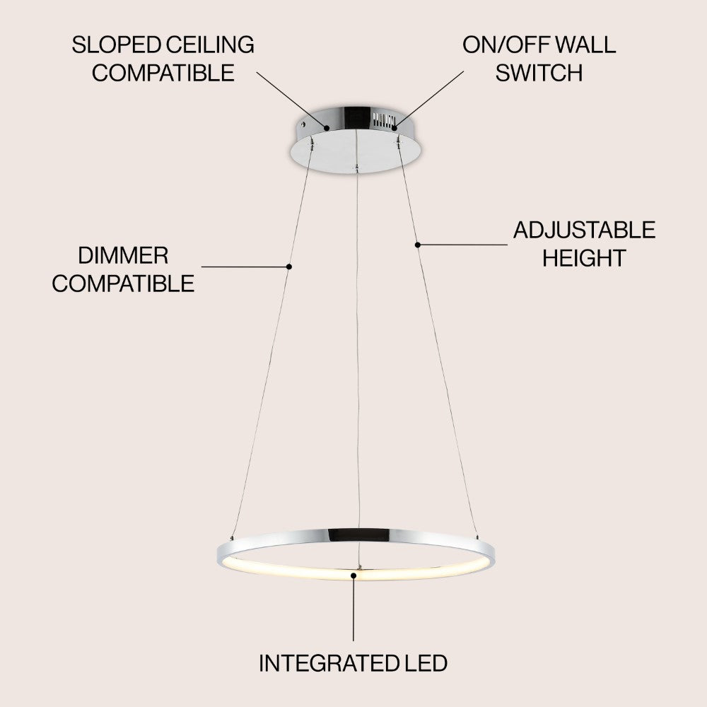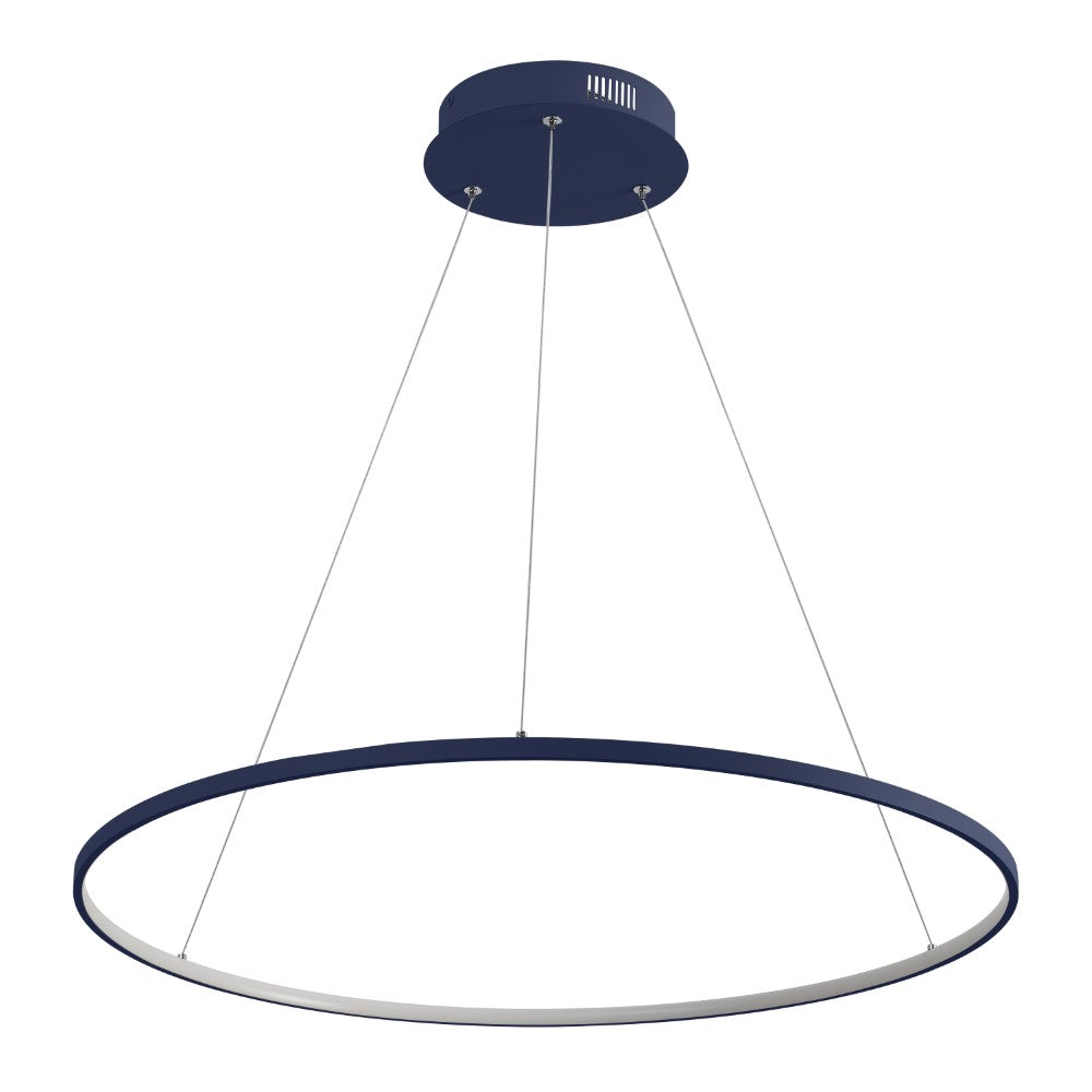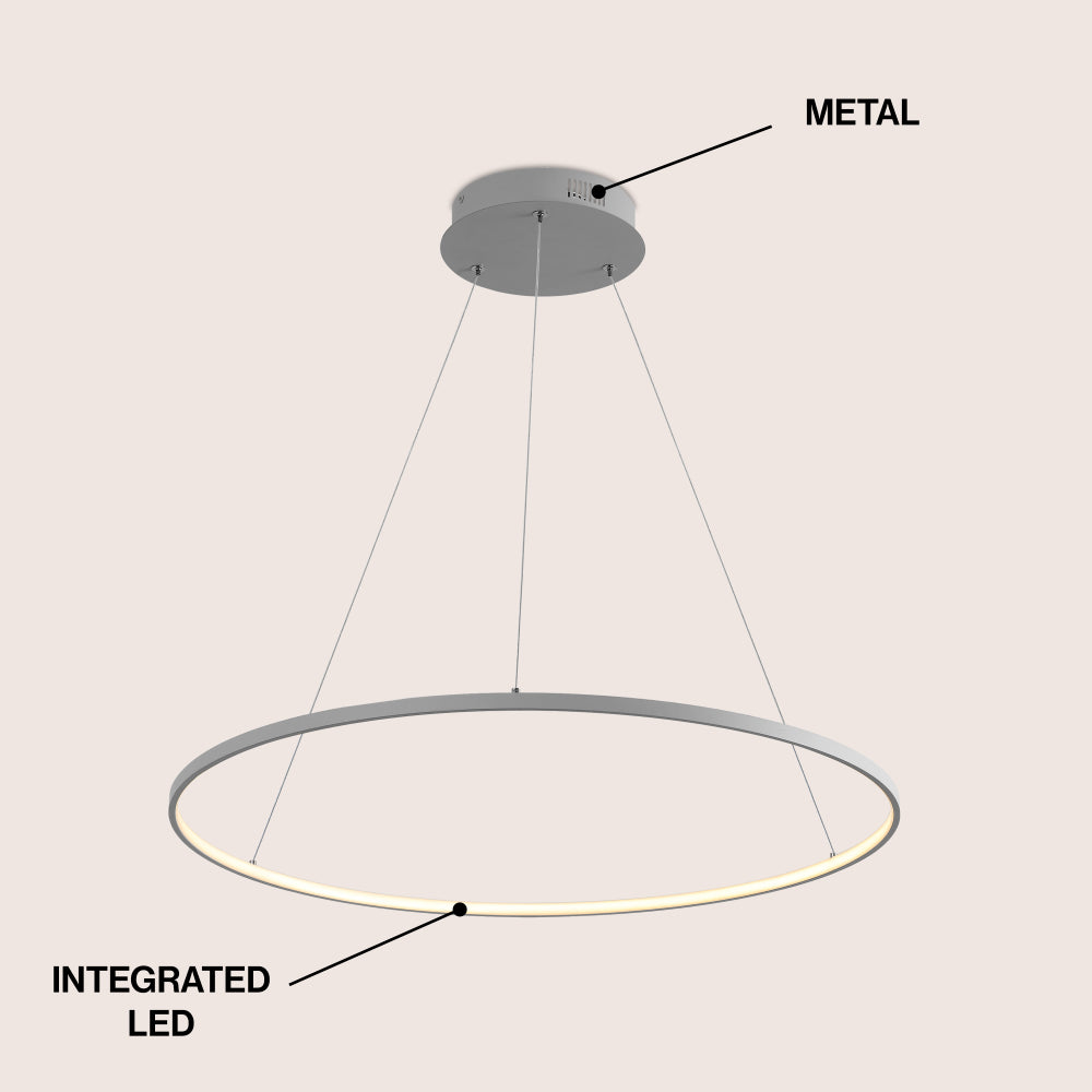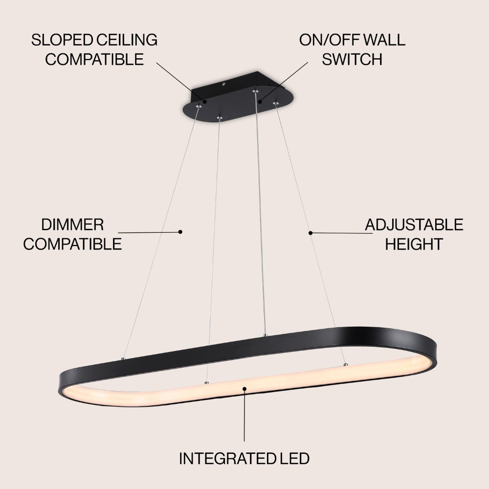 A single hoop with a matte black finish is suspended with three wires in this modern hoop pendant light. An integrated single-light LED lines its interior illuminating any space with a balance of brightness and warmth. Ideal for any modern setting, it will look right at home over a kitchen island or dining area.