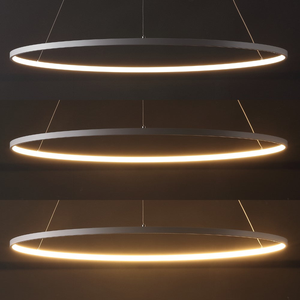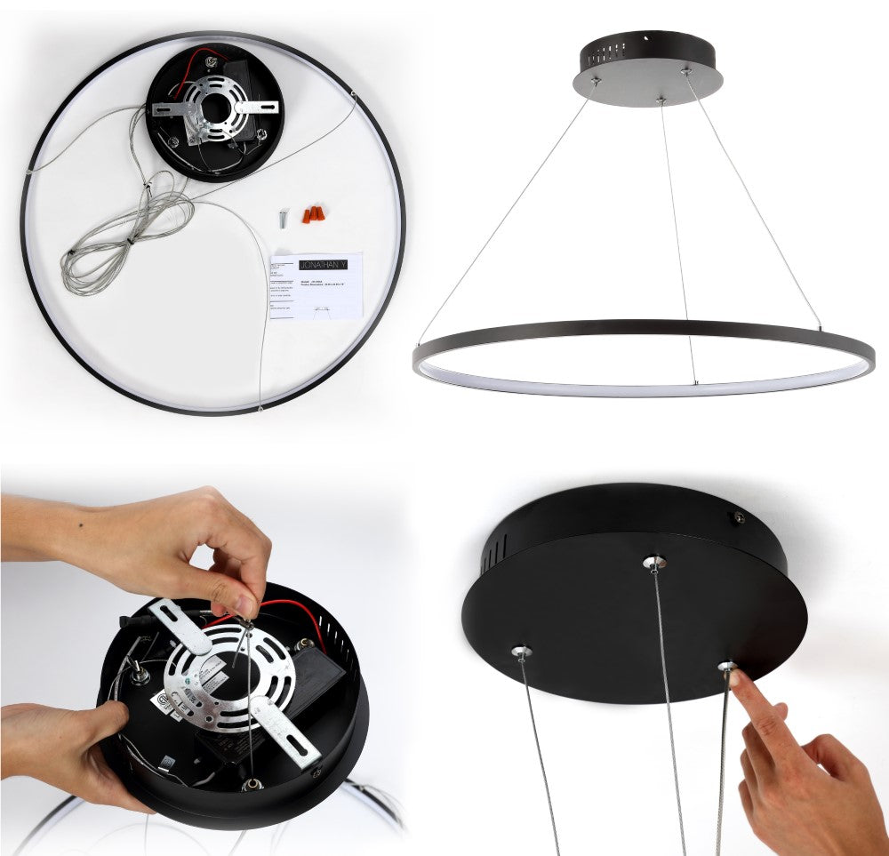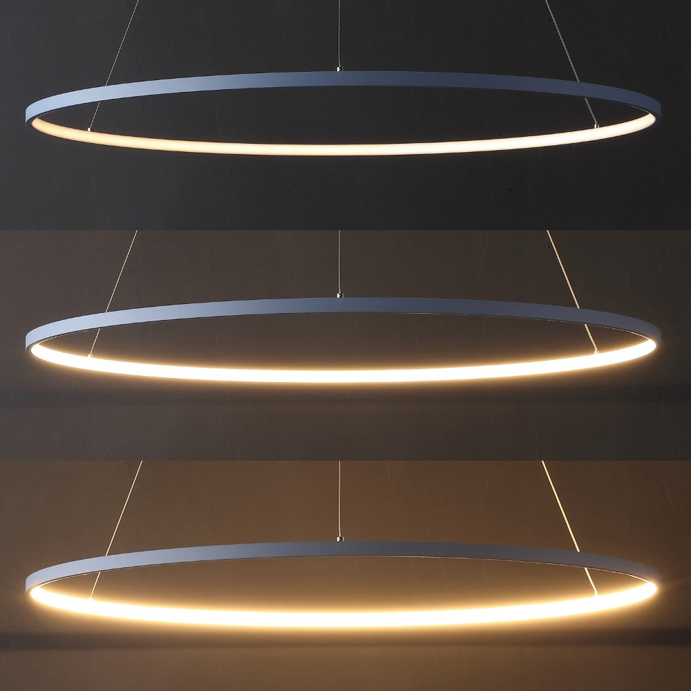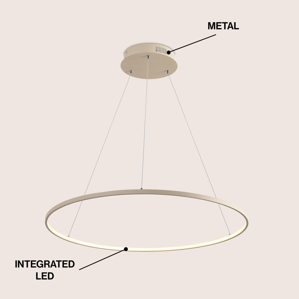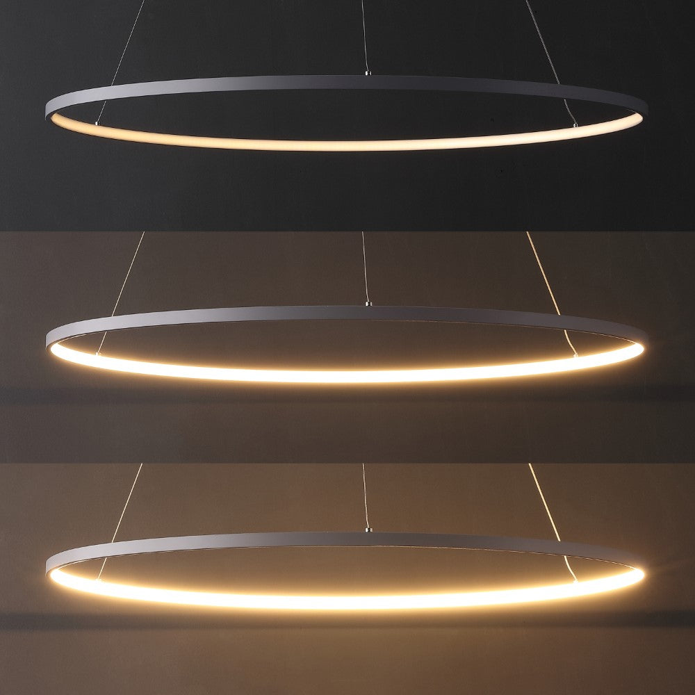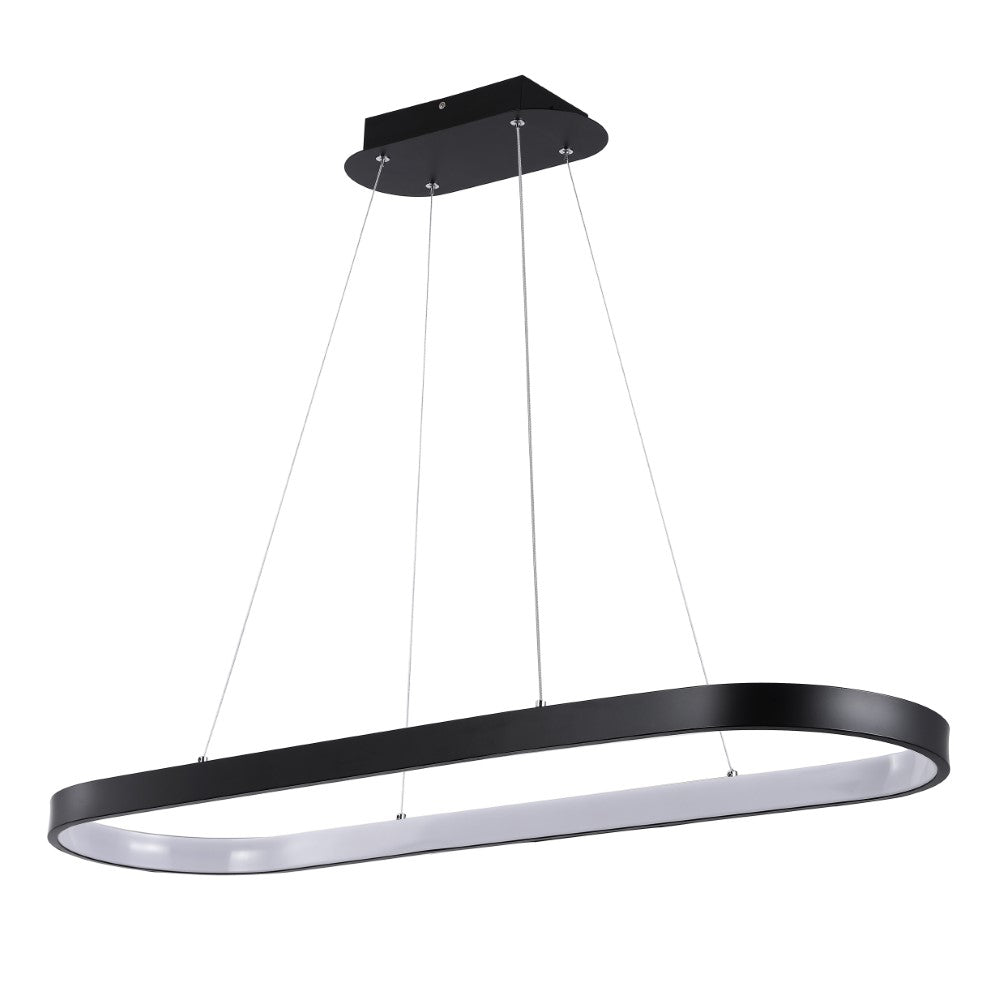A single hoop with a matte black finish is suspended with three wires in this modern hoop pendant light. An integrated single-light LED lines its interior illuminating any space with a balance of brightness and warmth. Ideal for any modern setting, it will look right at home over a kitchen island or dining area.