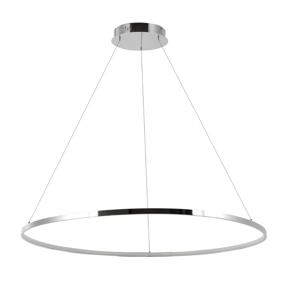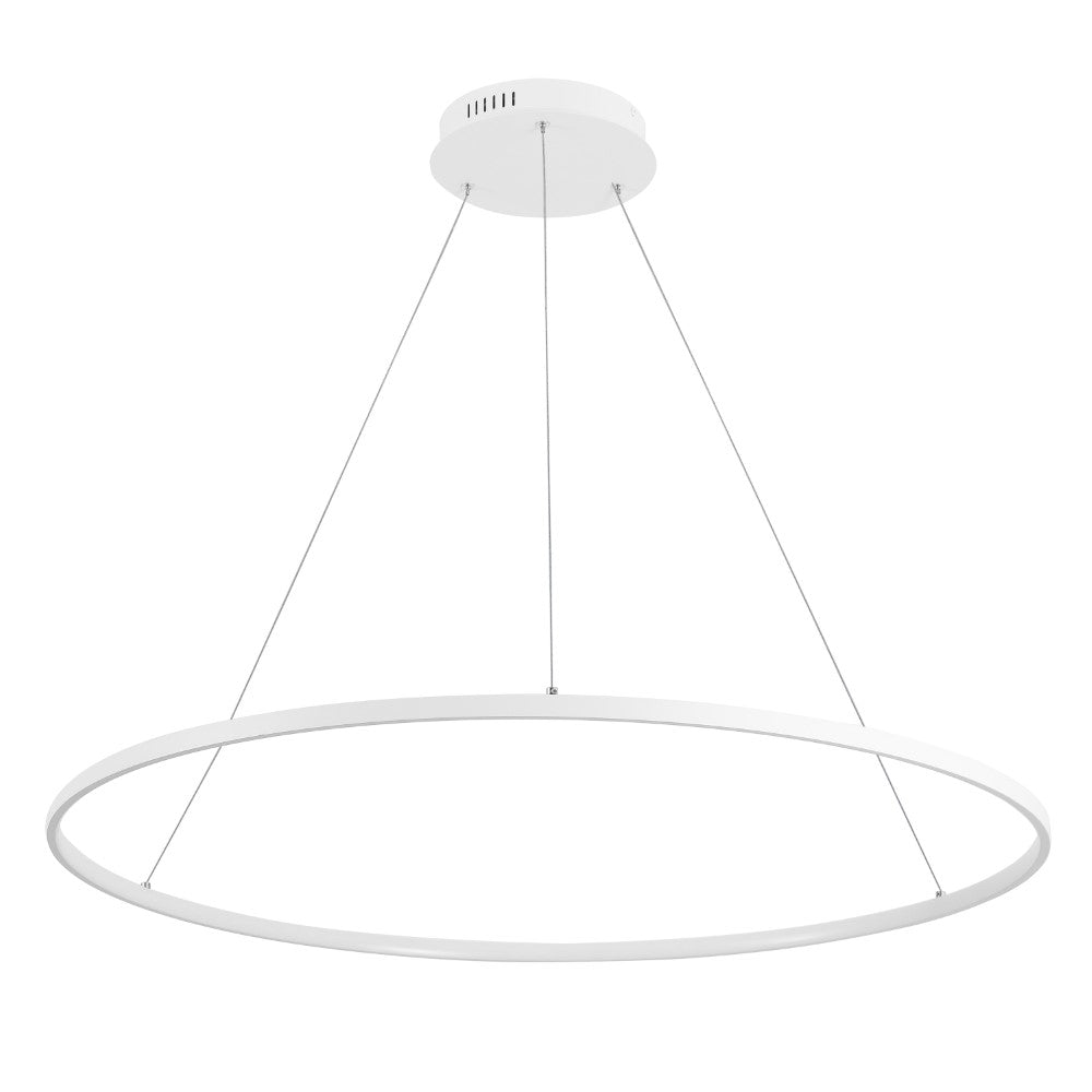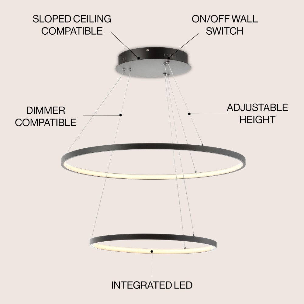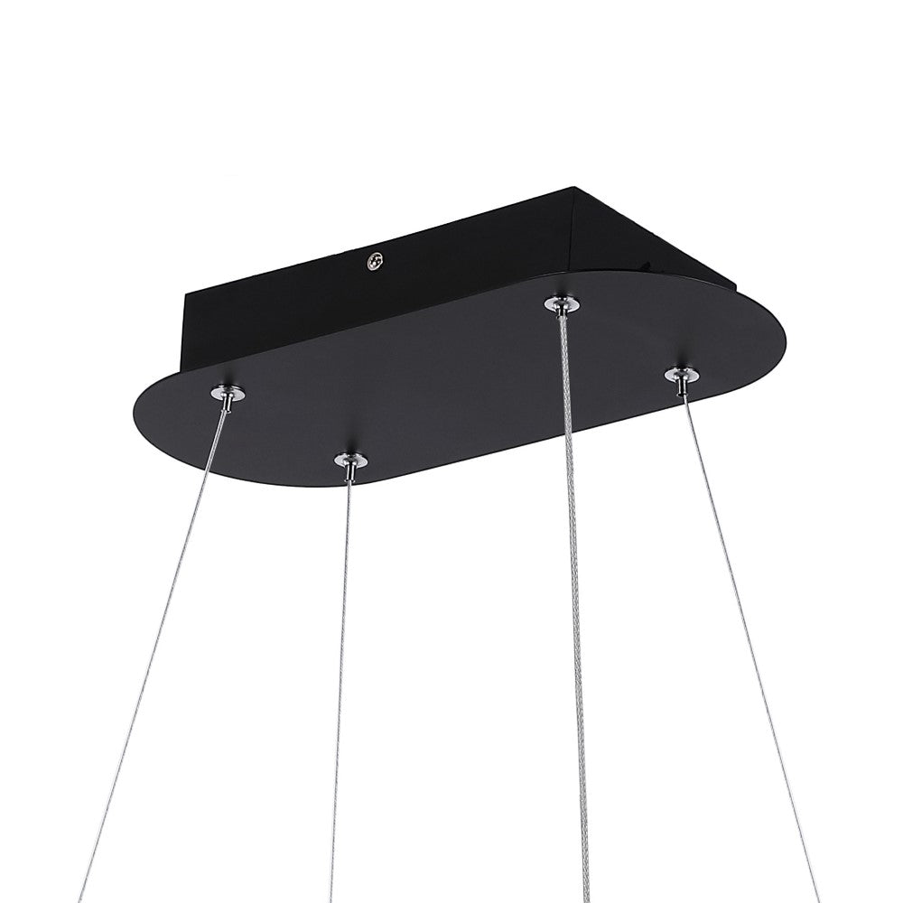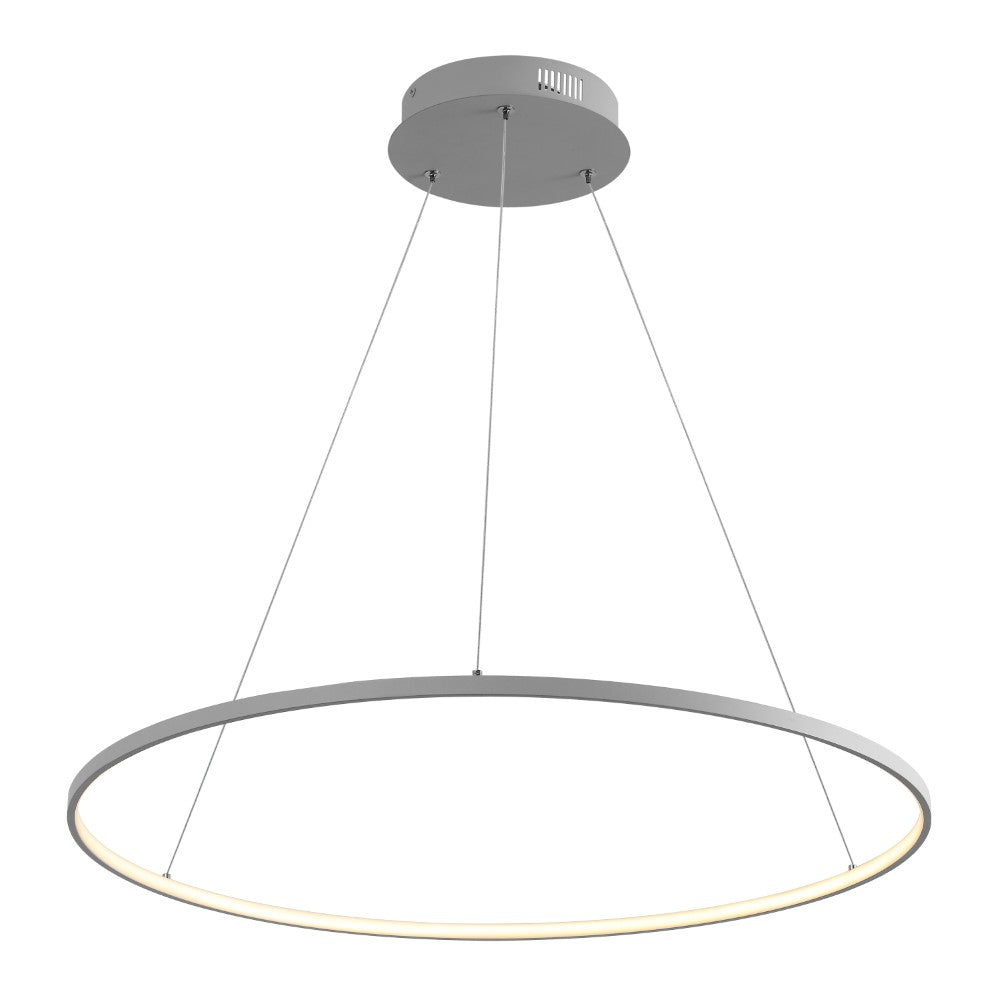 A single hoop with a matte black finish is suspended with three wires in this modern hoop pendant light. An integrated single-light LED lines its interior illuminating any space with a balance of brightness and warmth. Ideal for any modern setting, it will look right at home over a kitchen island or dining area.