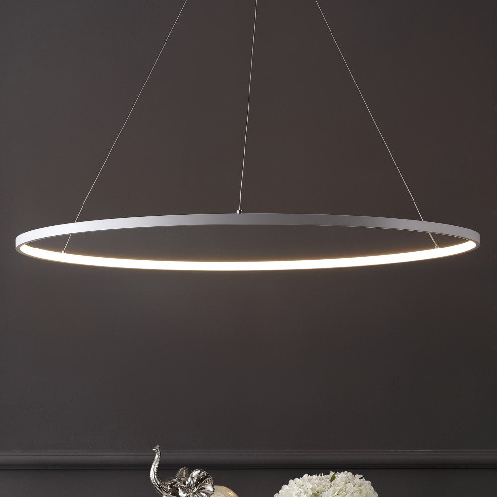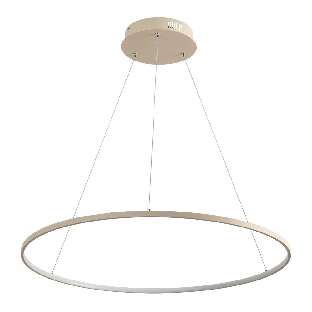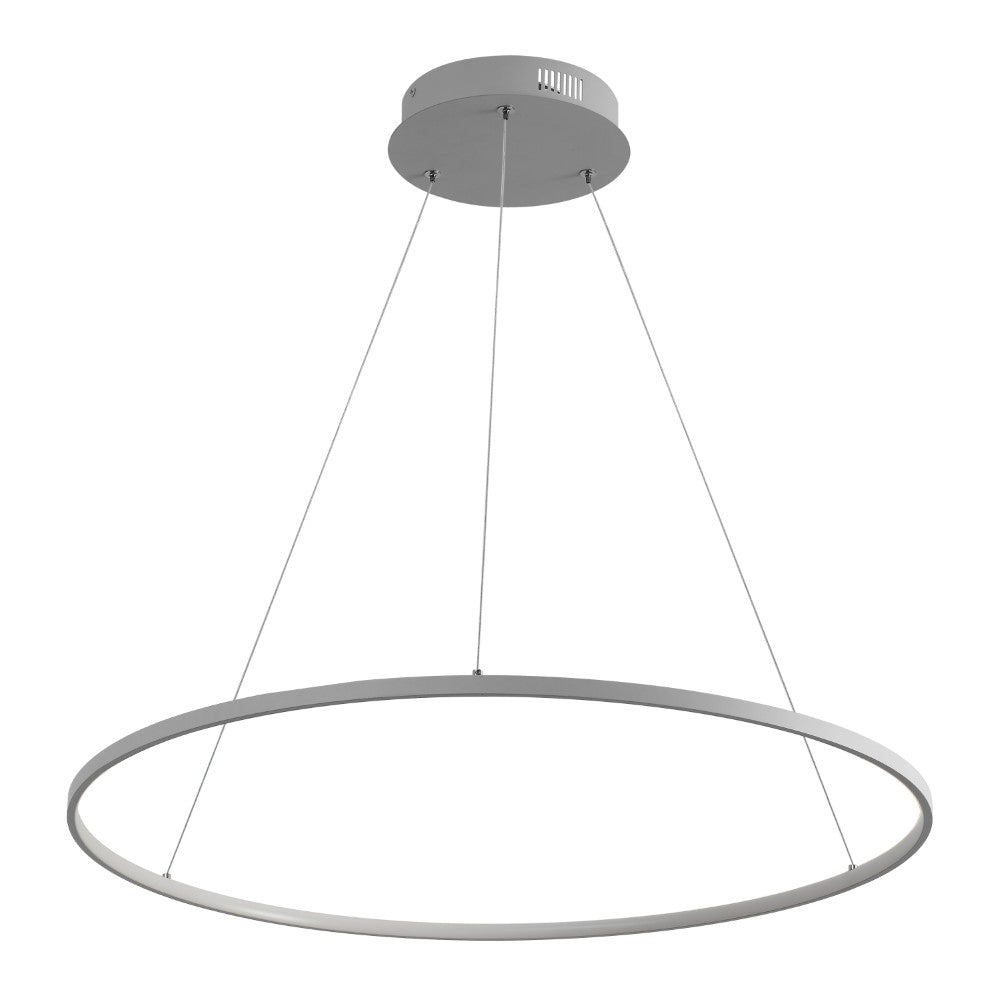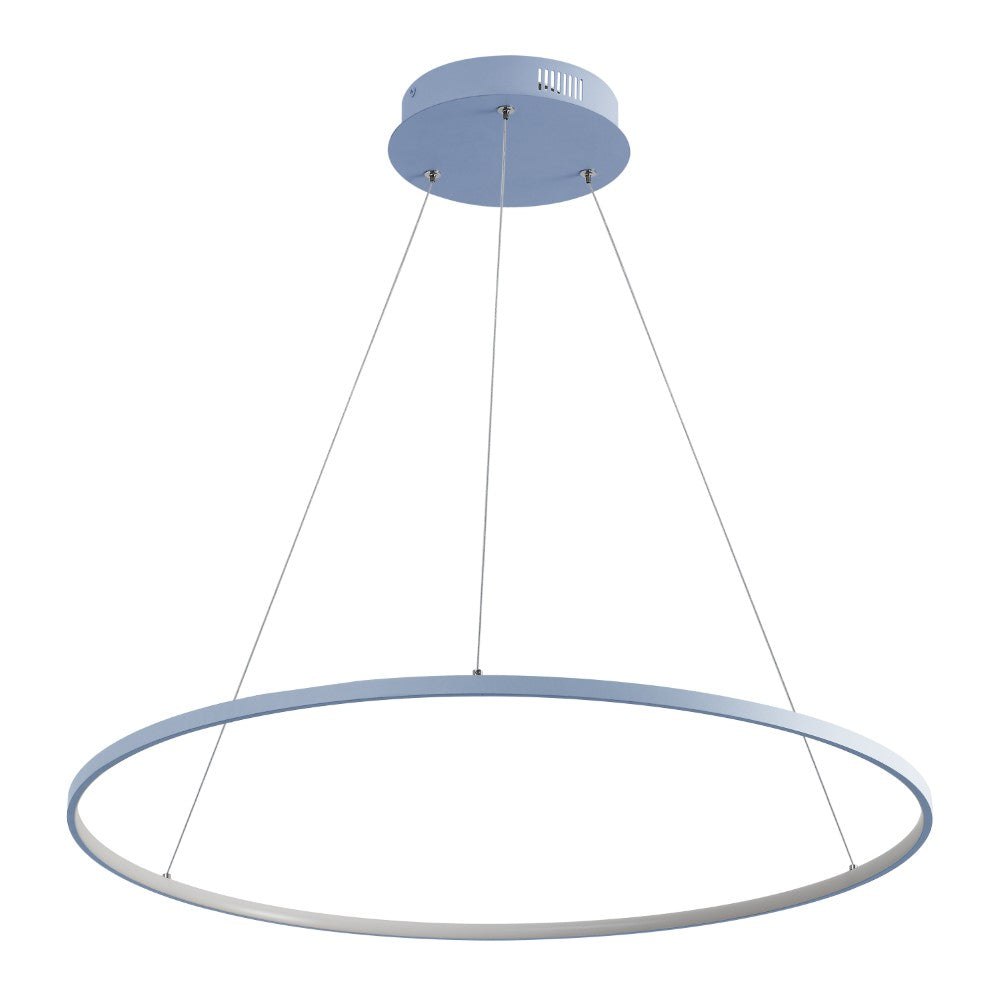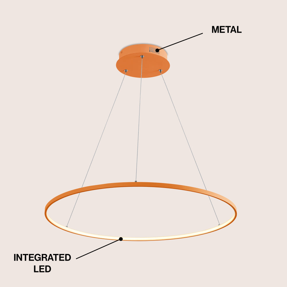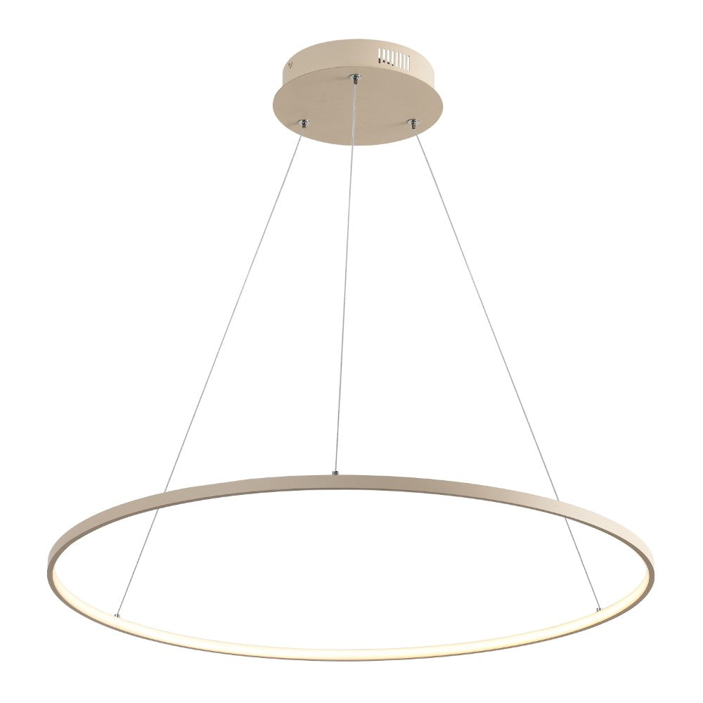 A single hoop with a matte black finish is suspended with three wires in this modern hoop pendant light. An integrated single-light LED lines its interior illuminating any space with a balance of brightness and warmth. Ideal for any modern setting, it will look right at home over a kitchen island or dining area.