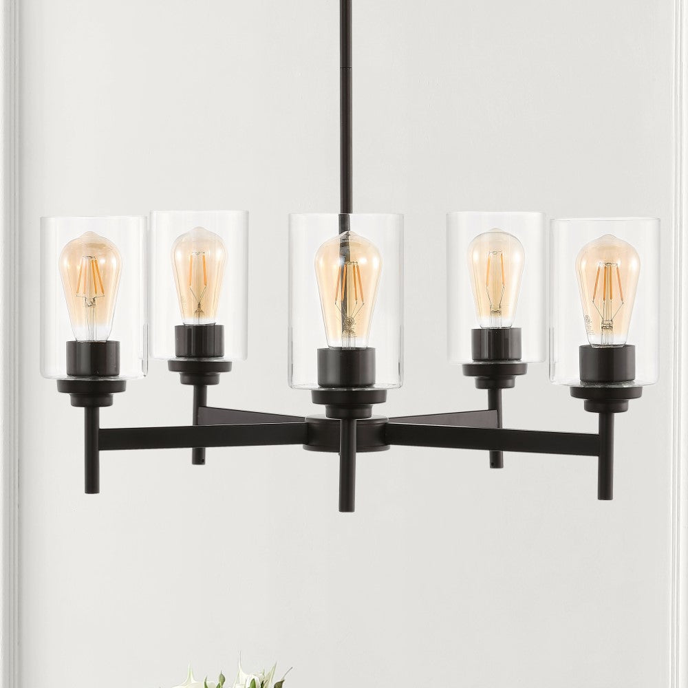 Add vintage flair with our classic industrial-style ceiling fixture. Five Edison-style LED bulbs are encased in clear glass cylinders to provide plenty of light. Clean lines and a bronze finish add a rustic-modern touch to a kitchen, dining room, or entry.