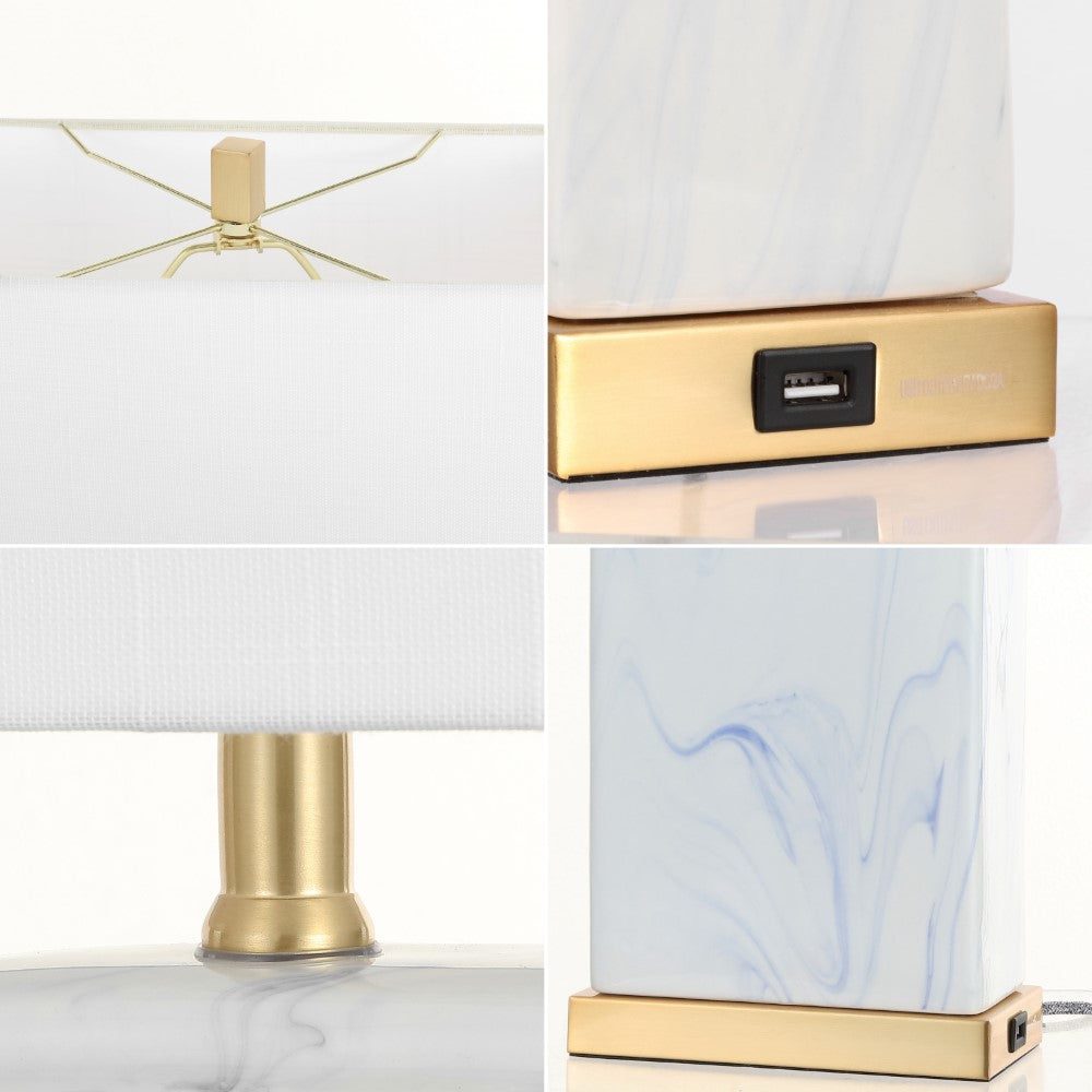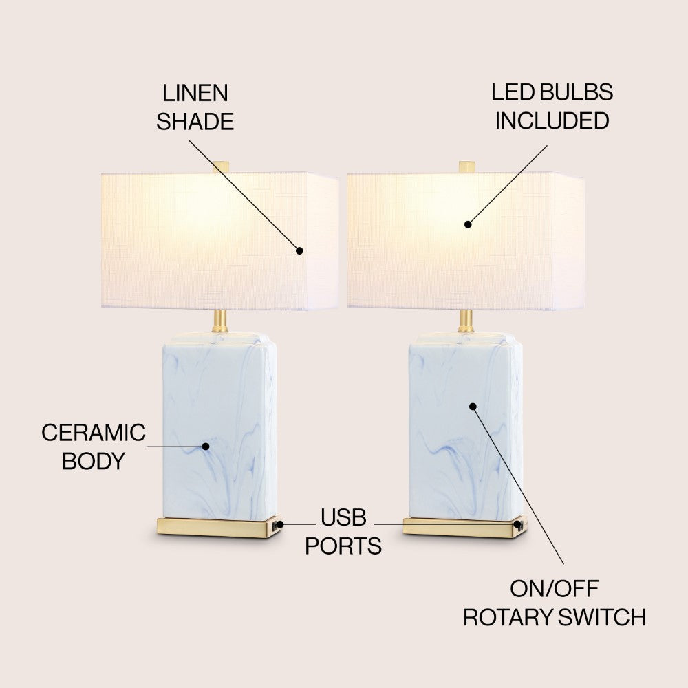 This chic pair of marbled ceramic lamps adds modern cottage style to any space. Rectangular shades are a perfect fit for a dining room console or bedroom chest. The handy USB charging ports make them ideal for vacation homes too.