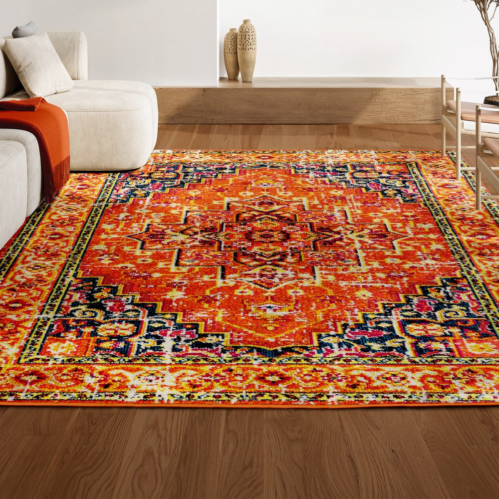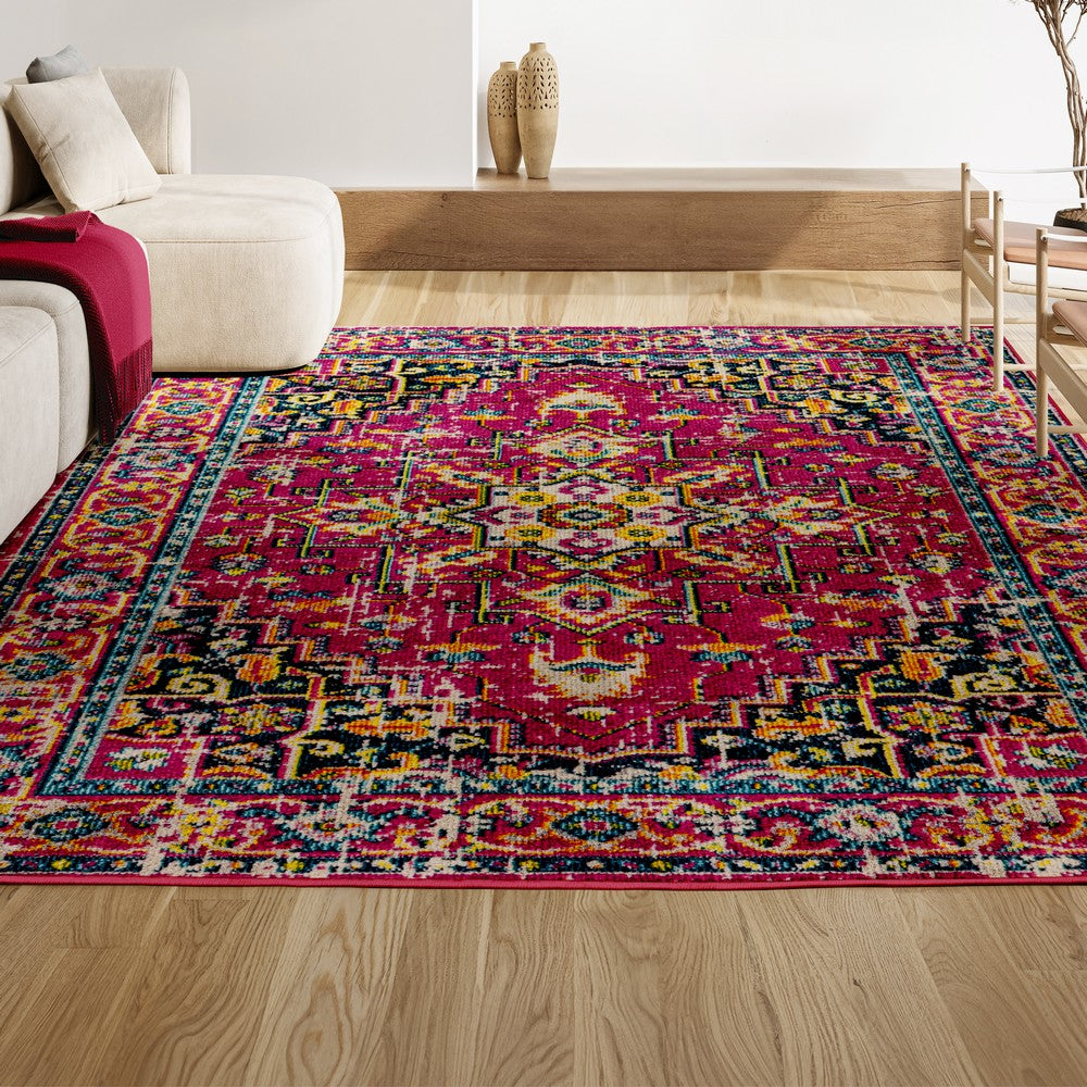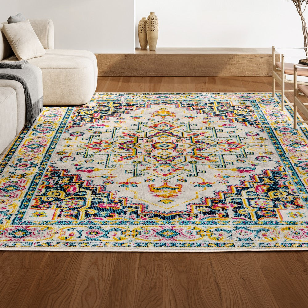 This rug's jewel colors and rich pattern add a Bohemian touch to your modern loft, farmhouse or cottage. With its kid-friendly busy pattern, this rug is ideal for a kitchen, living room, den, bedroom or entry. A deep blue, geometric central medallion, surrounded by bold color accents gives this rug standout style.