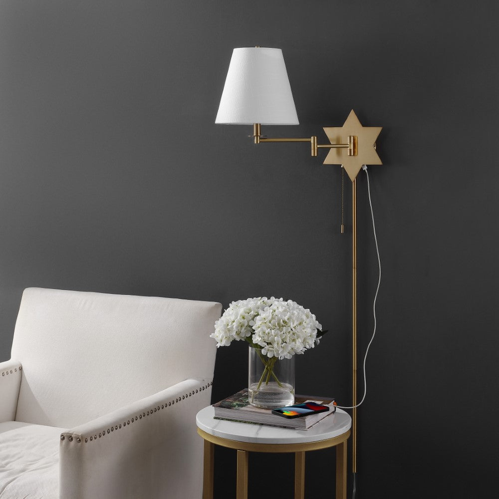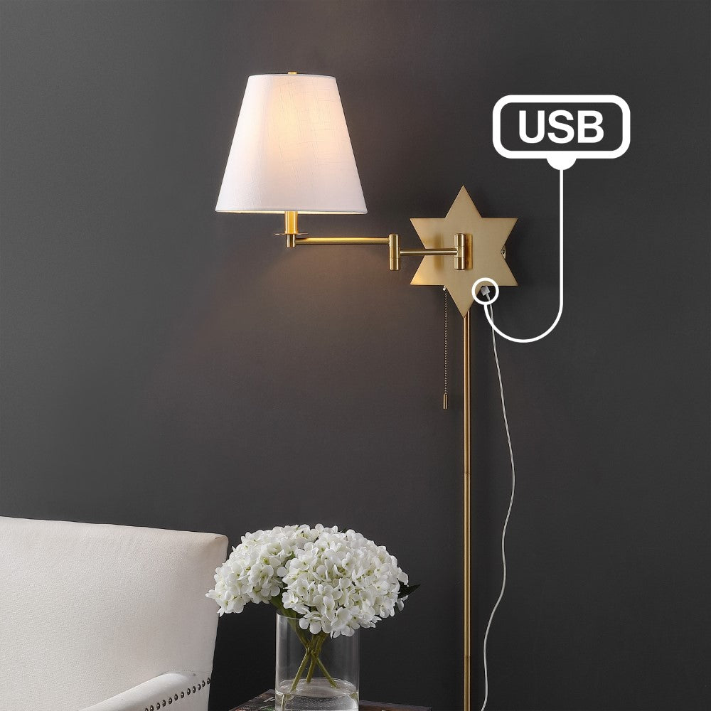 With a versatile design, this contemporary swing-arm sconce can be plugged in or hardwired in any space. With a unique star design on its base and light cotton shade, this sconce adds an element of glam to any bedroom or living area. Even with its vintage aesthetic, this sconce boasts an easy-to-use USB port for the charging of mobile devices.