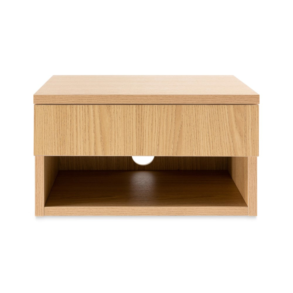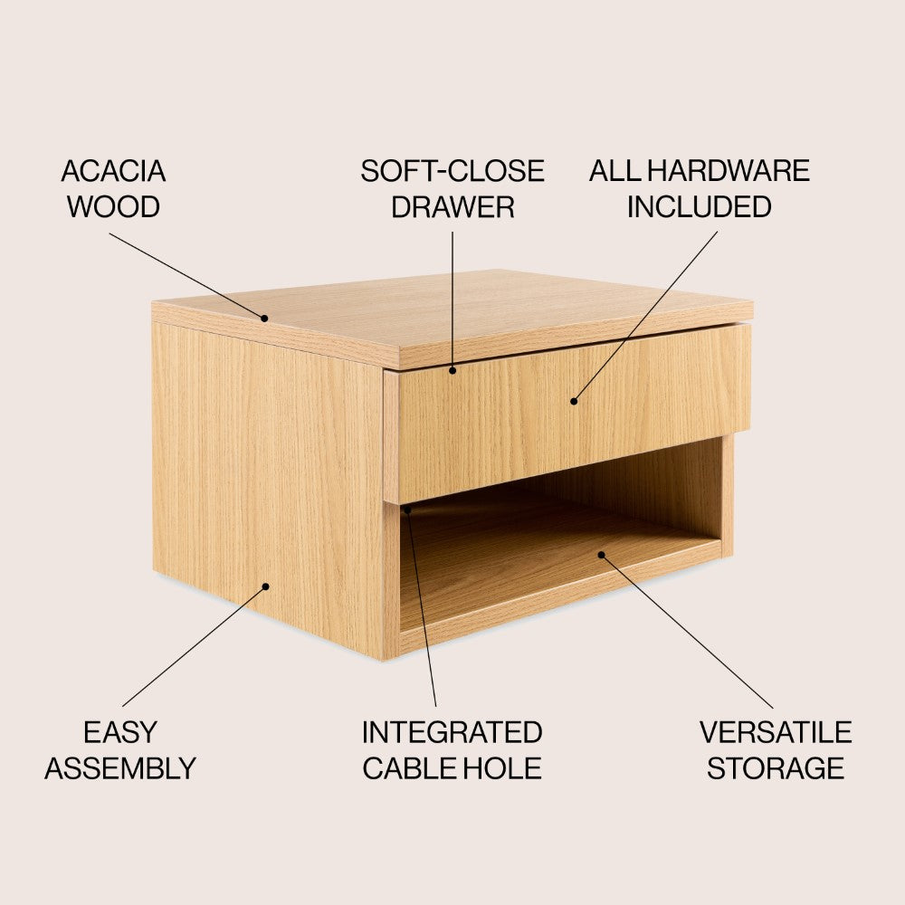 • Easy to install, this minimalist bedside table has a soft-closing drawer for essentials, built-in cable hole for convenient wire management, and an open shelf for books