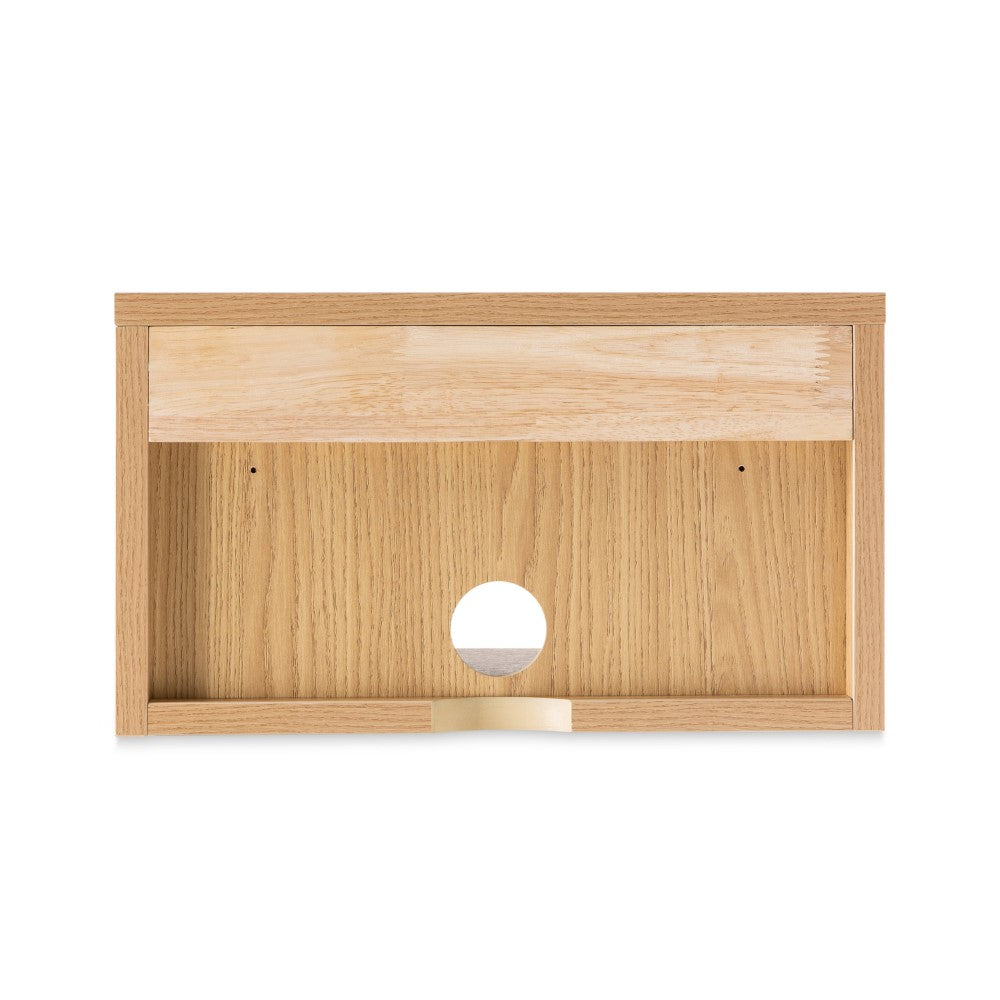 - Easy to install, this minimalist bedside table has a soft-closing drawer for essentials, built-in cable hole for convenient wire management, and an open shelf for books