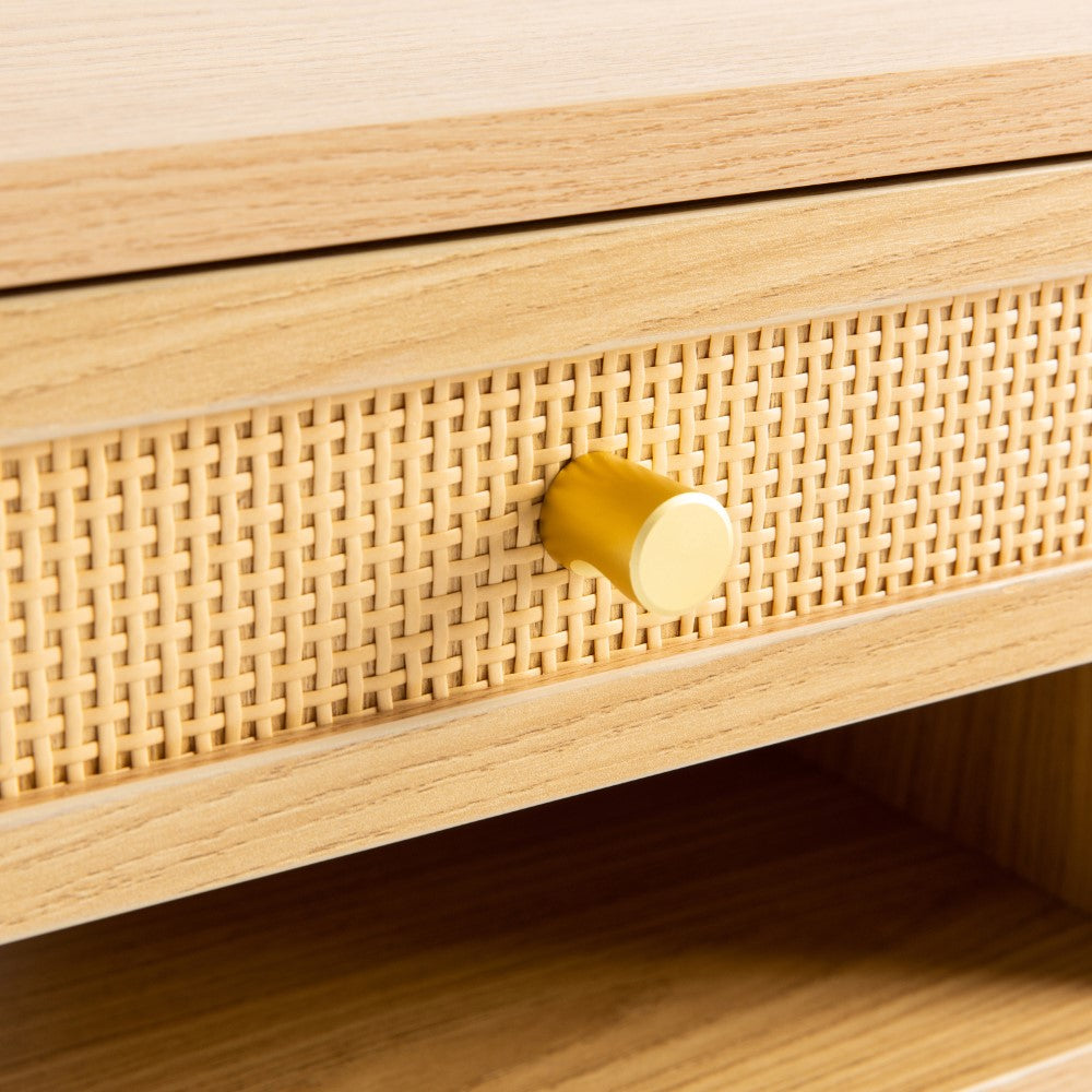 - Black laminate finish with a rattan drawer front in a light oak wood stain