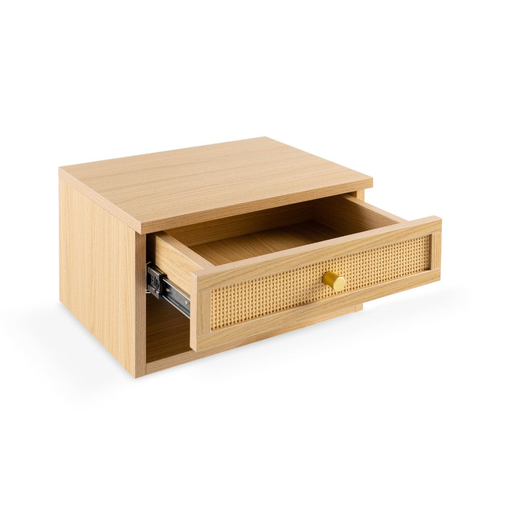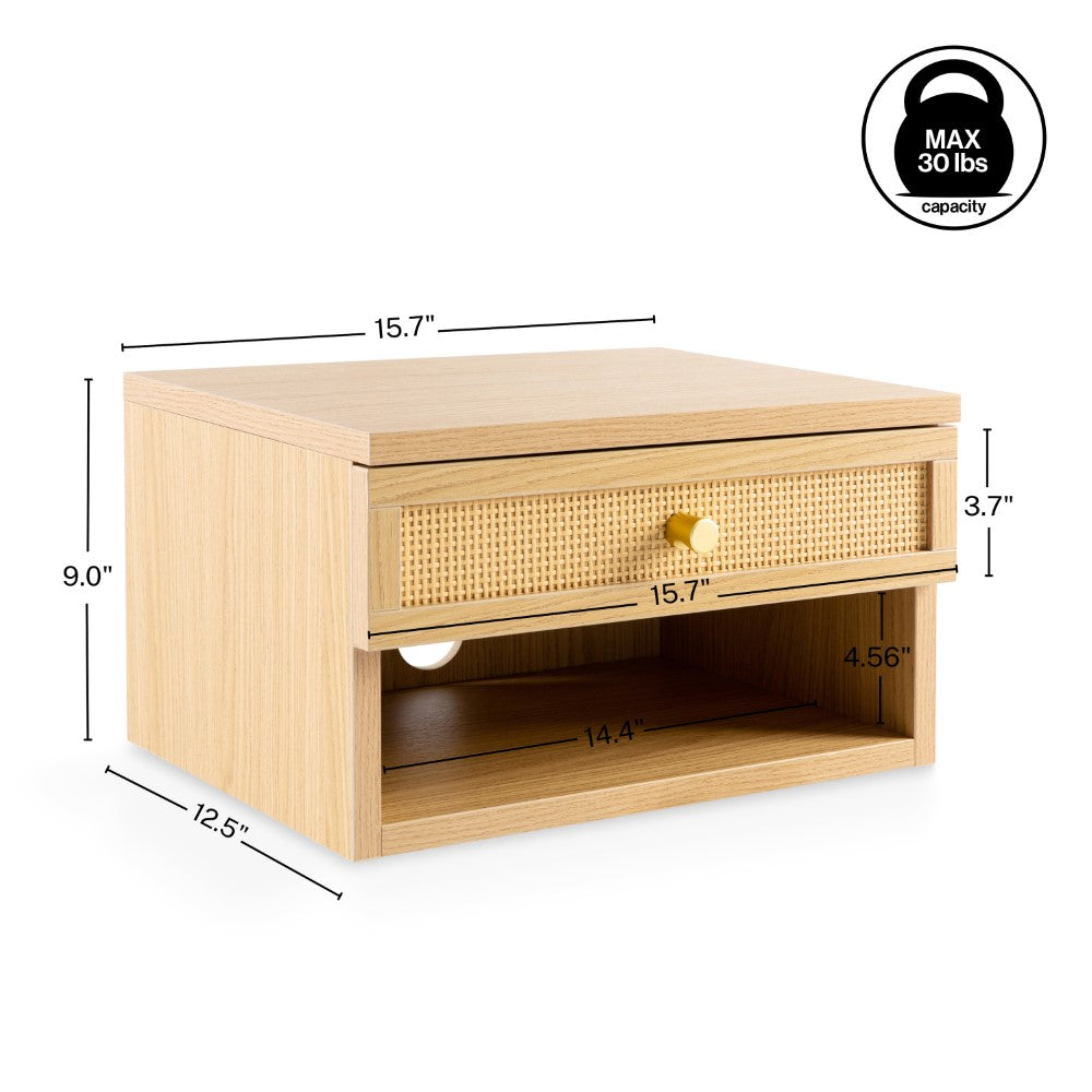 Laurel 15.71" Mid-Century Modern Floating Wall Mounted Nightstand with Soft-Close Rattan Drawer and Cable Hole