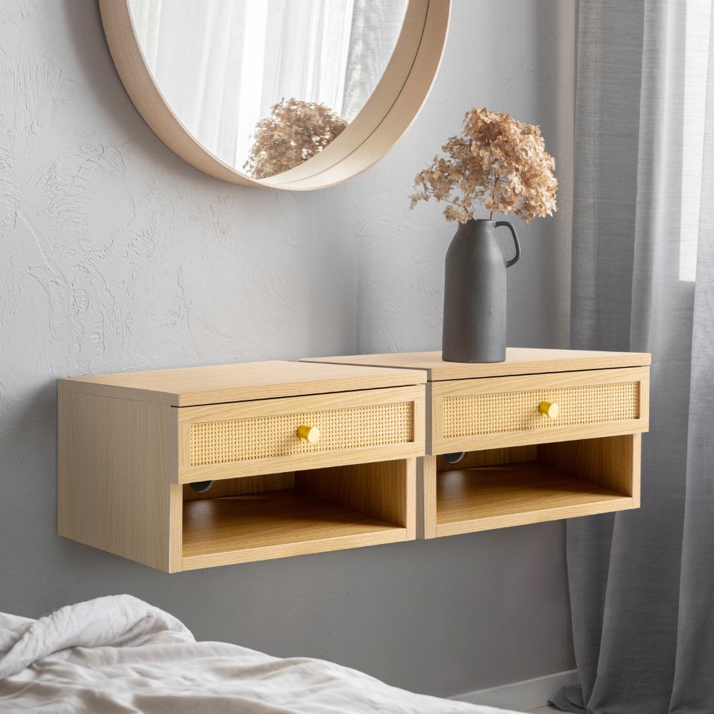 Update your bedroom and add convenient storage with our stylish floating nightstands. Inspired by mid-century designs, ours feature durable MDF construction accented by a single rattan-front drawer. Tuck one into a tight corner, or buy two for perfect symmetry.