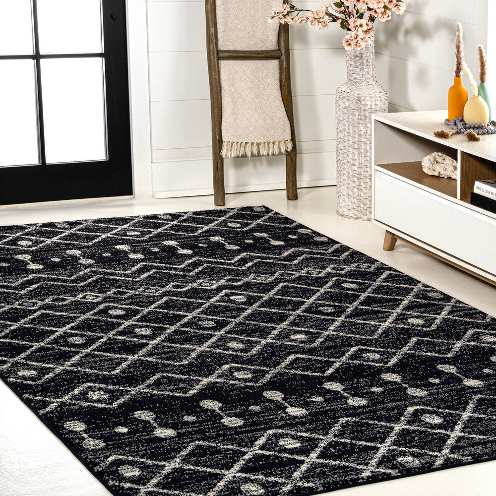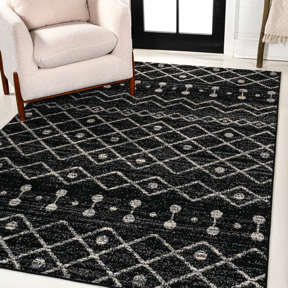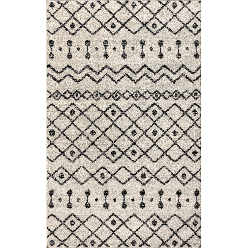 - The ivory and black color scheme reproduces the look of neutral, mid-century tribal rugs