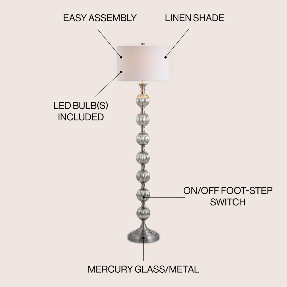 An elegant row of stacked glass fluted balls forms the base of this floor lamp, giving any reading nook or living area a polished look. A casual cotton shade keeps the shine casual, while the silk-wrapped cord adds an elegant touch. Operate the bulb with a simple foot-step switch for ease of use.