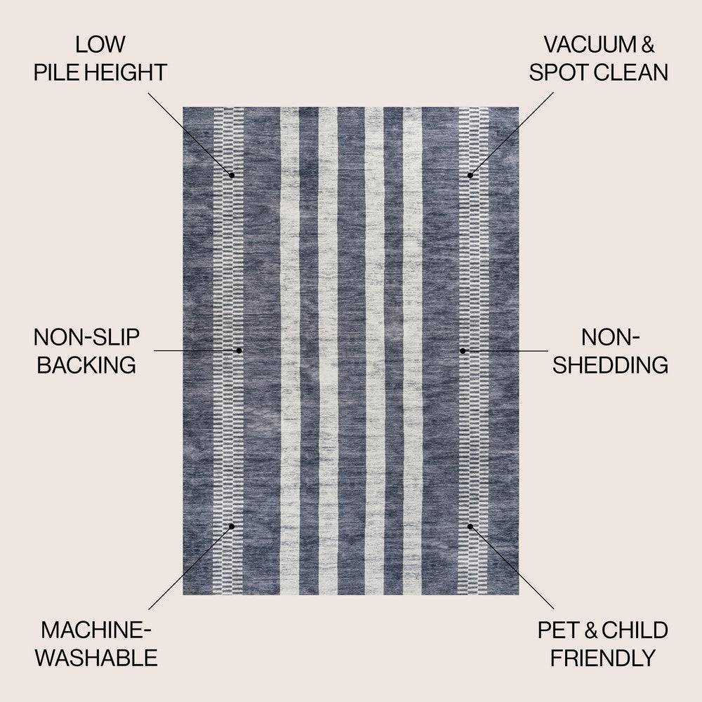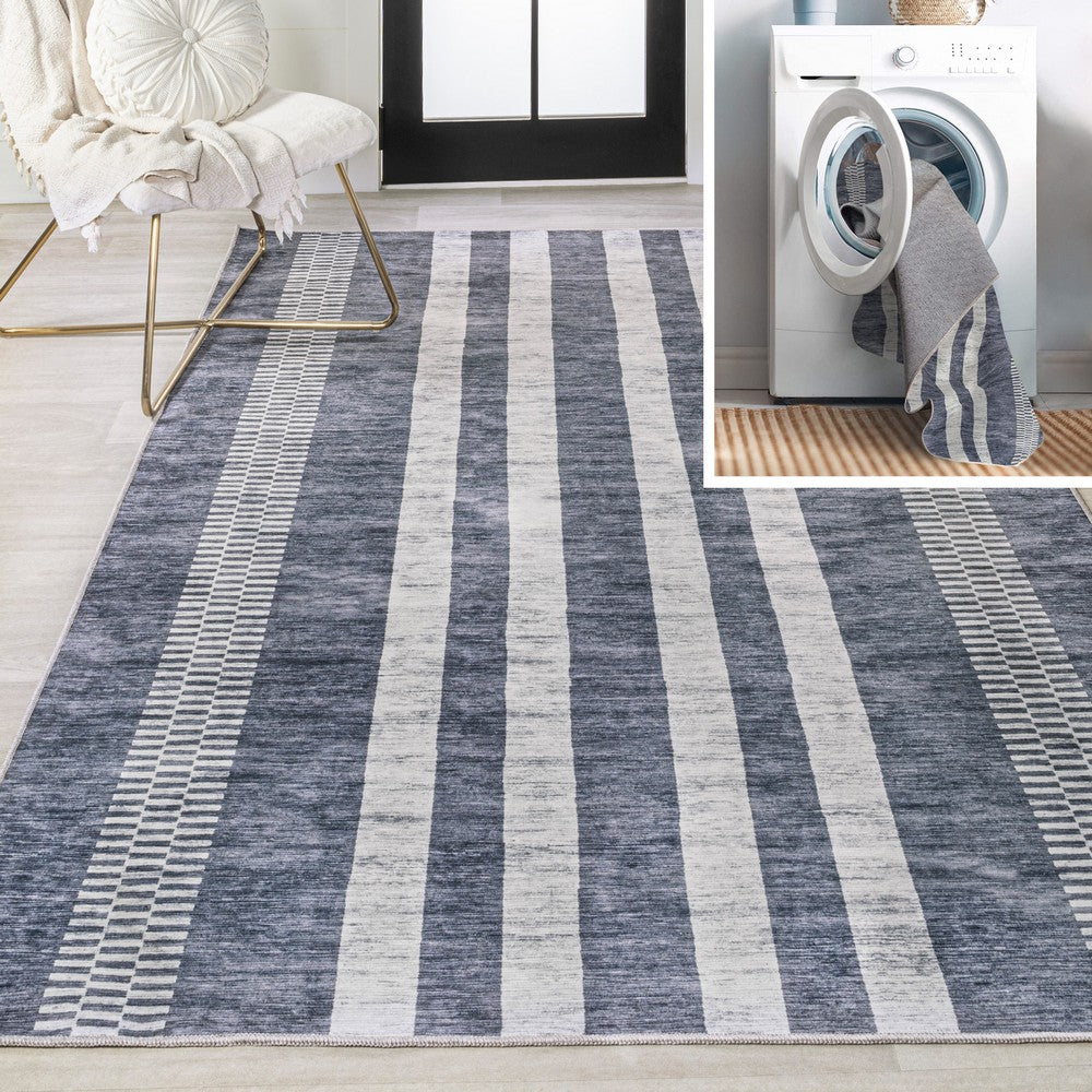 Our striped rug's geometric details add modern style to your mid-century ranch, farmhouse or city loft. The wide woven stripes have rectangular elements that add to the handcrafted look. This durable, machine washable rug adds graphic punch to a living room, dining room, bedroom, or kitchen.