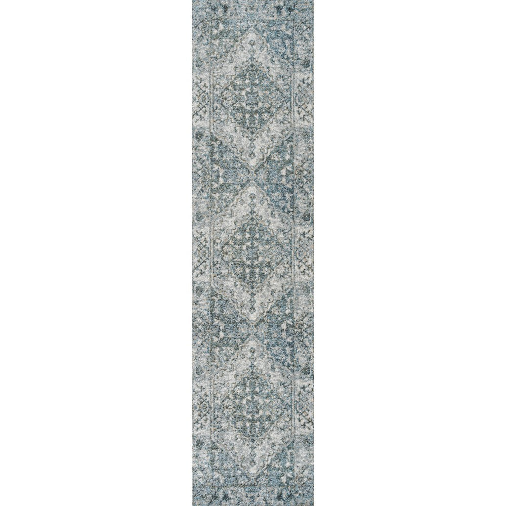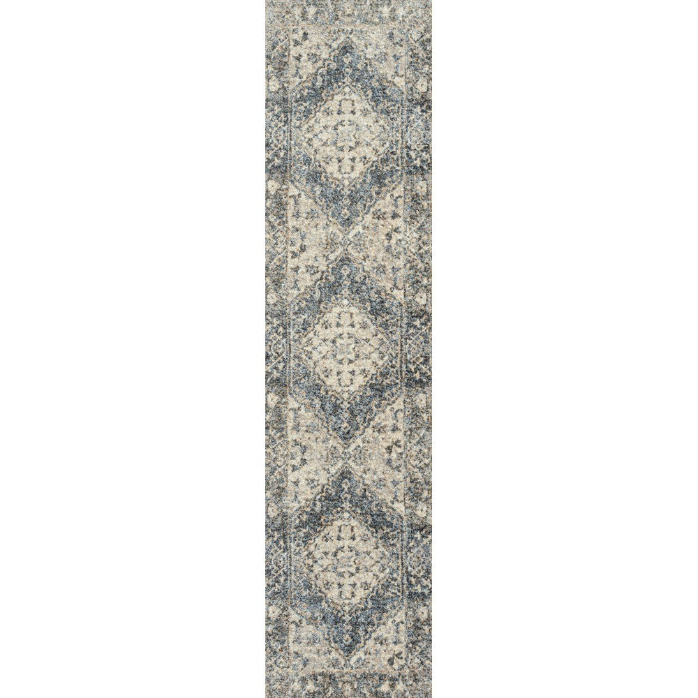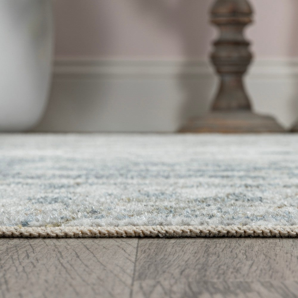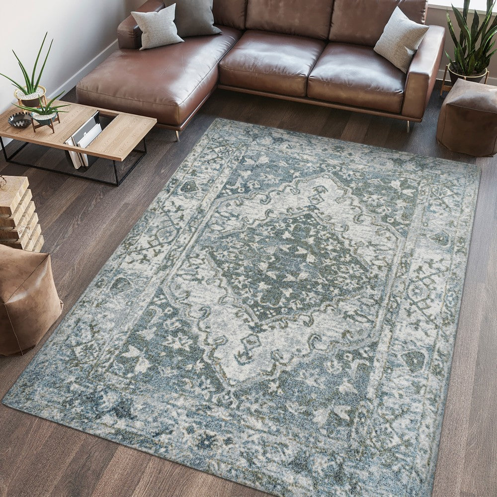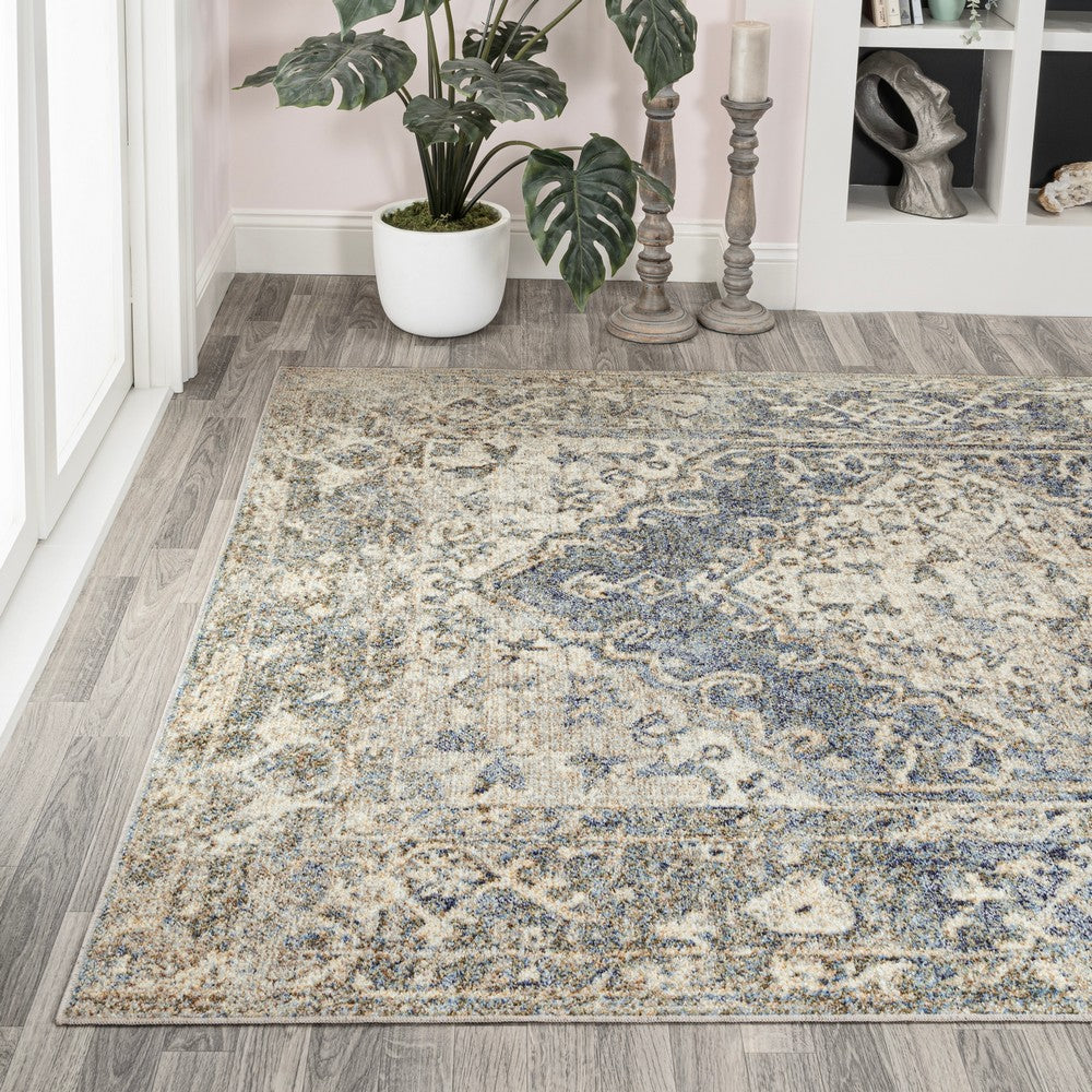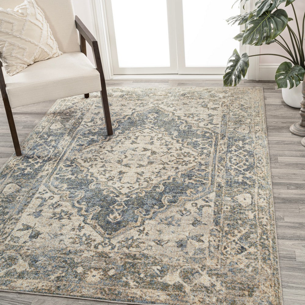 - A muted color palette of blues and creams creates a distressed medallion pattern