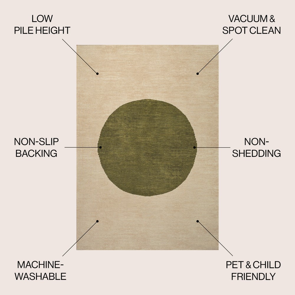 Inspired by Scandinavian design, our machine washable geometric rug has minimalist simplicity. The central circle design is woven in a modern, two-tone color palette. Add graphic punch to your living room, dining room, entry, or bedroom with this easy-care rug.