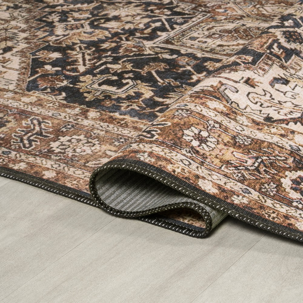 Our Persian chenille rug boasts a bold color palette and medallion design. This durable, machine-washable rug is a perfect addition for any busy family. This timeless rug enhances any mid-century or traditional home.