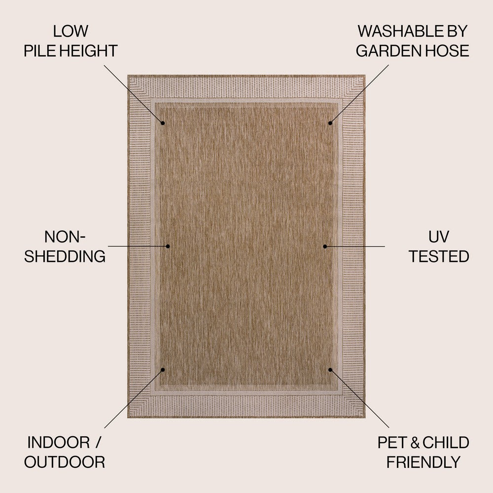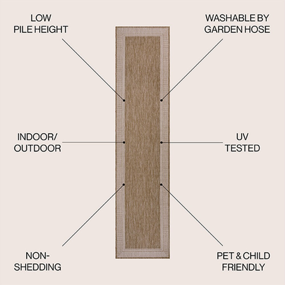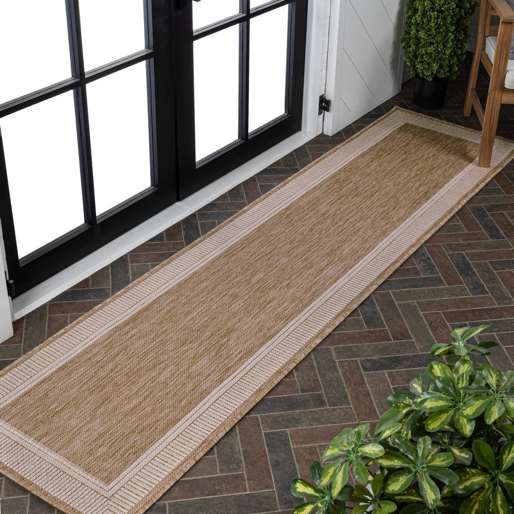 Our coastal border rug has a wide stripe around the edge with a plain center field. It's woven from durable synthetic fibers in a two-tone design. Use this easy-care, family-friendly rug on the porch or deck, or in high traffic spaces like a living room, dining room or entry.
