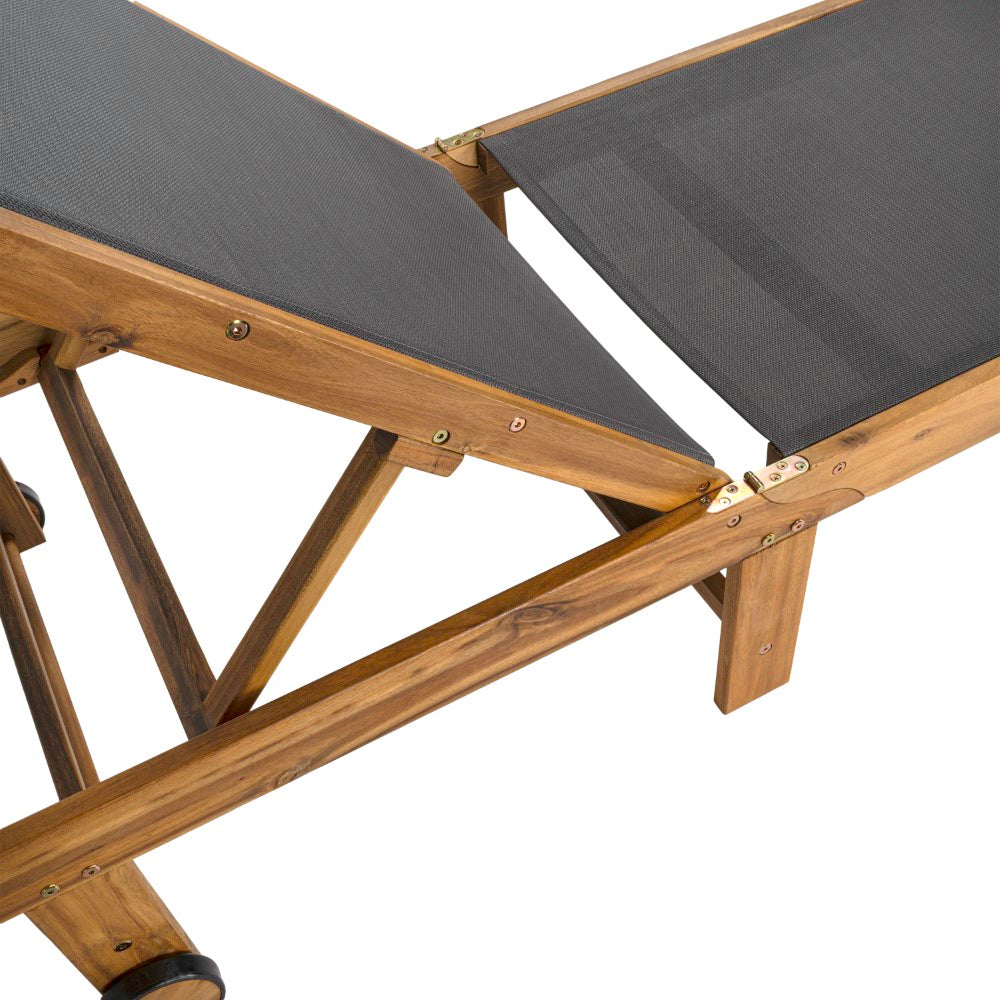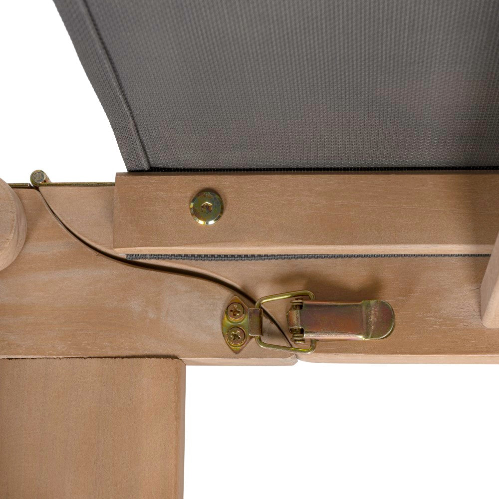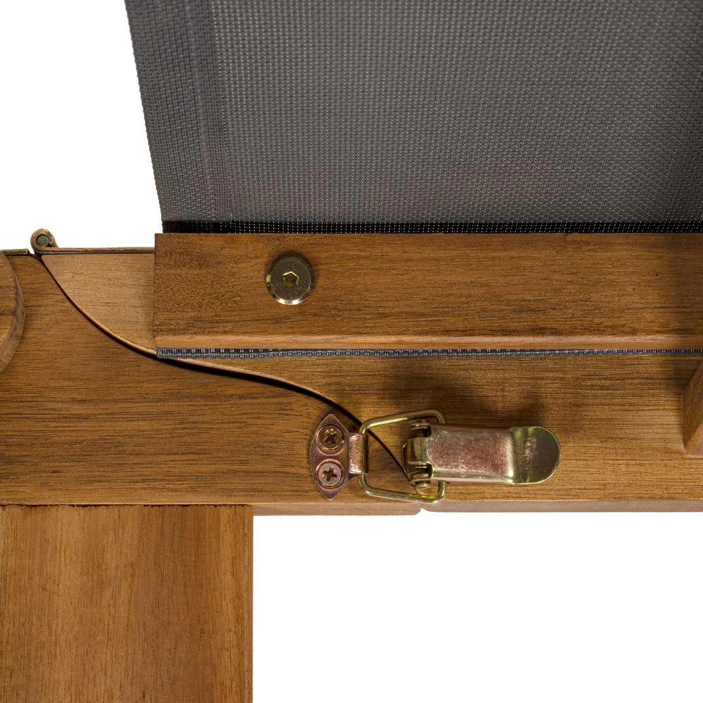 - Solid wood is treated with a teak oil finish for a natural wood look; fabric is outdoor Textile mesh in dark gray