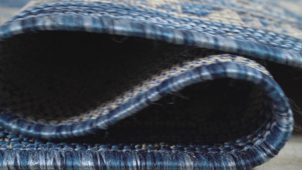 With its twining vines and ornate border, this traditional pattern is an elegant addition to your outdoor porch or patio. Varied tones of blue and navy mingled with a light gray pattern give this rug a rich, hand-woven texture. The flatweave design is great for high-traffic spaces indoors too.