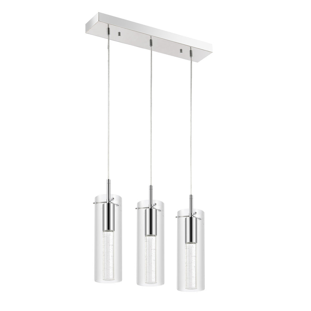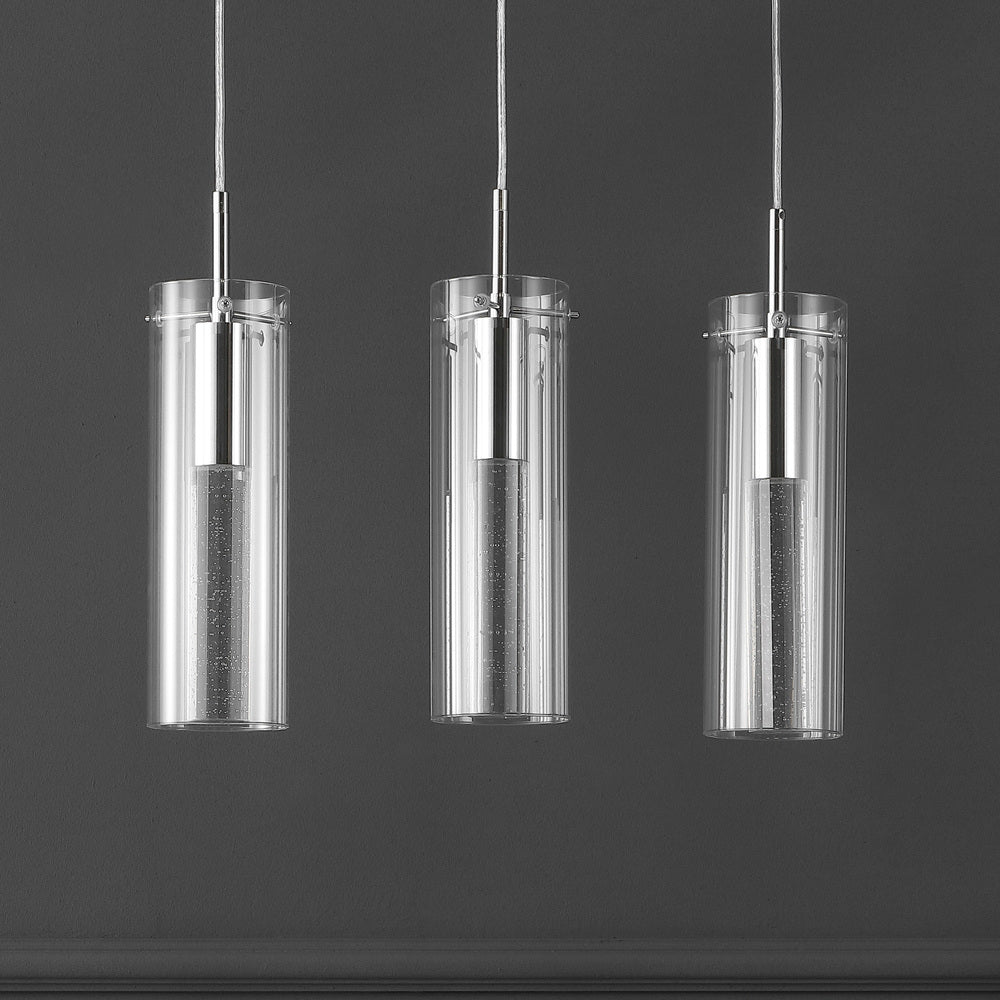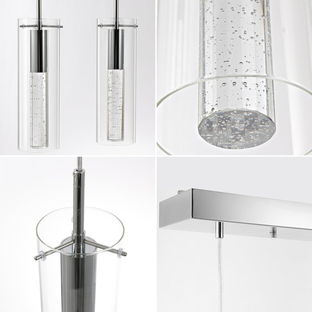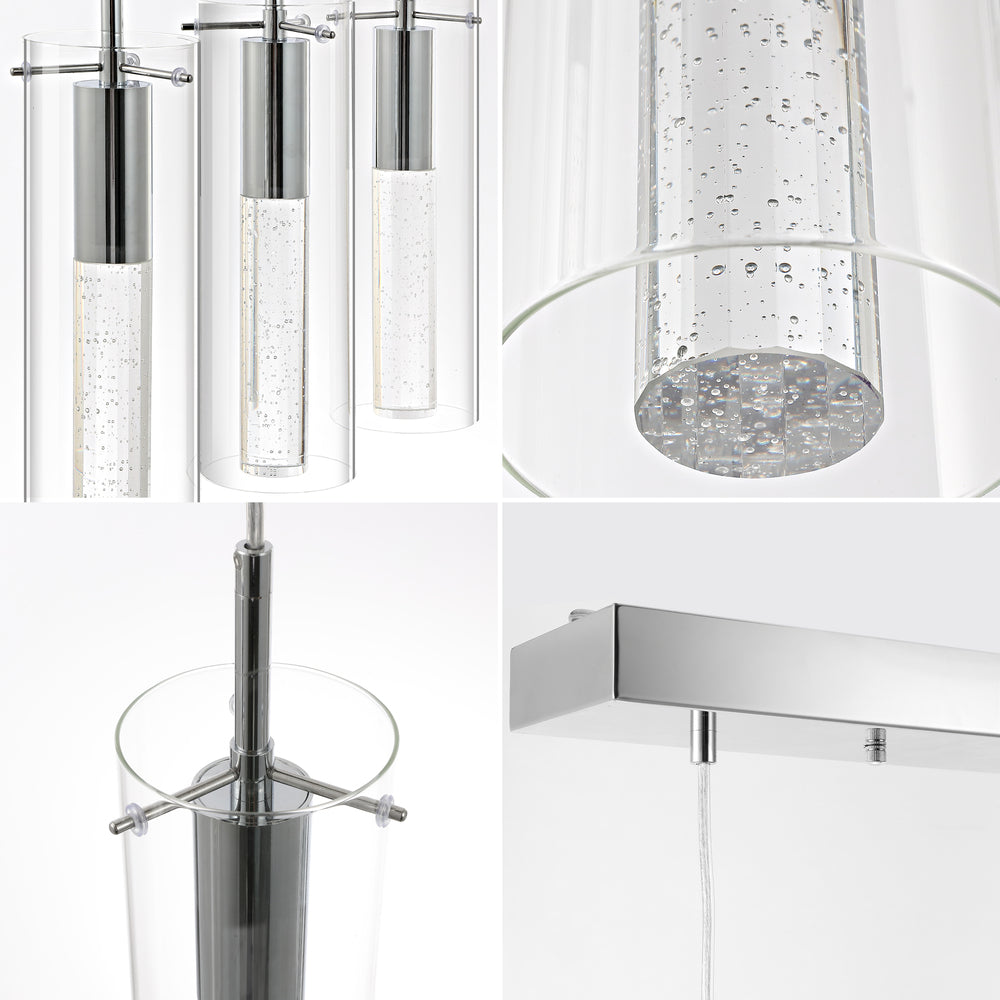 - This pendant light is crafted from clear glass cylindrical shades and a silver chrome frame