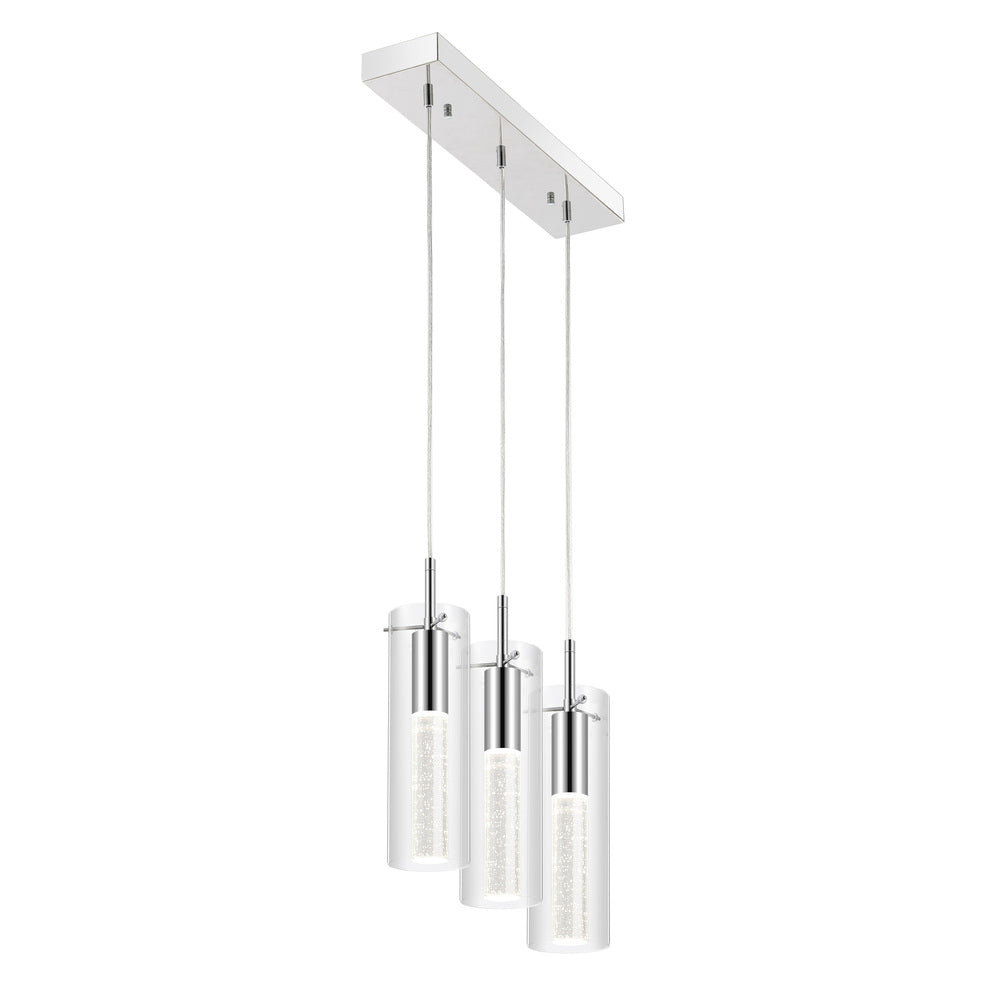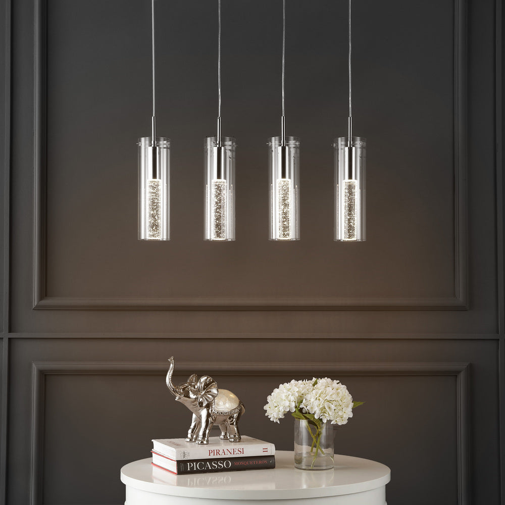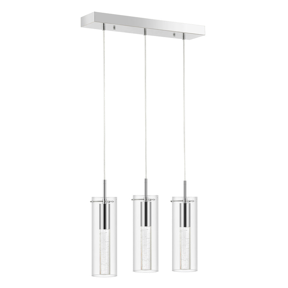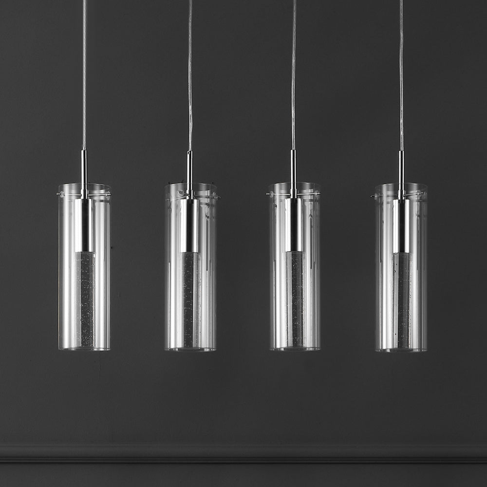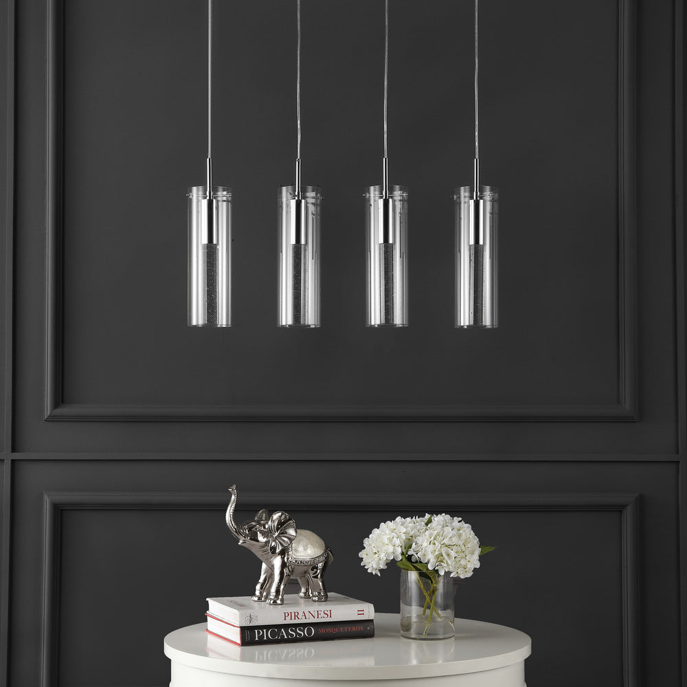 - This pendant light is crafted from clear glass cylindrical shades and a silver chrome frame