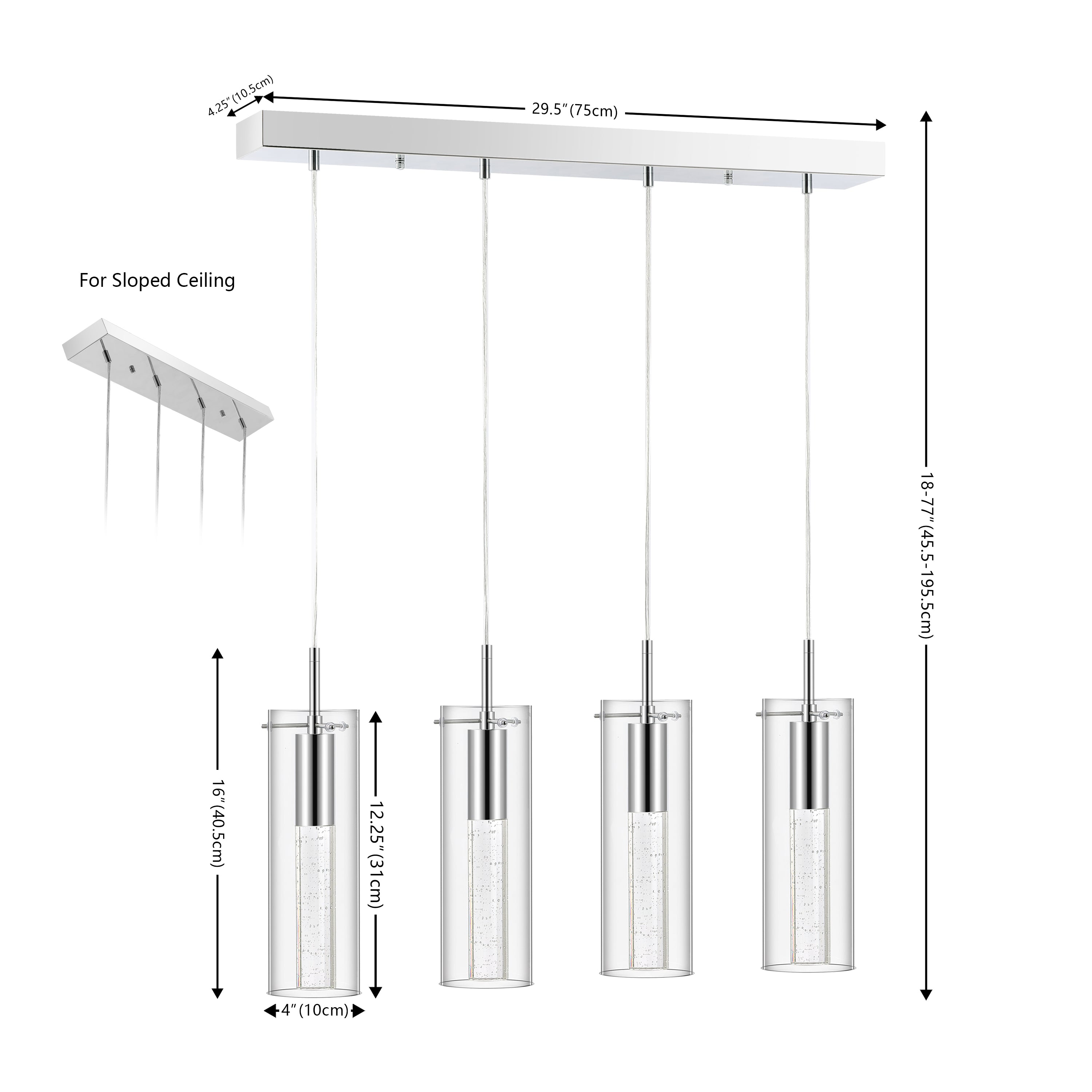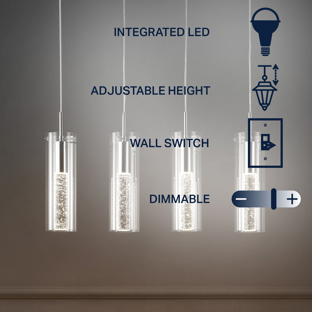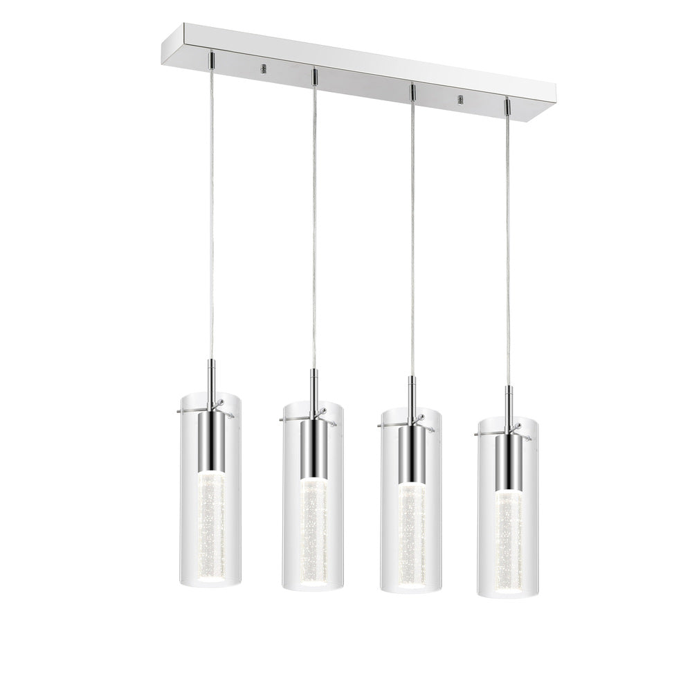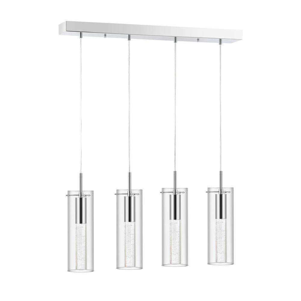 - This pendant light is crafted from clear glass cylindrical shades and a silver chrome frame